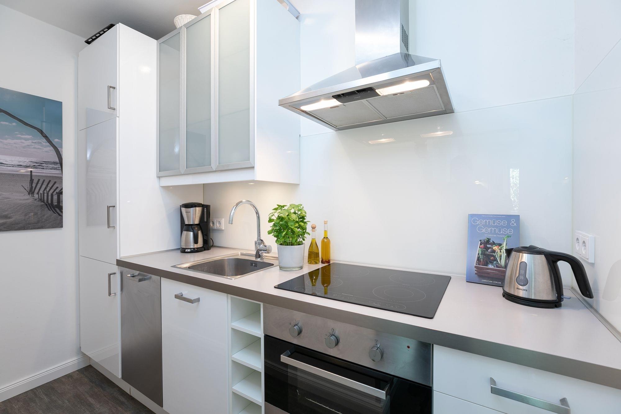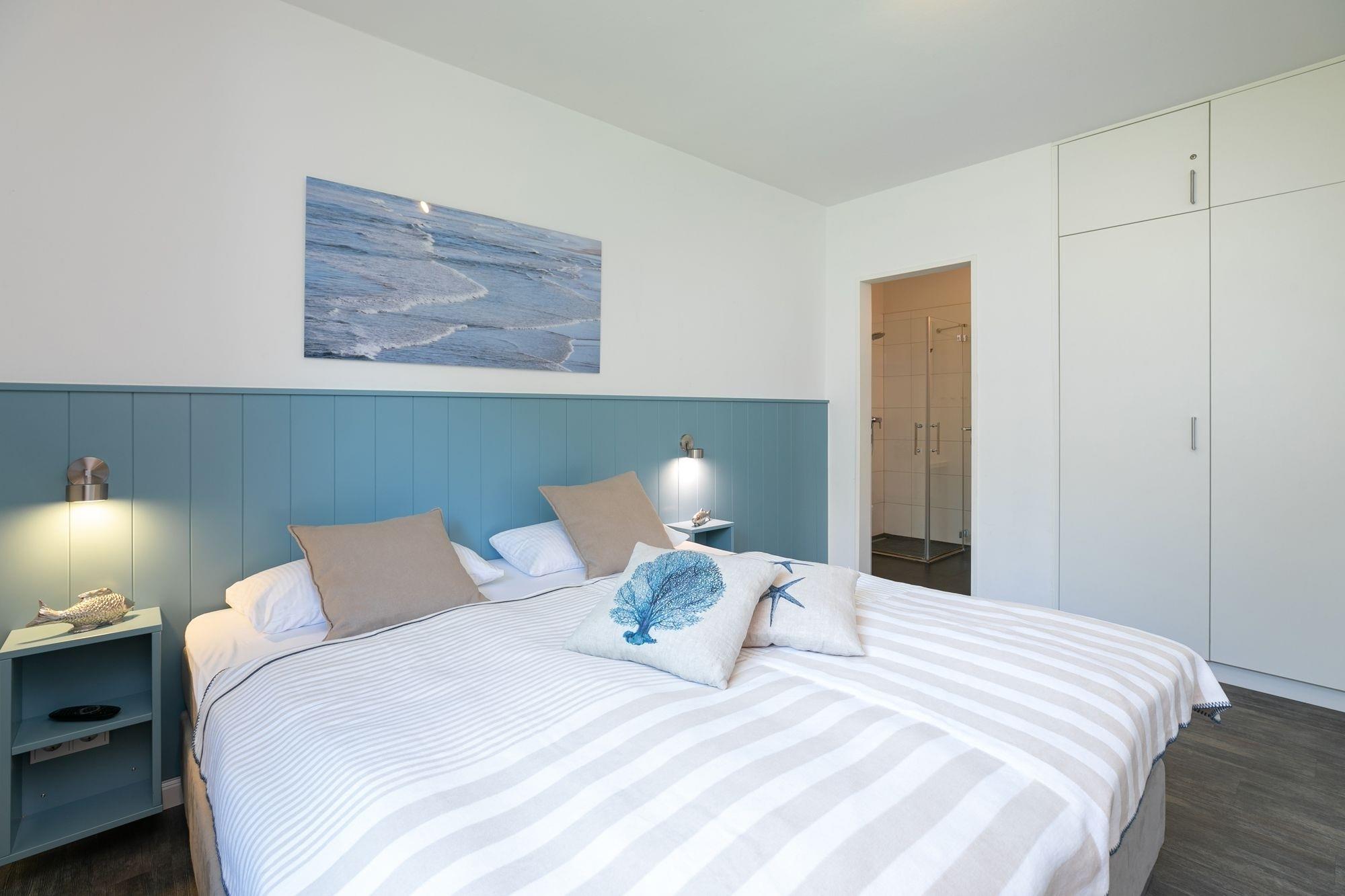 Der großzügige und lichtdurchflutete Wohnbereich mit gemütlichem Essplatz und offen angrenzender Küche ist das Herzstück dieses schönen Feriendomizils. Die moderne Küche ist offen gestaltet und perfekt in den Wohnbereich integriert, sie bietet alles, was Hobby-Koch-Herzen höher schlagen lässt. Starten Sie Ihren Tag mit einem heißen Kaffee auf der kleinen gemütlichen, möblierten Terrasse, die Sie vom Wohnbereich aus erreichen. Im separaten Schlafzimmer mit komfortablem Doppelbett (2x 90x200 cm) und einem zusätzlichem Flat-TV finden Sie ausreichend Platz für Ruhe und Erholung. Ihre Urlaubsgarderobe verstauen Sie problemlos in einem großen Wandschrank. Das Badezimmer überzeugt im modernen Stil mit einer ebenerdigen Dusche und ist vom Schlafzimmer aus zu erreichen. Das zweite Schlafzimmer verfügt über ein bequemes Einzelbett (80x200 cm). Eine Kommode bietet zusätzlichen Stauraum für Kleidung und Gepäck.