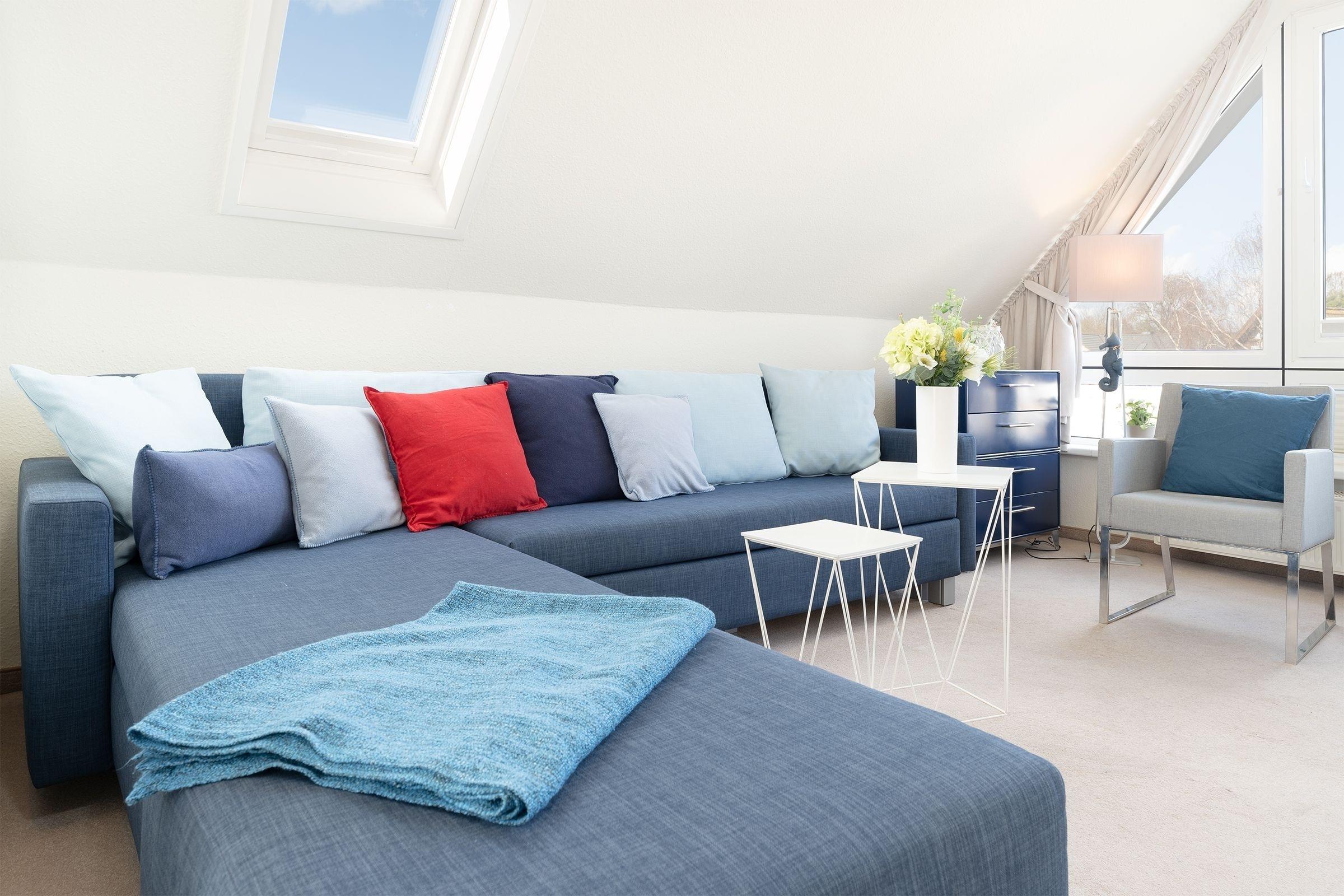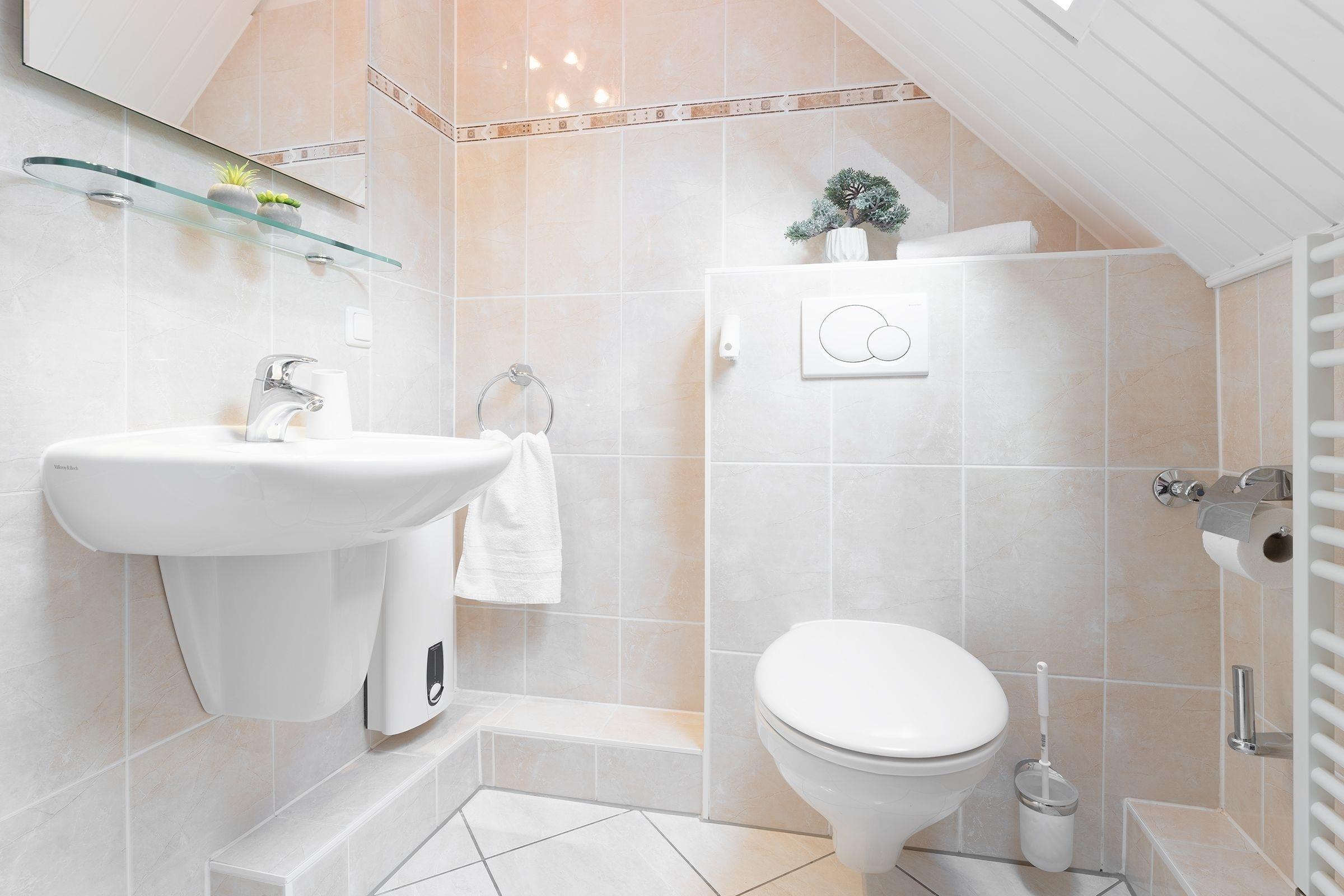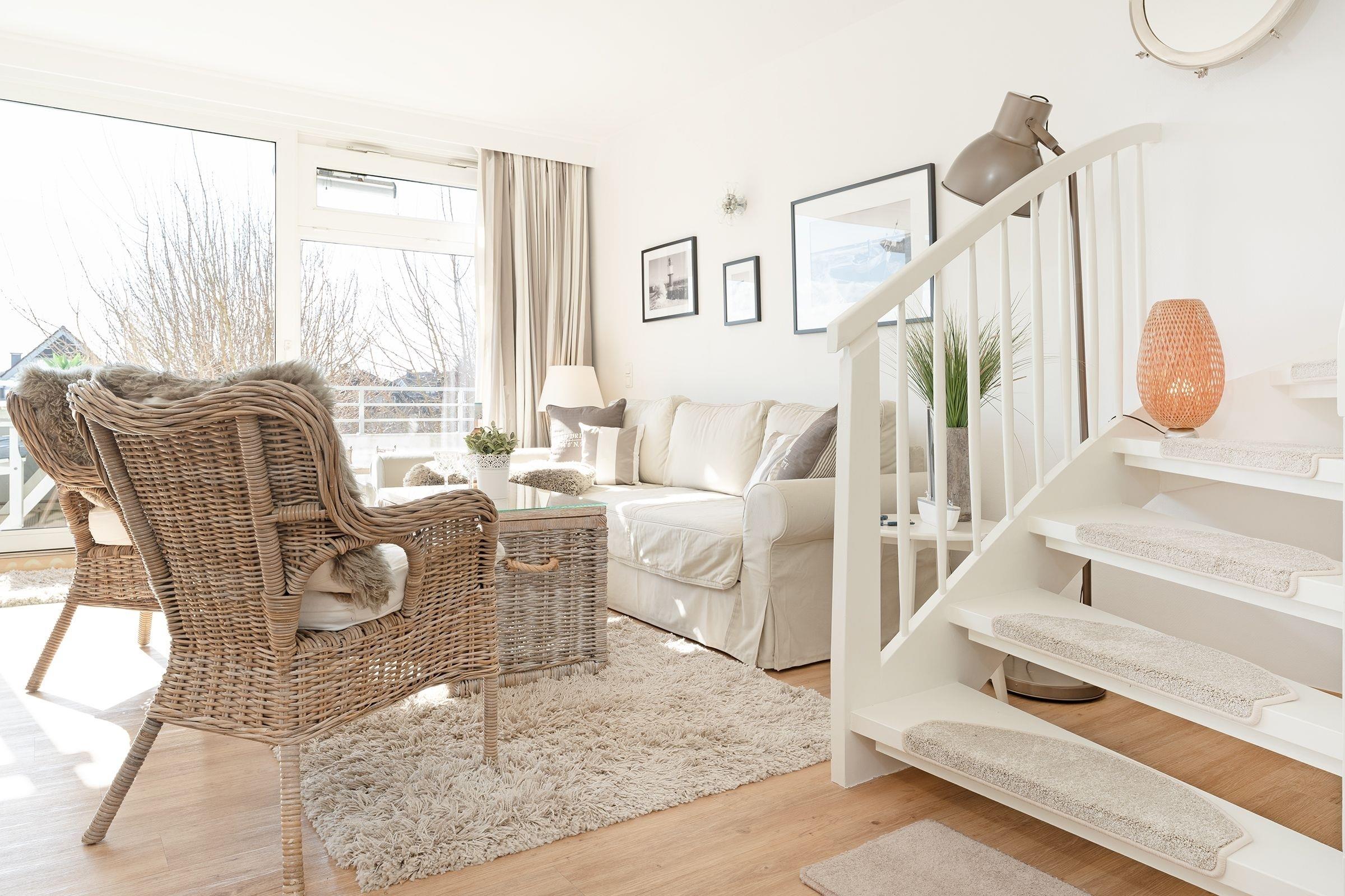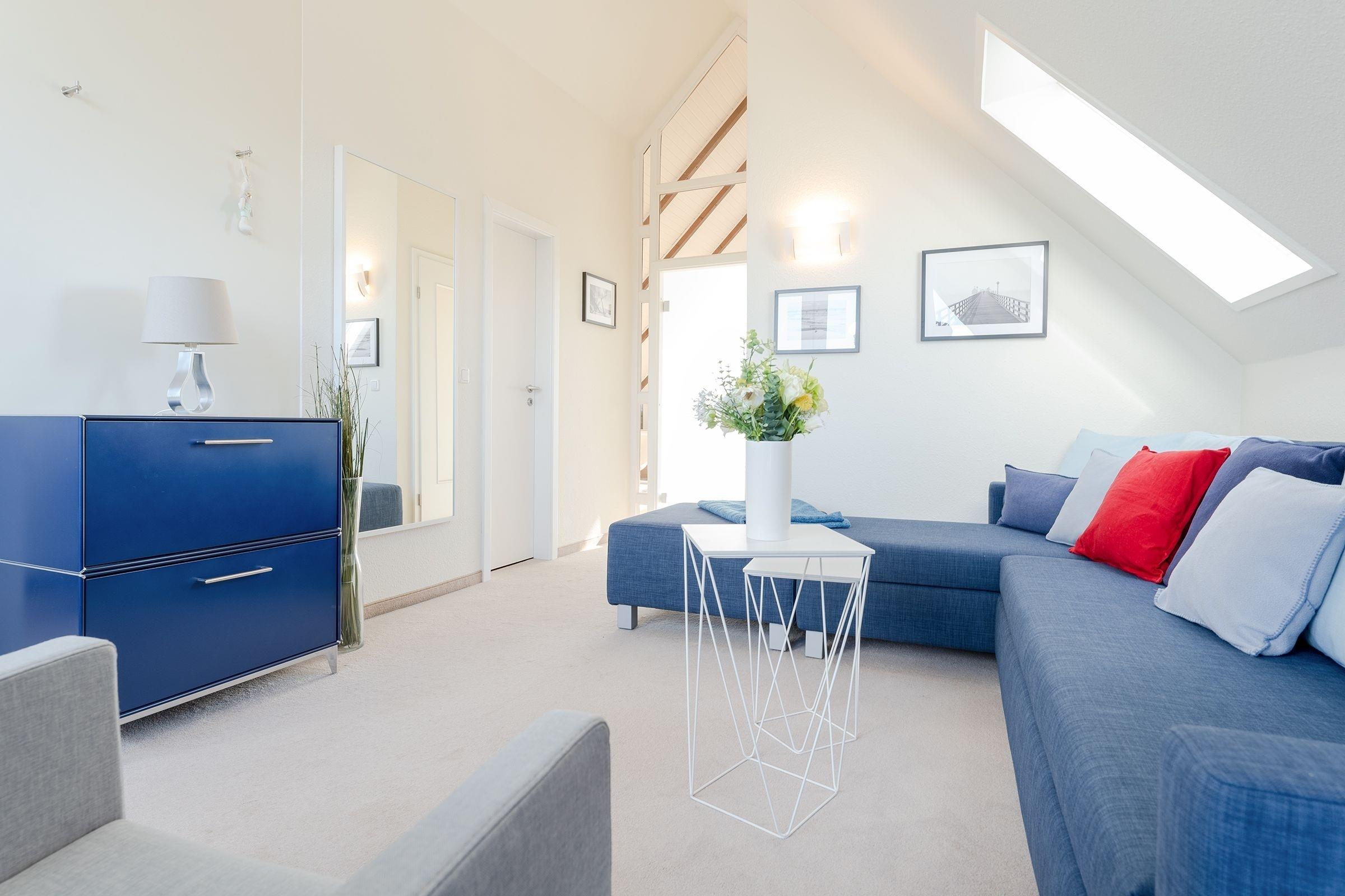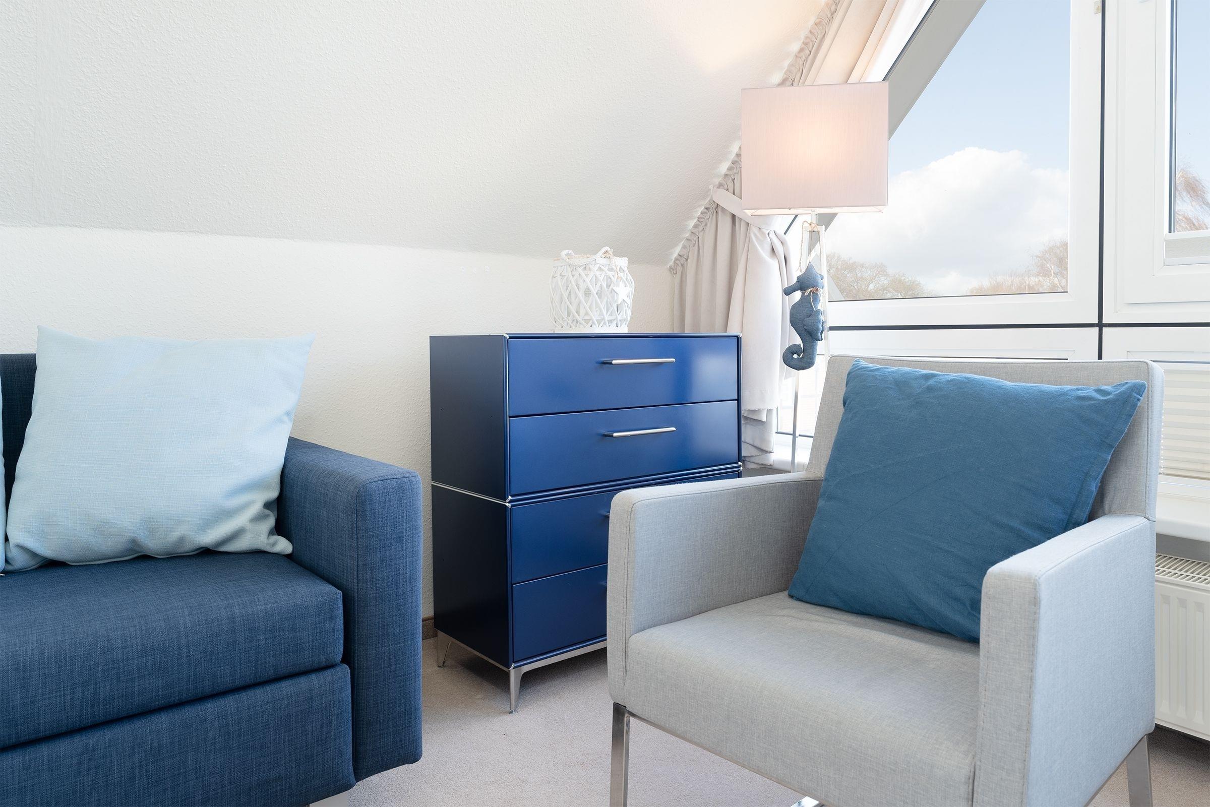 Über eine geschwungene Wendeltreppe gelangen Sie vom Wohn-/Essbereich in die obere Etage, hier befinden sich ein zweiter lichtdurchfluteter Wohnraum mit komfortabler Wohnlandschaft. Zudem gibt es hier ein weiteres Badezimmer mit Dusche, WC und Handtuchheizung. Das zweite geräumige Schlafzimmer mit seinen großen Fensterflächen bietet einen zauberhaften Ostseeblick, ein gemütliches Doppelbett (2x 90x200 cm) für erholsamen Schlaf und einen zusätzlichen Flat-TV. Hier erwartet Sie zudem ein wohl einzigartiges Highlight: eine freistehende Badewanne!