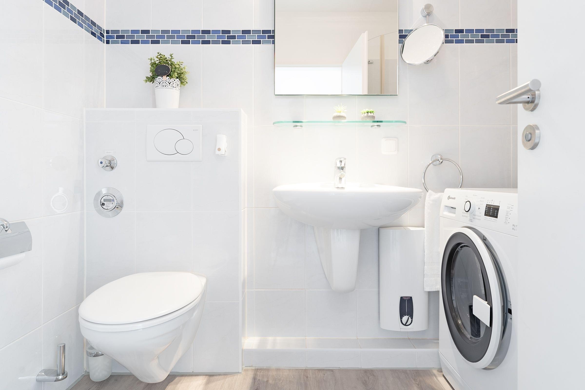 In der ersten Etage befindet sich das Herzstück der Wohnung: das offen gestaltete Wohn-/Esszimmer mit gemütlichem Interieur im zeitlosen Skandi-Chic. Hier laden ein bequemes Ecksofa und ein Flatscreen-TV bei jeder Witterung zu lauschigen Abenden ein, der Esstisch bietet Raum für gesellige Runden und die großzügige Fensterfront ermöglicht einen traumhaften Ausblick. Auf Ihrem großen, möblierten Balkon genießen Sie zahlreiche Sonnenstunden und beobachten das bunte Treiben am Grömitzer Yachthafen. Die separate Küche ist modern und hochwertig ausgestattet. Auf dieser Etage befindet sich auch das erste der beiden Schlafzimmer, ausgestattet mit weißem Holz-Etagenbett (Matratzen je 100x200 cm), sowie geräumigem Kleiderschrank. Das Badezimmer verfügt neben einer Dusche und WC über einen kombinierten Wasch-Trockner.