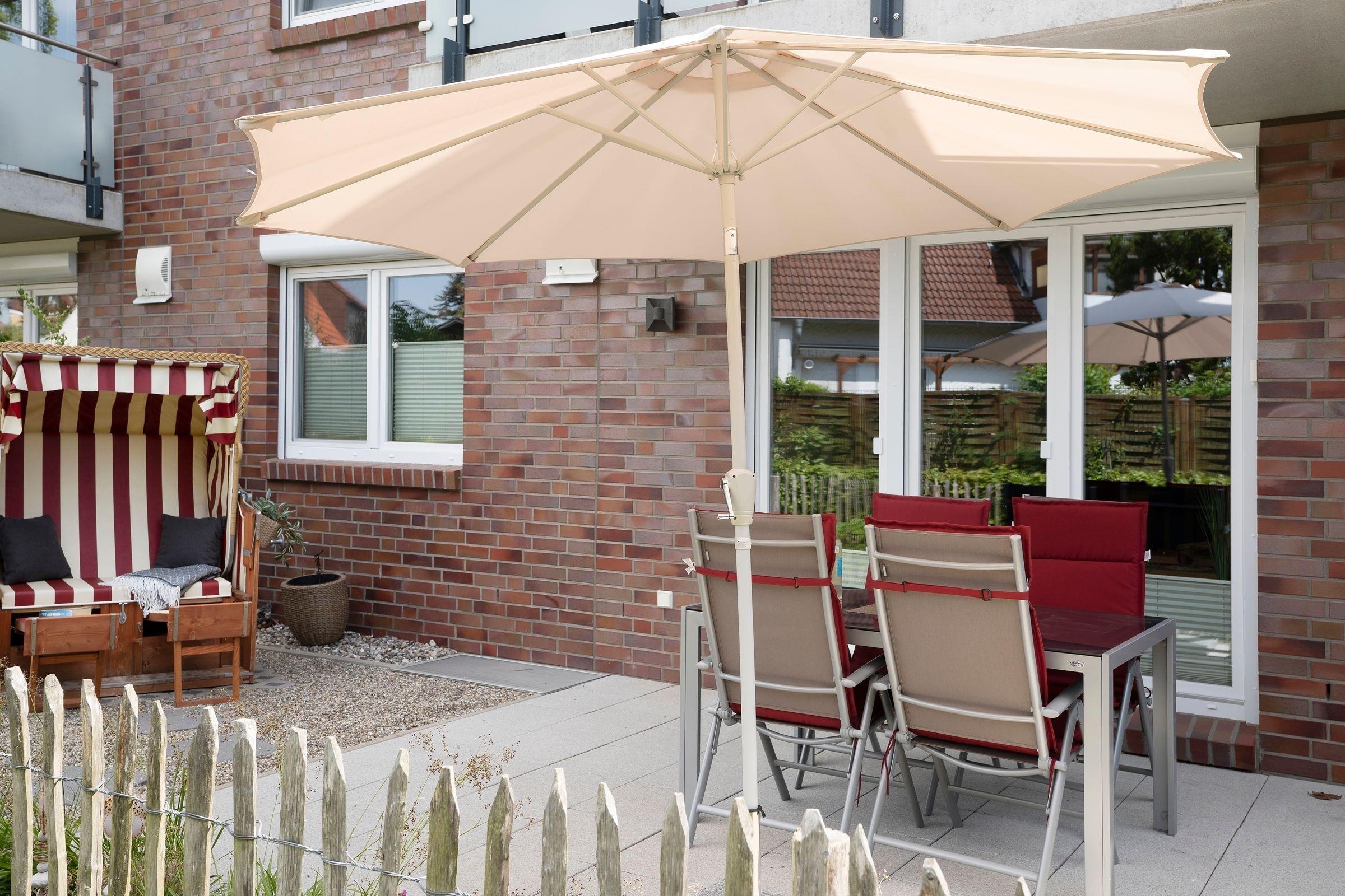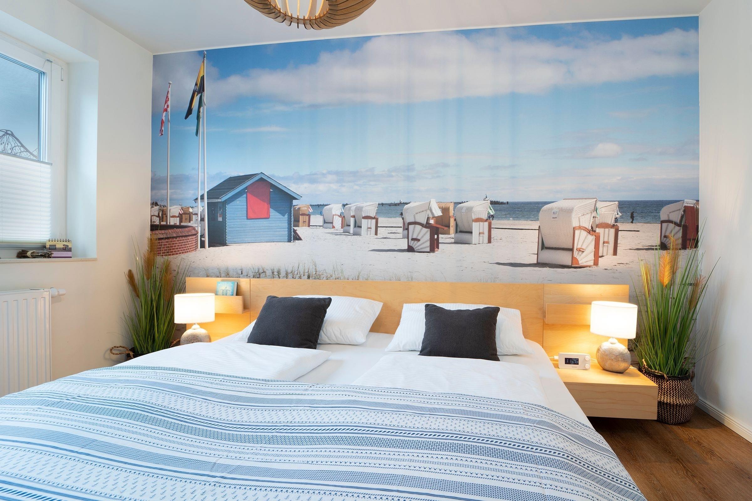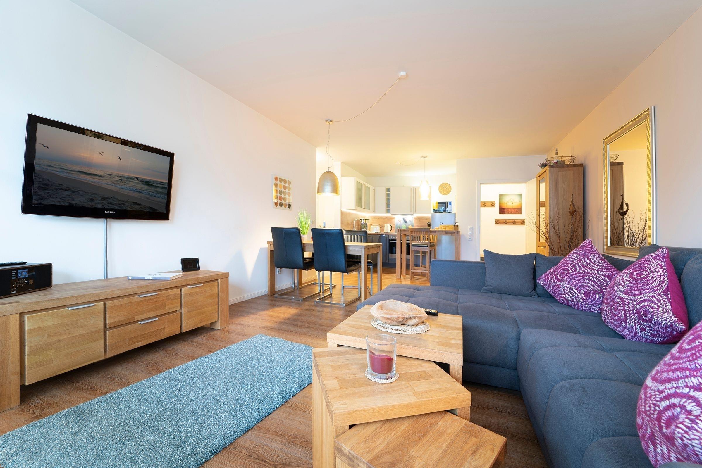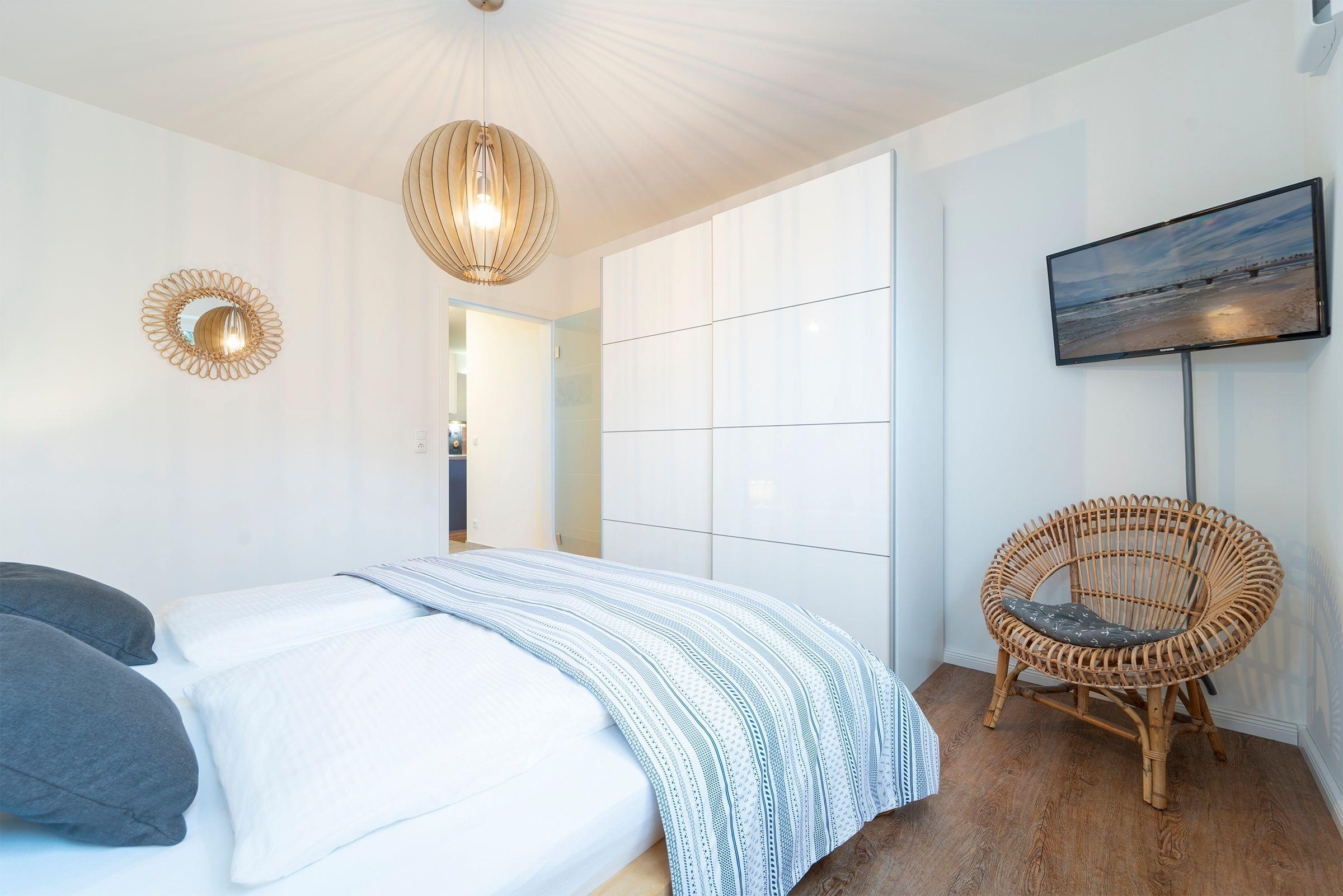 Im Wohnbereich finden Sie eine hochwertiges Schlafsofa (180x200 cm) für 2 Personen sowie einen großen Flachbildfernseher. Internetradio und DAB sind hier selbstverständlich. Im Schlafzimmer finden Sie ein weiteres TV Gerät, ein bequemes Doppelbett (2x 90x200 cm) und einen Kleiderschrank für Ihre Garderobe. Ein modernes Badezimmer, mit einer geräumigen ebenerdigen Dusche, beheizbarem Handtuchhalter, Föhn und Fußbodenheizung erwartet Sie. Es gibt einen direkten Zugang vom Wohn-/Essbereich zur möblierten Terrasse mit eigenem Strandkorb. In der gesamten Wohnung stehen Ihnen elektrische Außenjalousien zur Verfügung.
