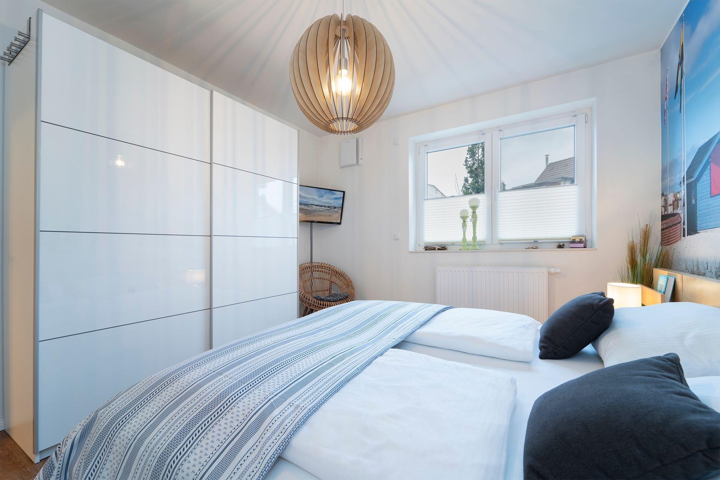 Schlafzimmer: 1 Doppelbett (2x 90x200 cm), Kleiderschrank, TV, Verdunkelung (elektr. Außenjalousien)