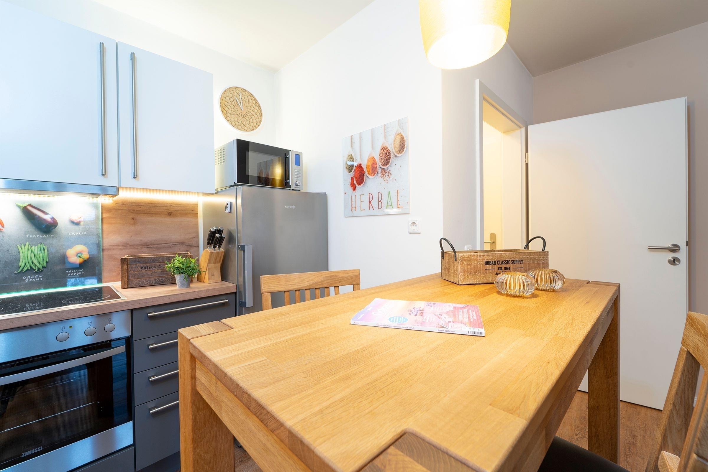 Eine Wohnung mit Wohlfühlfaktor erwartet Sie. Sie werden sich vom ersten Moment an wie zu Hause fühlen. Freuen Sie sich auf einen großzügigen Wohn-/Essraum mit integrierter voll ausgestatteter Küchenzeile, einem Esstisch mit 4 Stühlen und einem zusätzlichen Thekentisch mit 2 Barstühlen.