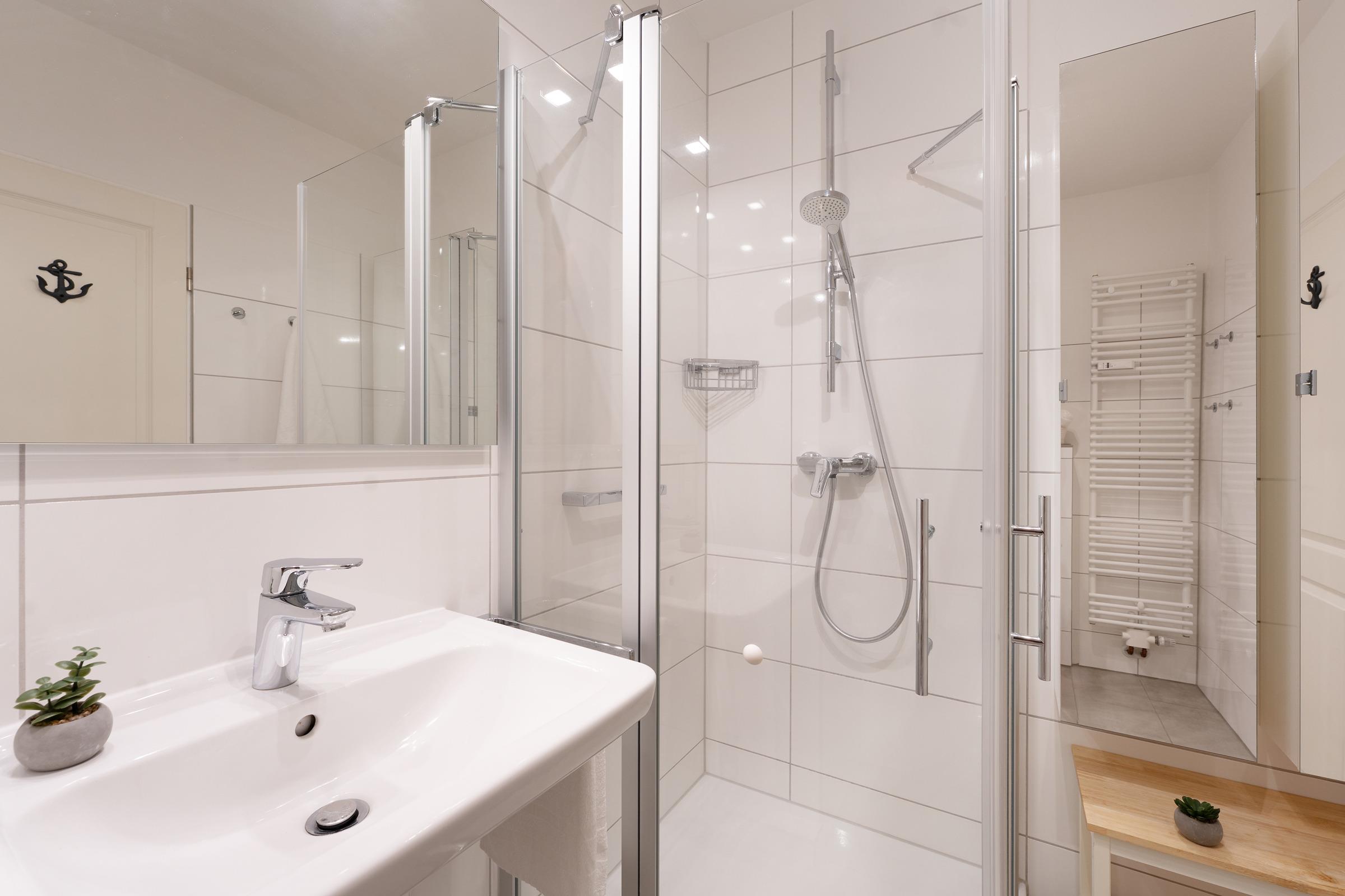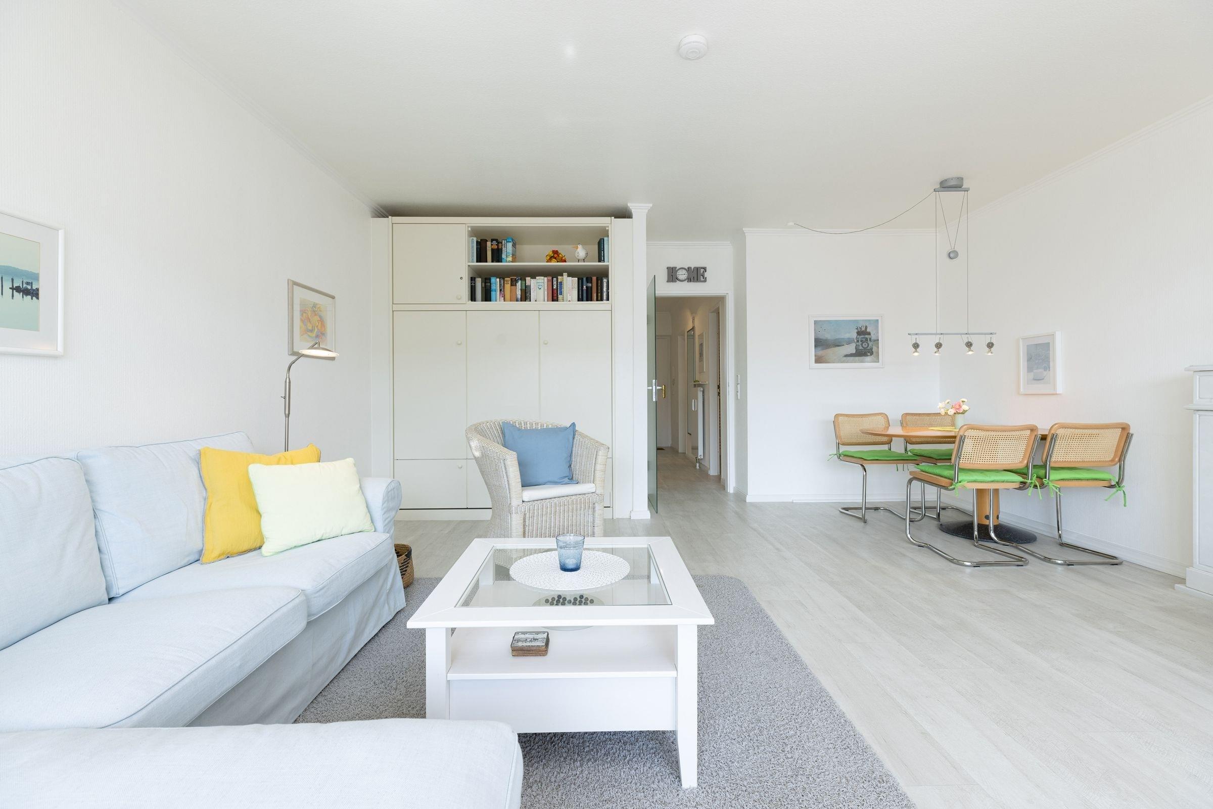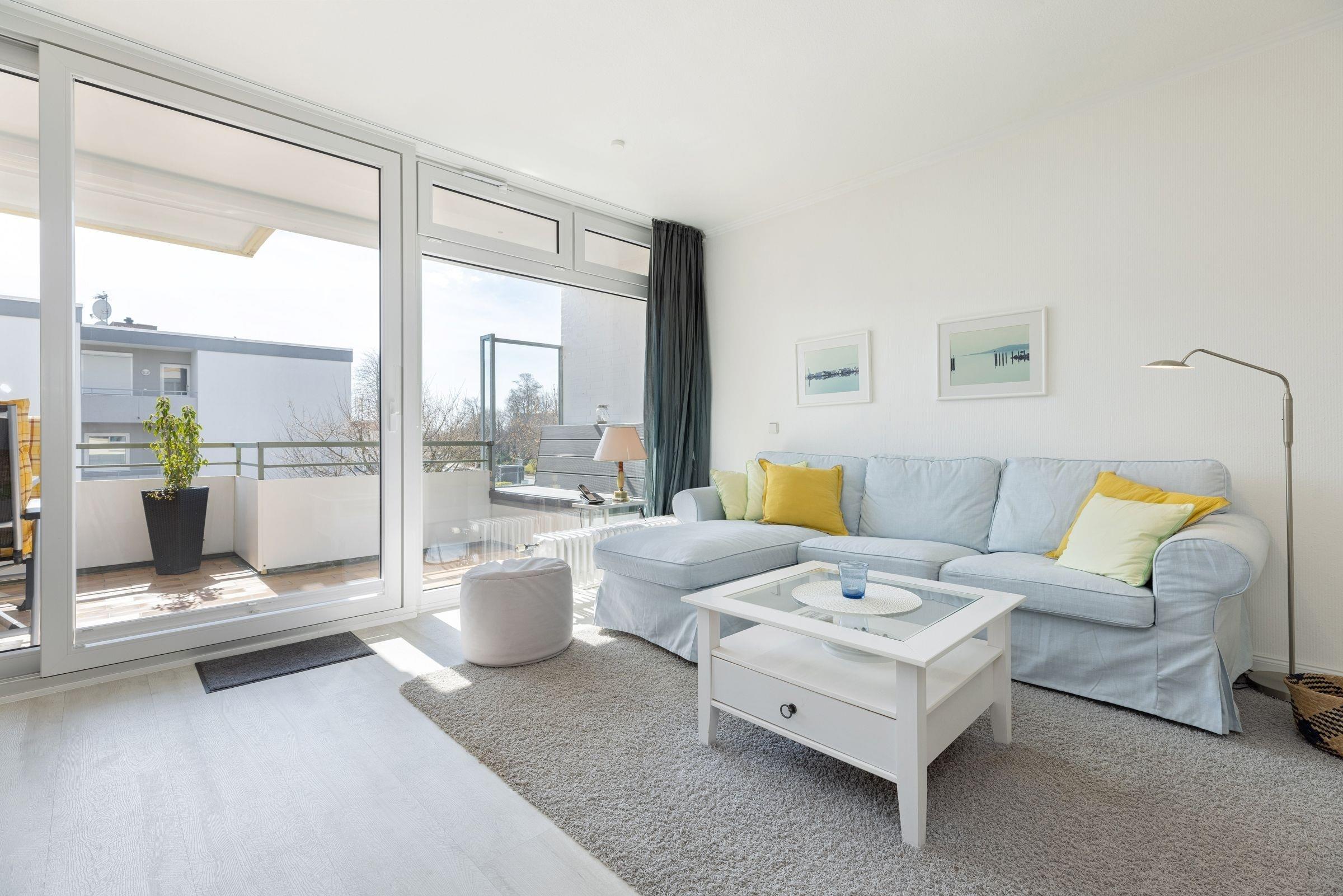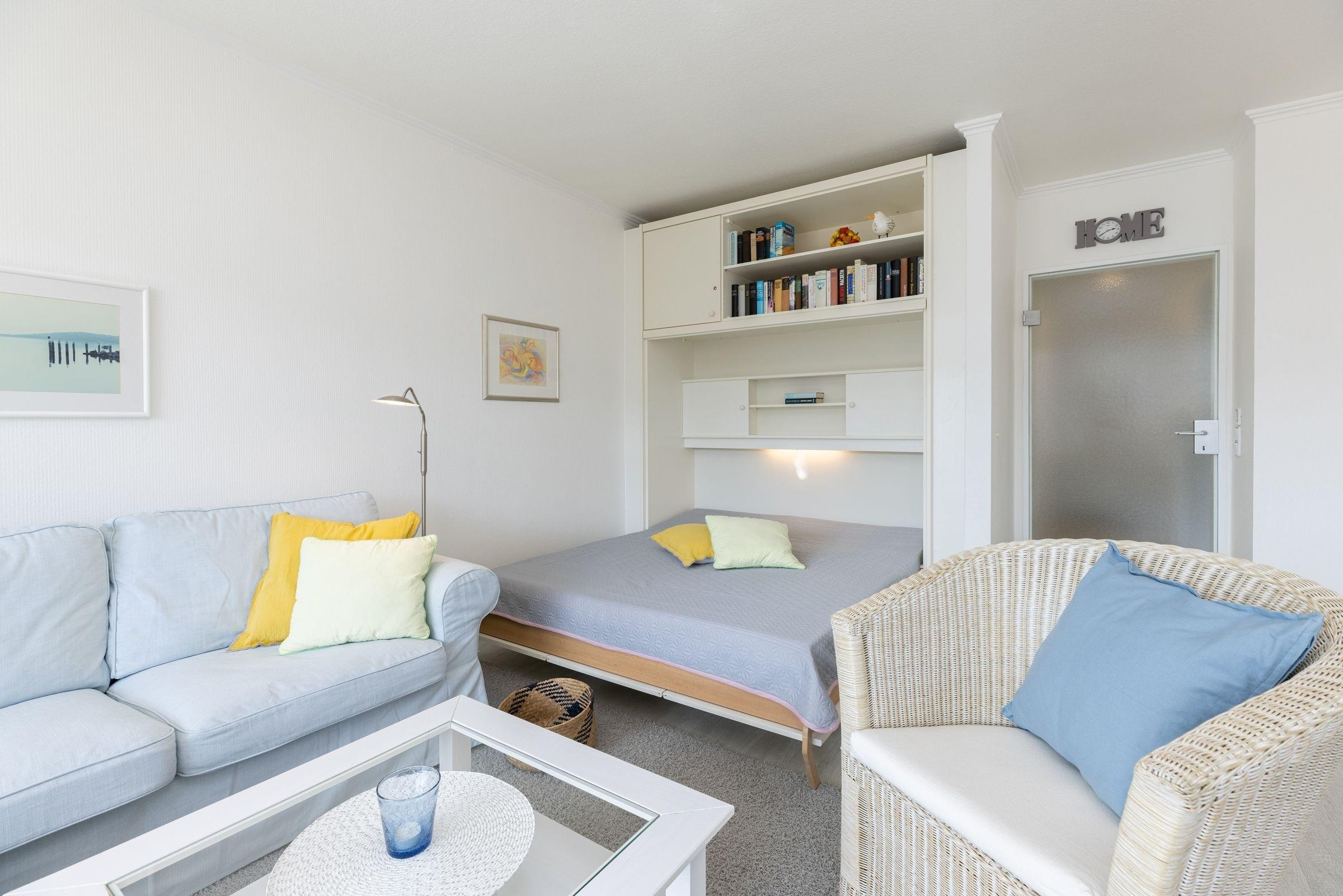 Der offene Wohn-/Schlafbereich empfängt Sie lichtdurchflutet und mit harmonischem Interieur im maritimen Landhausstil. Ein hochwertiges Schrankbett bietet hier eine bequeme Schlafmöglichkeit für bis zu 2 Personen (2x 80x200 cm). Eine gemütliche Fernseh-Ecke mit komfortablem Ecksofa , Sessel, Flachbild-TV und einem heimeligen Dekokamin sorgen nach langen Strandtagen für geruhsame Stunden. Der angrenzende Essbereich ist für bis zu 4 Personen ausgerichtet und bietet Platz für gesellige Mahlzeiten. Ein direkter Zugang führt vom Wohnzimmer auf den möblierten Balkon mit West-Ausrichtung und seitlichem, saisonalen Meerblick. Von der charmanten Eckbank schauen Sie durch Baumwipfel auf die funkelnde Ostsee. Im Außenbereich dient eine Markise als Schutz vor zu starker Sonneneinstrahlung. Im Eingangsbereich der Wohnung gibt es einen geräumigen Kleiderschrank mit reichlich Stauraum für Ihre Urlaubsgarderobe. Vom Flur aus erreichen Sie alle weiteren Räume. Das helle Bad ist mit Dusche, WC, Waschtisch und beleuchtetem Spiegel, sowie einem beheizbaren Handtuchhalter ausgestattet. Ein separates Schlafzimmer mit 2 Einzelbetten (je 90x200 cm) und einer Kommode ist ebenfalls hell und nordisch-modern eingerichtet und bietet einen lauschigen Rückzugsort für bis zu 2 Personen. In der separaten Küche erleichtern kleine Alltagshelfer wie z.B. ein 4-Platten Ceranherd, ein kombinierter Backofen mit Mikrowelle, sowie eine Spülmaschine die Küchenarbeit während des Urlaubs.