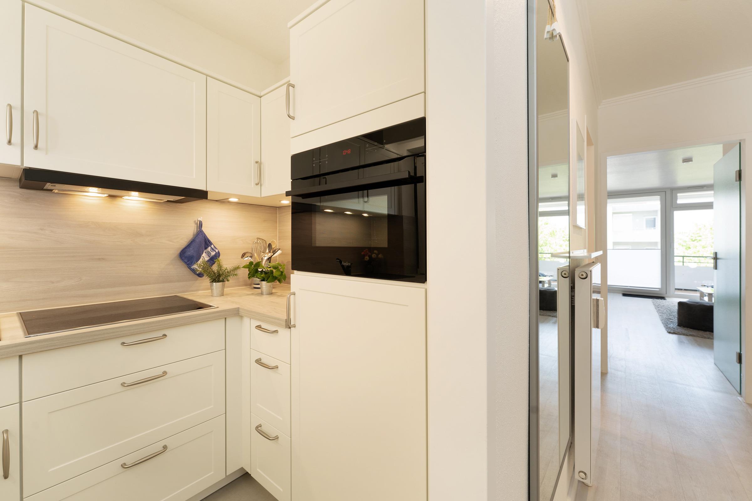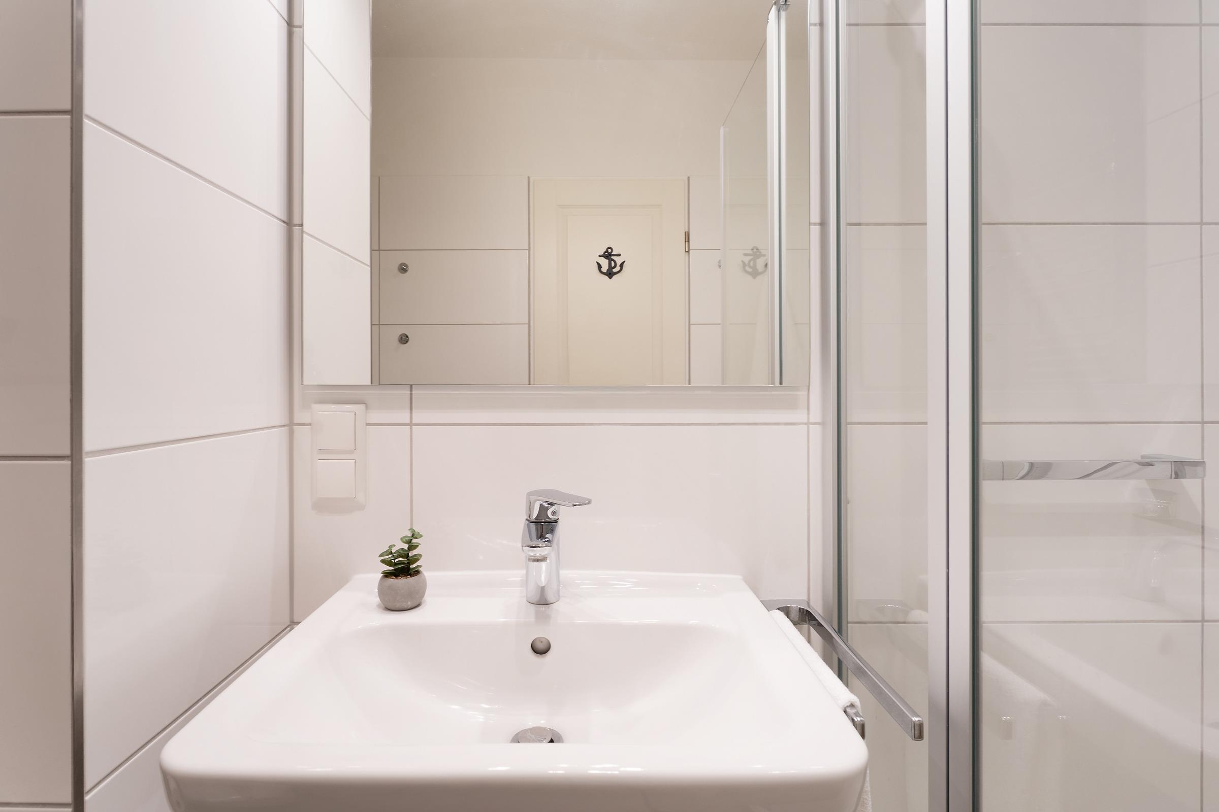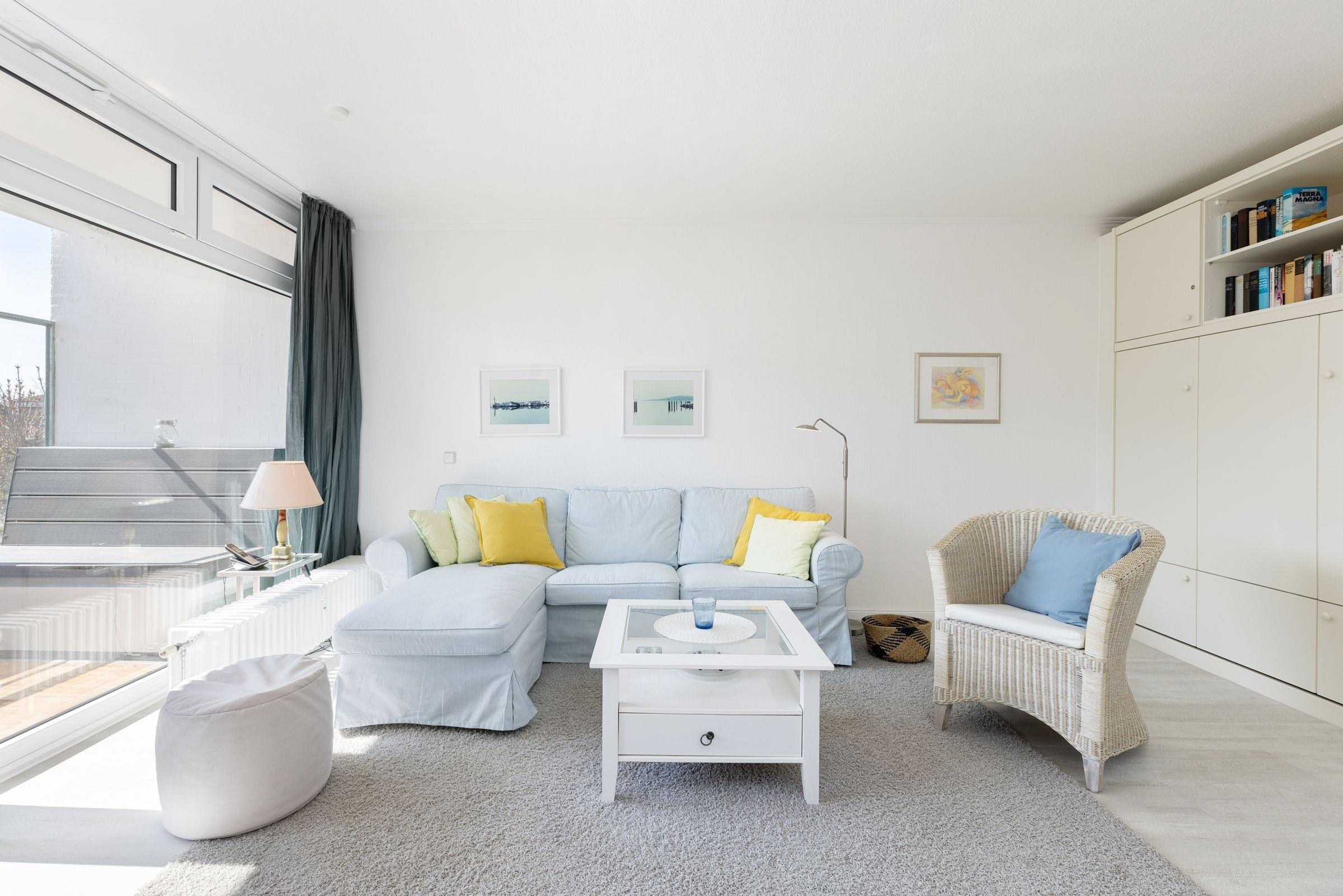 Der offene Wohn-/Schlafbereich empfängt Sie lichtdurchflutet und mit harmonischem Interieur im maritimen Landhausstil. Ein hochwertiges Schrankbett bietet hier eine bequeme Schlafmöglichkeit für bis zu 2 Personen (2x 80x200 cm). Eine gemütliche Fernseh-Ecke mit komfortablem Ecksofa , Sessel, Flachbild-TV und einem heimeligen Dekokamin sorgen nach langen Strandtagen für geruhsame Stunden. Der angrenzende Essbereich ist für bis zu 4 Personen ausgerichtet und bietet Platz für gesellige Mahlzeiten. Ein direkter Zugang führt vom Wohnzimmer auf den möblierten Balkon mit West-Ausrichtung und seitlichem, saisonalen Meerblick. Von der charmanten Eckbank schauen Sie durch Baumwipfel auf die funkelnde Ostsee. Im Außenbereich dient eine Markise als Schutz vor zu starker Sonneneinstrahlung. Im Eingangsbereich der Wohnung gibt es einen geräumigen Kleiderschrank mit reichlich Stauraum für Ihre Urlaubsgarderobe. Vom Flur aus erreichen Sie alle weiteren Räume. Das helle Bad ist mit Dusche, WC, Waschtisch und beleuchtetem Spiegel, sowie einem beheizbaren Handtuchhalter ausgestattet. Ein separates Schlafzimmer mit 2 Einzelbetten (je 90x200 cm) und einer Kommode ist ebenfalls hell und nordisch-modern eingerichtet und bietet einen lauschigen Rückzugsort für bis zu 2 Personen. In der separaten Küche erleichtern kleine Alltagshelfer wie z.B. ein 4-Platten Ceranherd, ein kombinierter Backofen mit Mikrowelle, sowie eine Spülmaschine die Küchenarbeit während des Urlaubs.