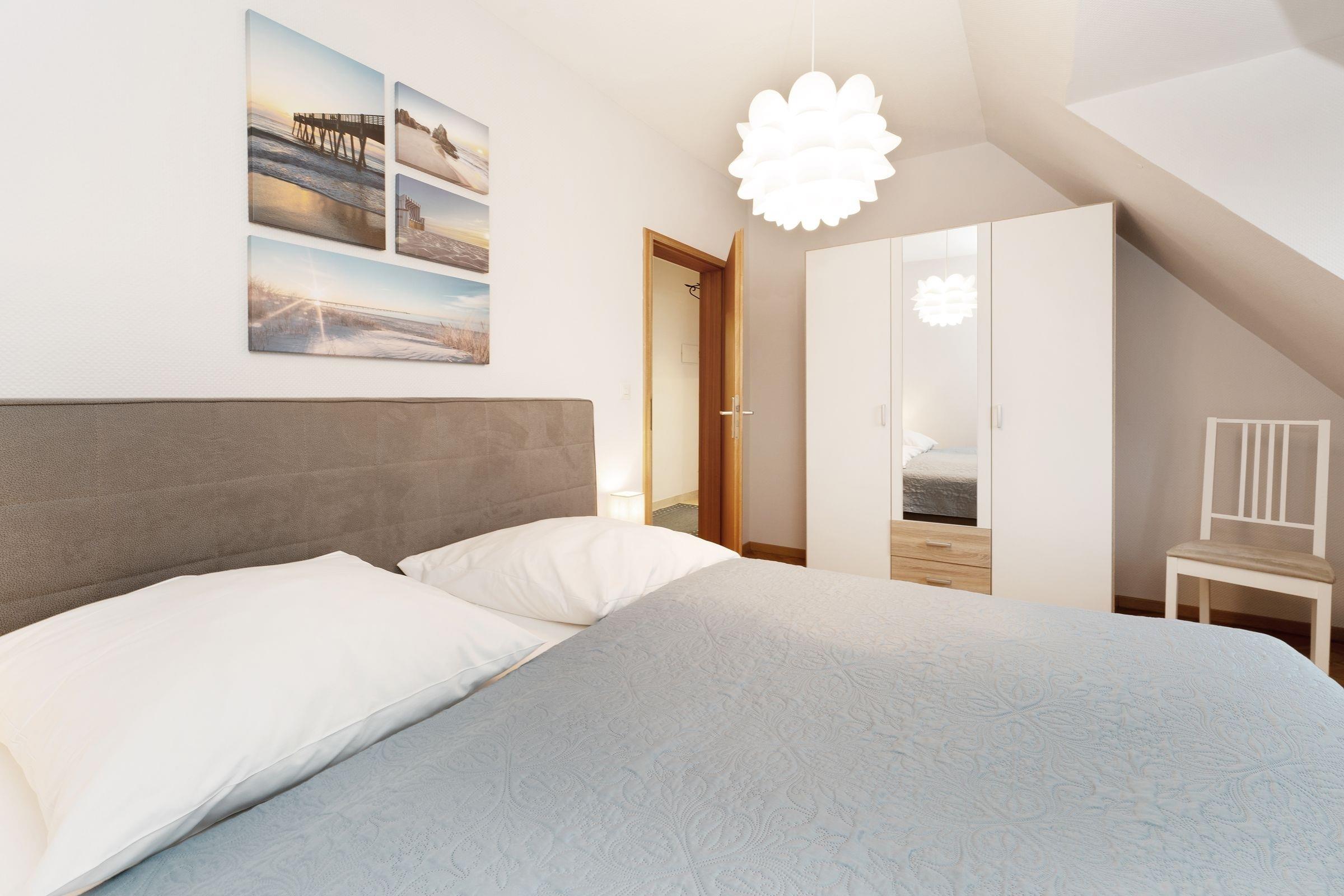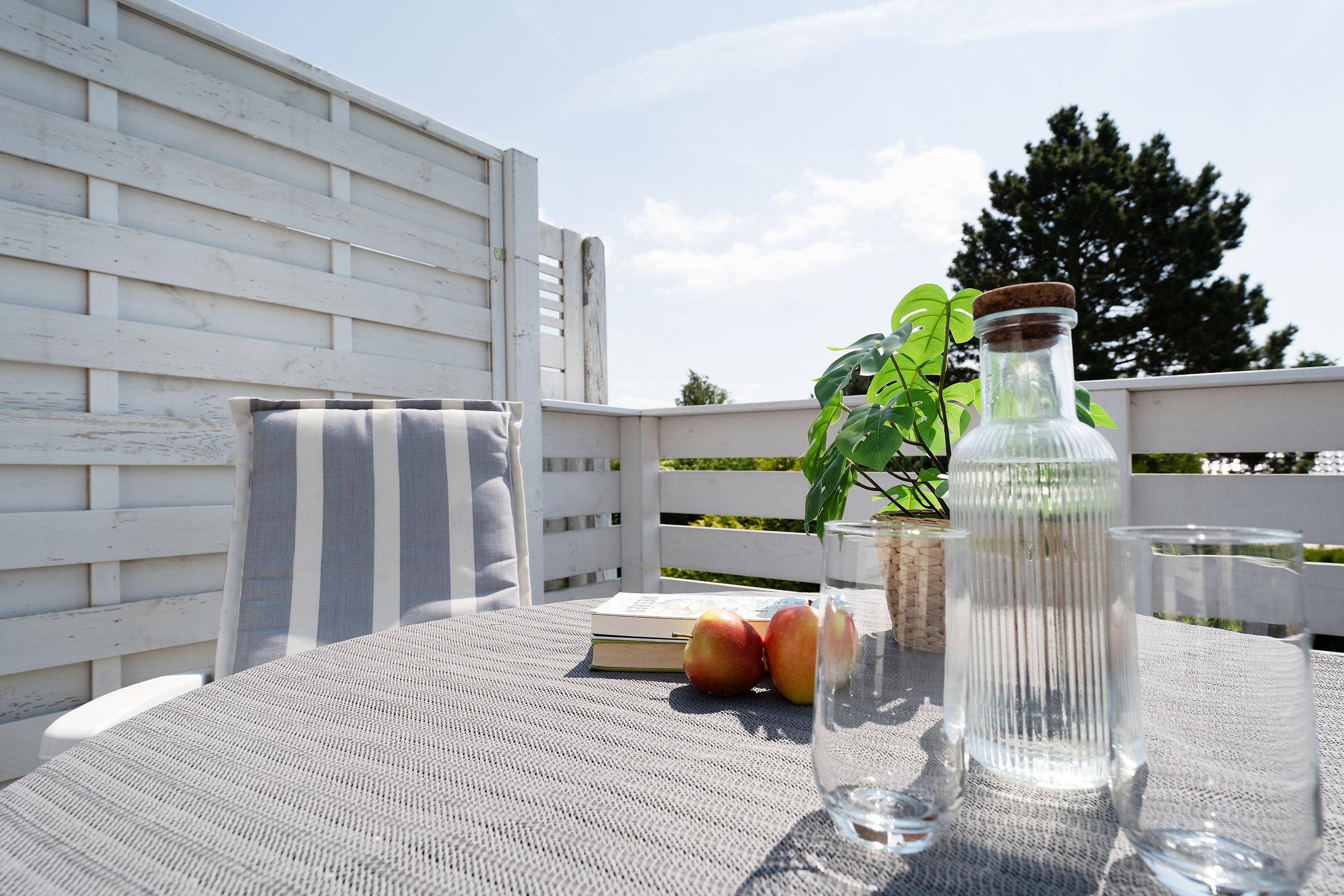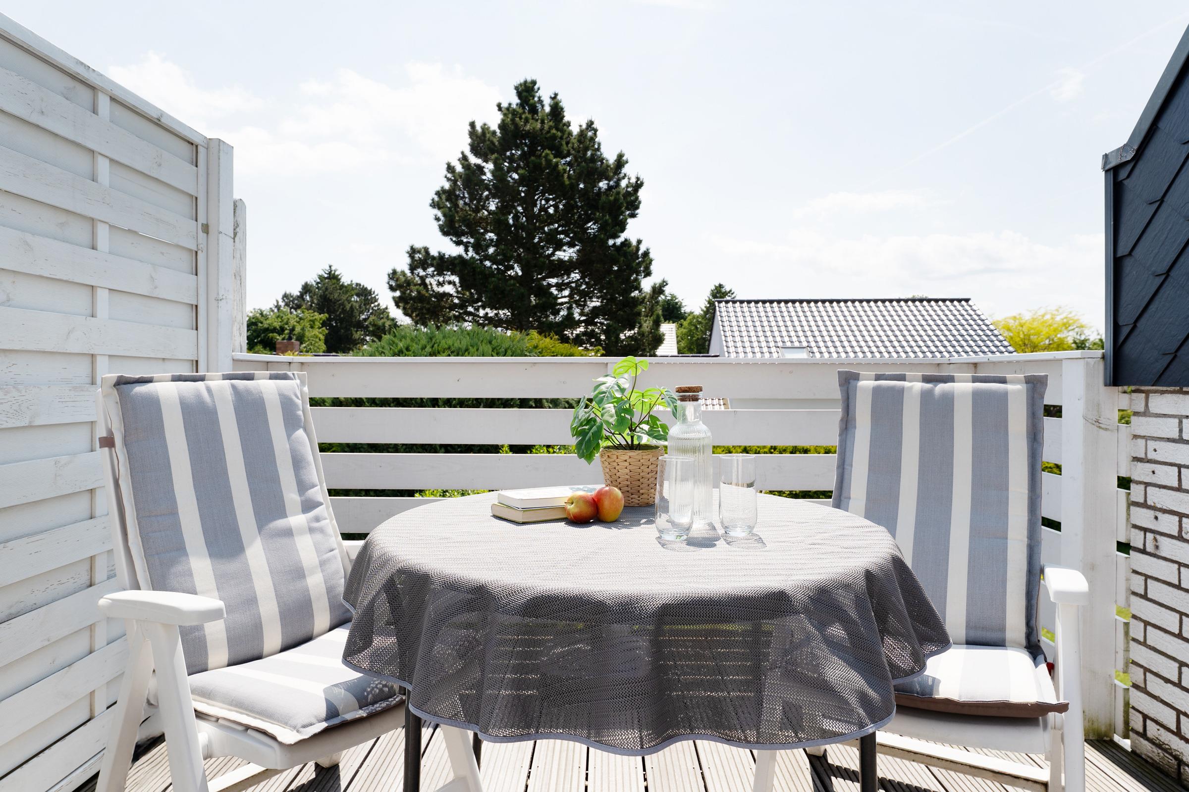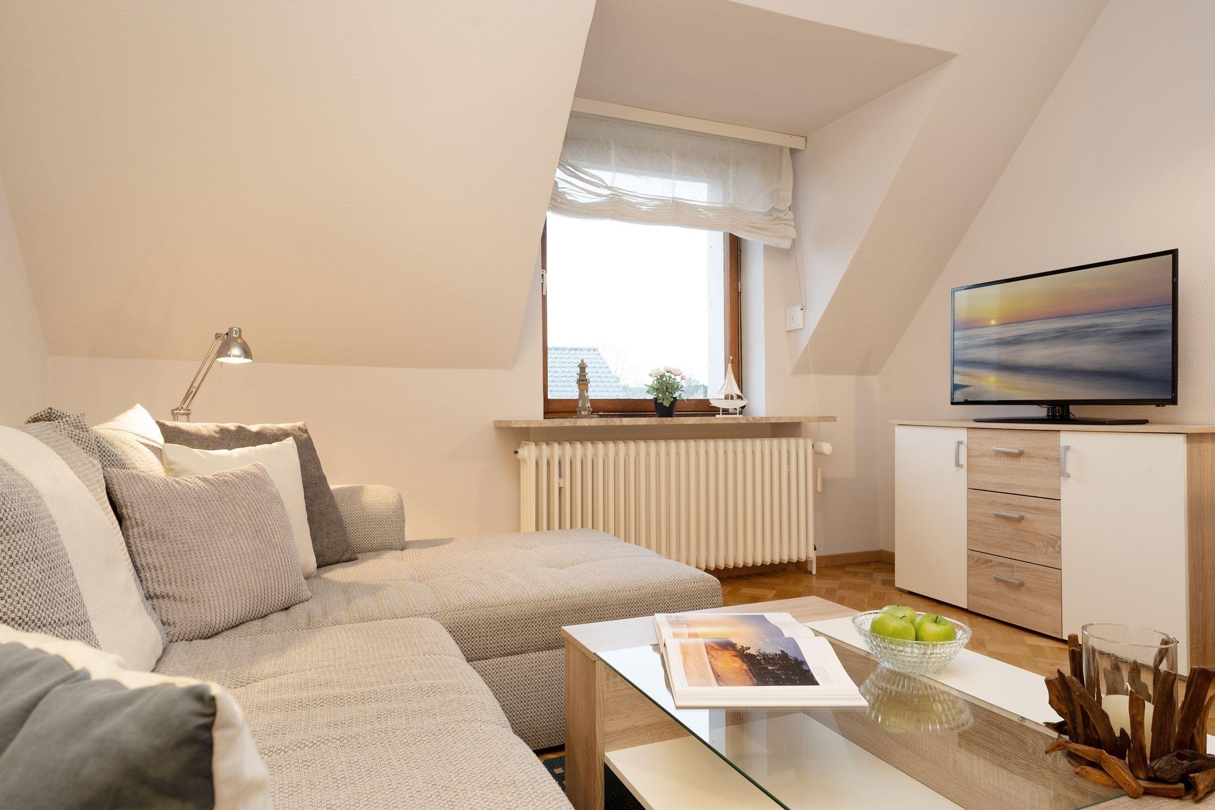 Der offen gestaltete Wohn-/Essbereich umfasst eine gemütliche Sitzecke, einen Esstisch sowie die offene Küchenzeile und begrüßt Sie lichtdurchflutet, mit gemütlicher und moderner Einrichtung. Die integrierte Küchenzeile überzeugt mit hochwertiger Ausstattung wie einem Backofen in angenehmer Arbeitshöhe sowie einer Spülmaschine. Machen Sie es sich nach langen Strandtagen auf dem großzügigen Ecksofa mit Schlaffunktion (Liegefläche 150x200cm) bequem, ein Flatscreen-TV sorgt für Unterhaltung. Vom Wohnbereich aus führt ein direkter Zugang auf die möblierte Dachterrasse mit Südostausrichtung, freuen Sie sich auf herrliche Sonnenstunden inklusive frischer Ostseeluft! Das separate Schlafzimmer ist mit einem komfortablen Boxspringbett (180x200 cm) und Kleiderschrank ausgestattet, durch Außenjalousien ist Verdunklung für die Nacht gewährleistet. Das geschmackvolle Tageslichtbad in warmen Naturtönen bietet viel Komfort.