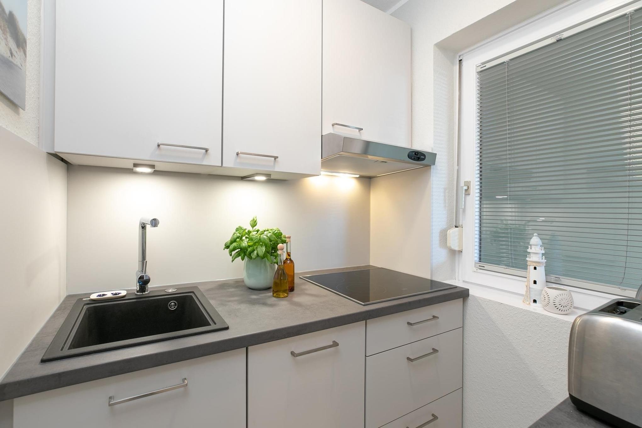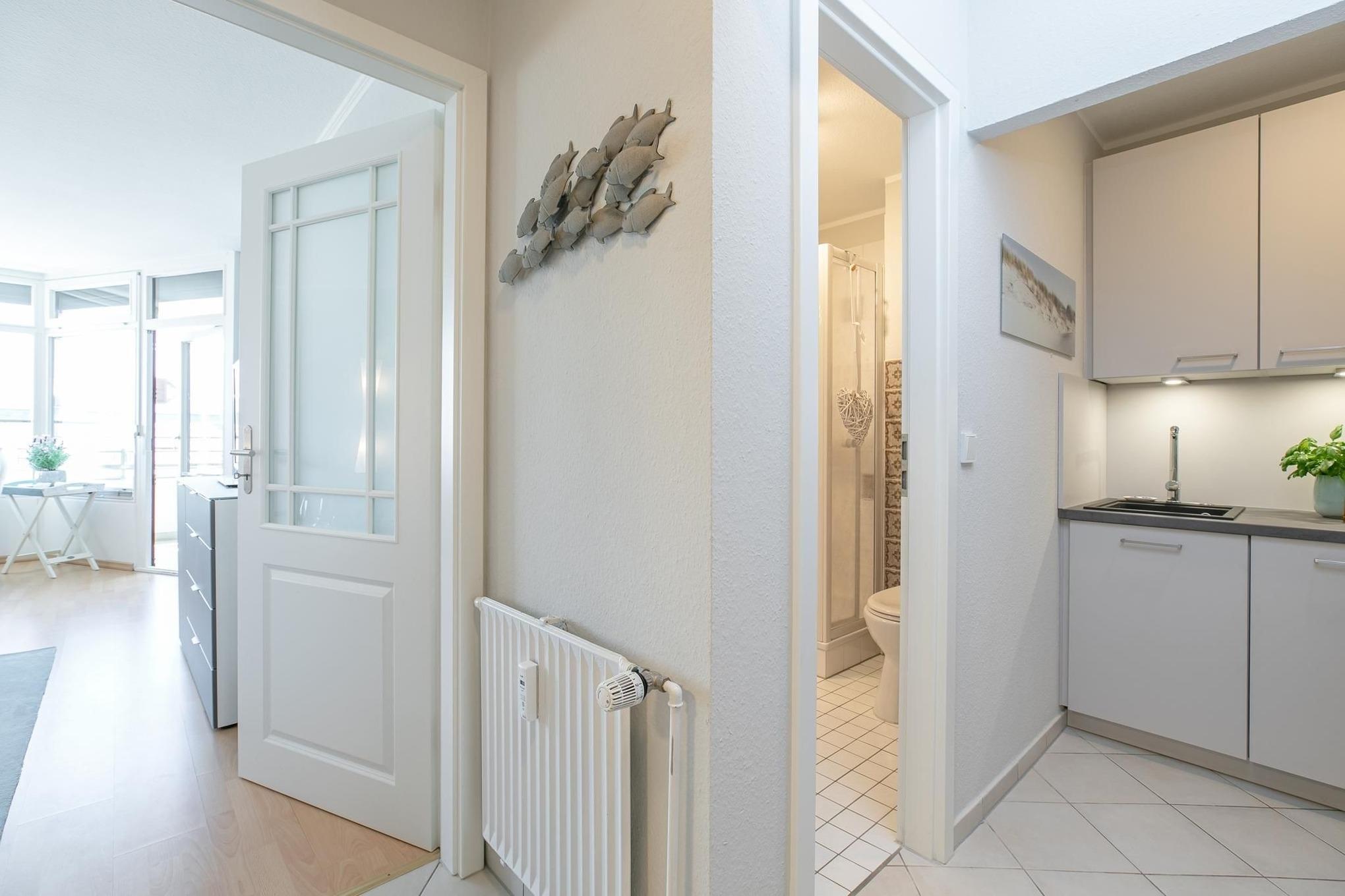 Sehr schöne Ferienwohnung mit sehr kleiner Küche in der 2. Etage. Aussicht vom hübschen Balkon ist auf den Innhof der umliegenden Gastronomie mit kleinem Blick zum Meer. Kann man aber auch bereits auf den Fotos erkennen. Unkomplizierter Informationsaustausch über die Kraushaar App. Die Lage zur Promenade und Strand nur wenige Schritte. Kleine Anmerkung der Aufsatz vom Toaster fehlt. Extra den Herd zum Brötchen aufbacken starten, ist nicht so sinnvoll. Ansonsten ist die Küche mit allem ausgestattet für 4 Personen.