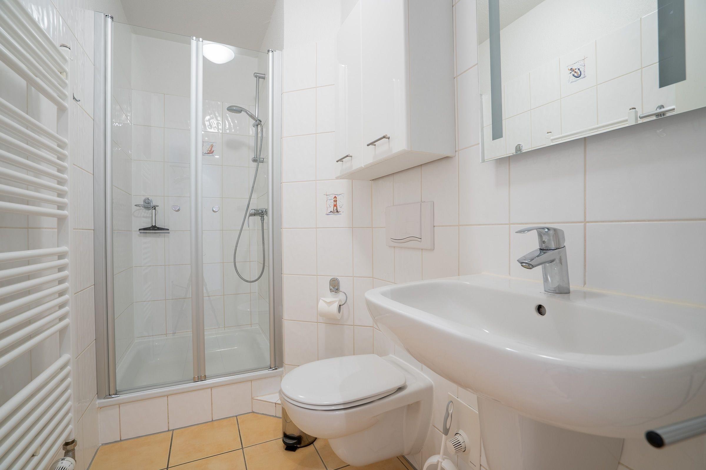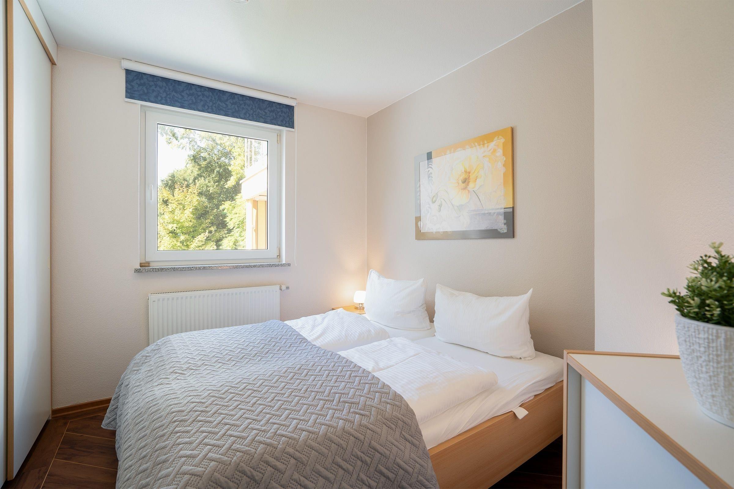 Das separate Schlafzimmer ist mit einem bequemen Doppelbett (2x 80x190cm) und Kleiderschrank ausgestattet. Vom gemütlichen Wohn-/Essbereich mit integrierter, gut ausgestatteter Küche geht es direkt auf den möblierten Balkon, eine Markise schützt hier vor zu starker Sonneneinstrahlung. Das Badezimmer begeistert mit Annehmlichkeiten wie Dusche, beheizbarem Handtuchhalter, Fön und Fußbodenheizung.