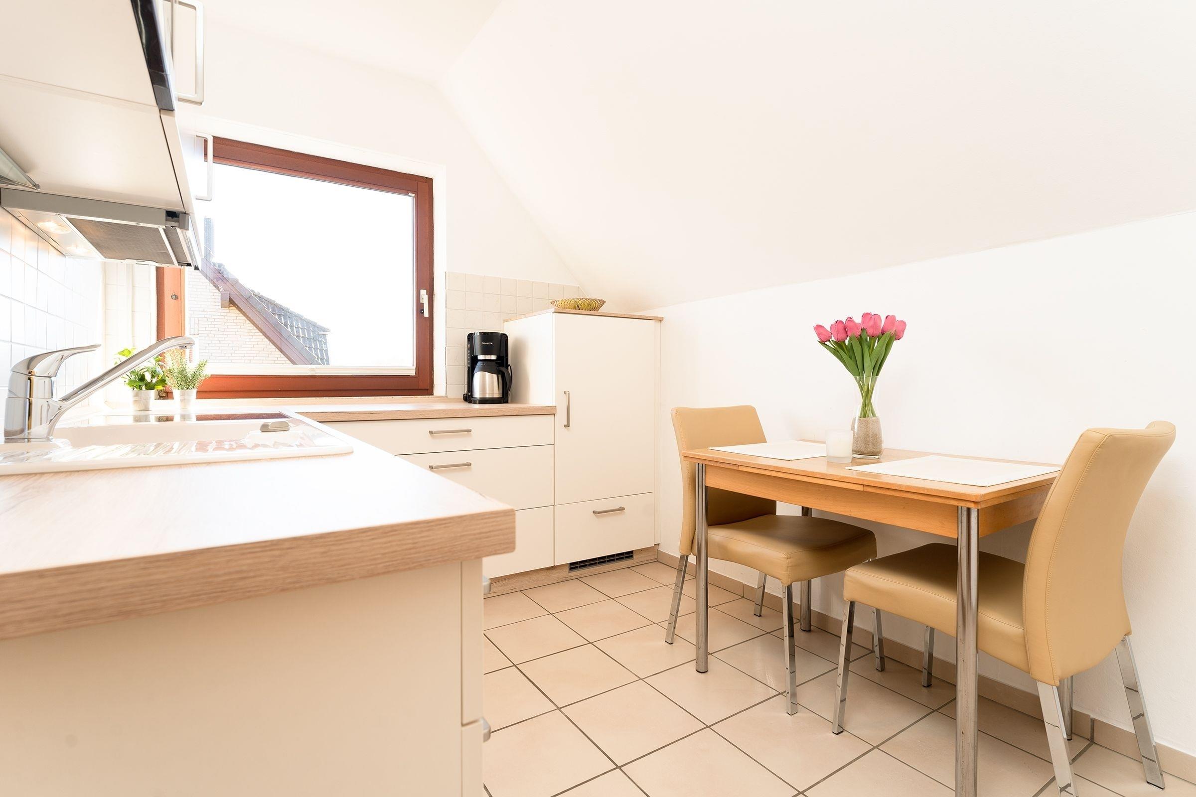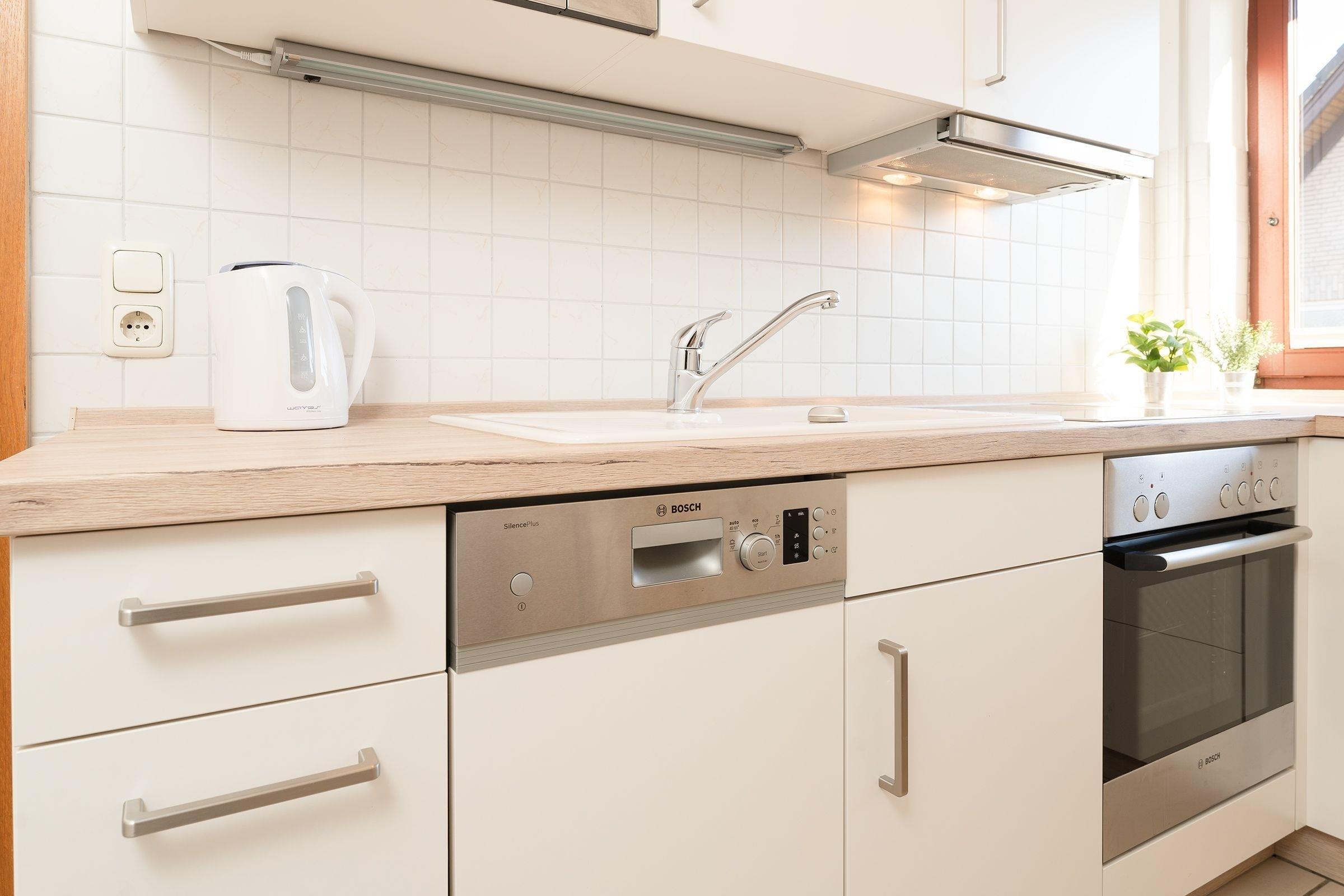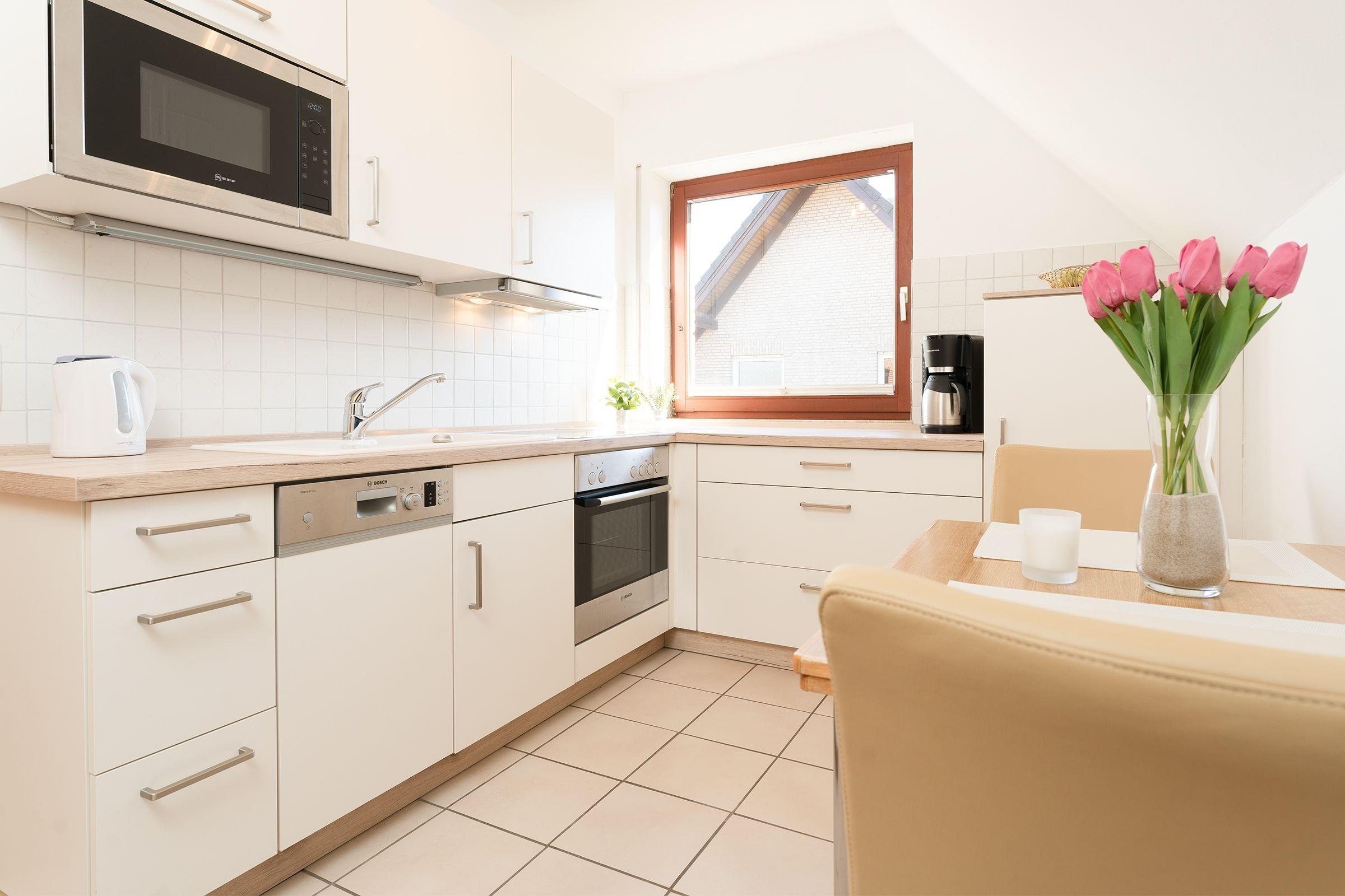 Das Wohnzimmer ist mit komfortabler Sofaecke, Essplatz für 2 Personen, und TV hell und gemütlich eingerichtet. Die moderne Küche ist mit Annehmlichkeiten wie Cerankochfeld, Backofen, Kühlschrank, Spülmaschine, sowie Mikrowelle gut ausgestattet. Das separate Schlafzimmer verfügt über ein bequemes Doppelbett (2x 90x200 cm) und einen geräumigen Kleiderschrank, sowie direkten Zugang zum möblierten Süd-Ost-Balkon. Das tageslichthelle Badezimmer bietet Dusche, WC und Waschmaschine. Das gesamte Domizil ist mit Fliesen ausgelegt, Fußbodenheizung sorgt für wohlige Wärme.