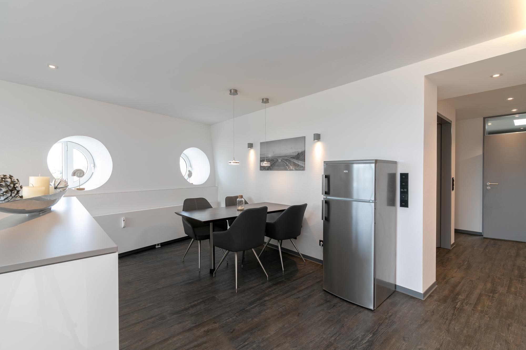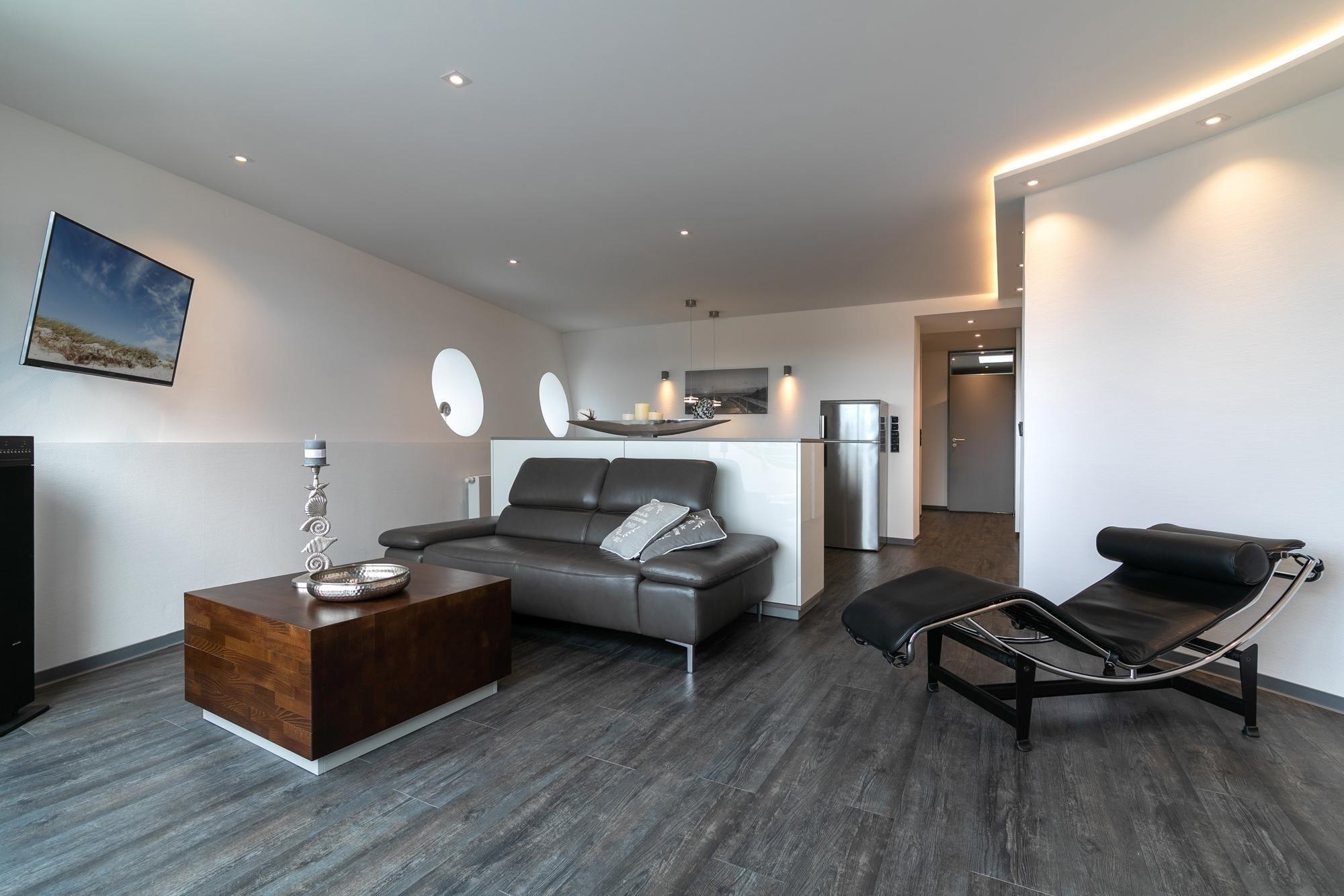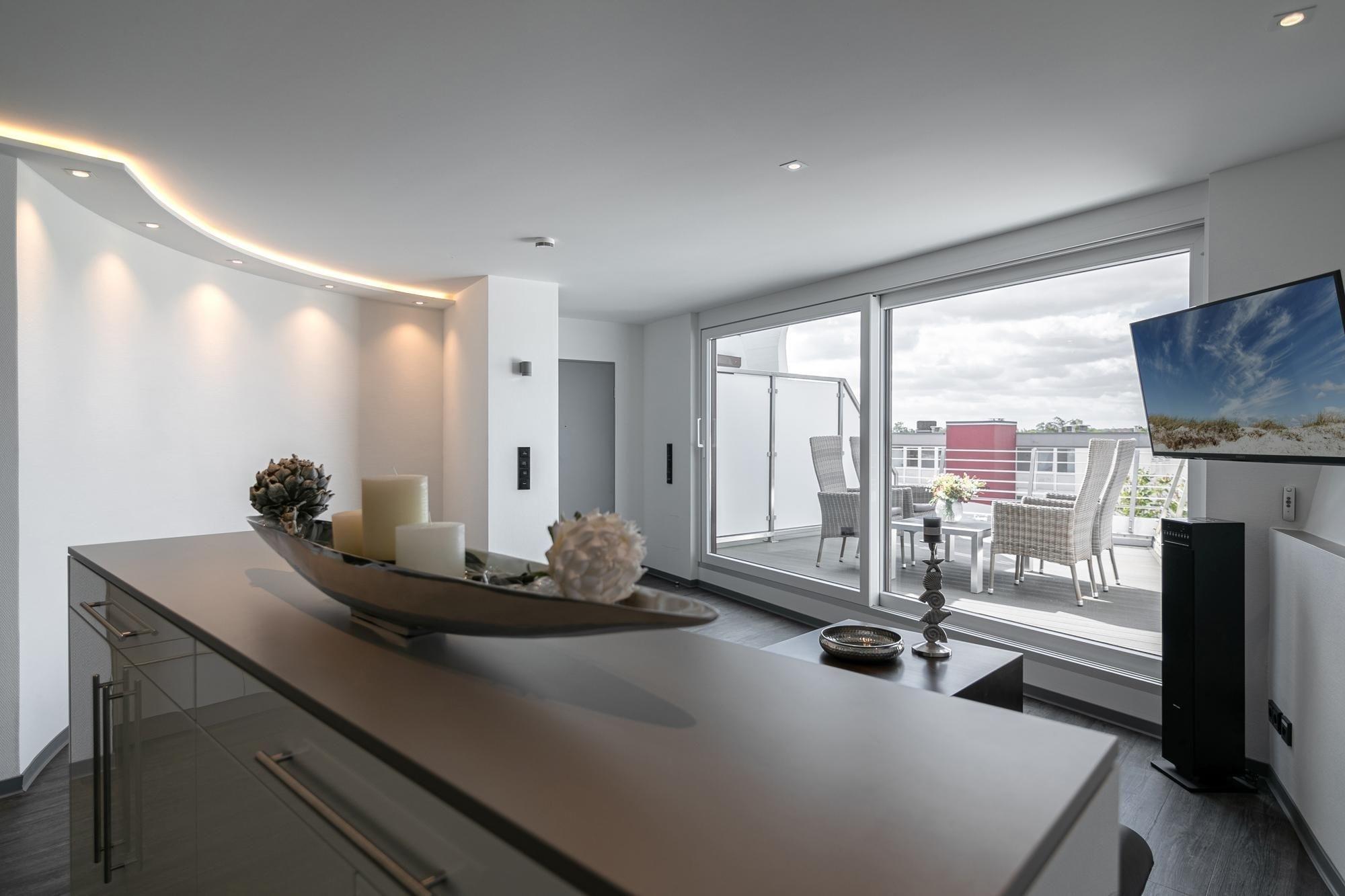 Der moderne Wohn- und Essbereich mit markanter Raumstruktur bietet eine gemütliche Couchgarnitur, Flatscreen-TV, einen stilsicheren Essplatz für 4 Personen, sowie eine integrierte Küchenzeile mit guter Ausstattung. Annehmlichkeiten wie ein geräumiger Standkühlschrank mit Gefrierfach, Backofen und Spülmaschine erleichtern den Urlaubsalltag. Vom Wohnbereich führt ein direkter Zugang zur großen, möblierten Dachterrasse mit Süd-West-Ausrichtung.