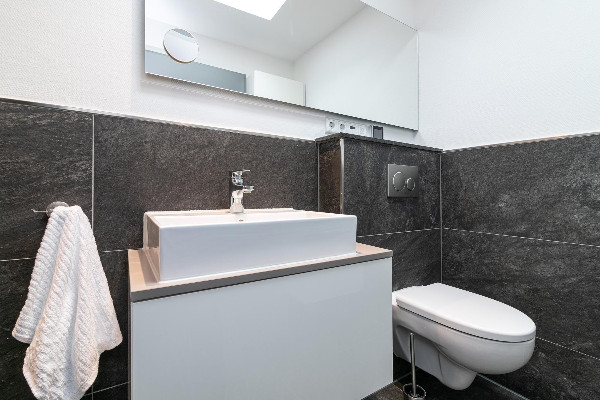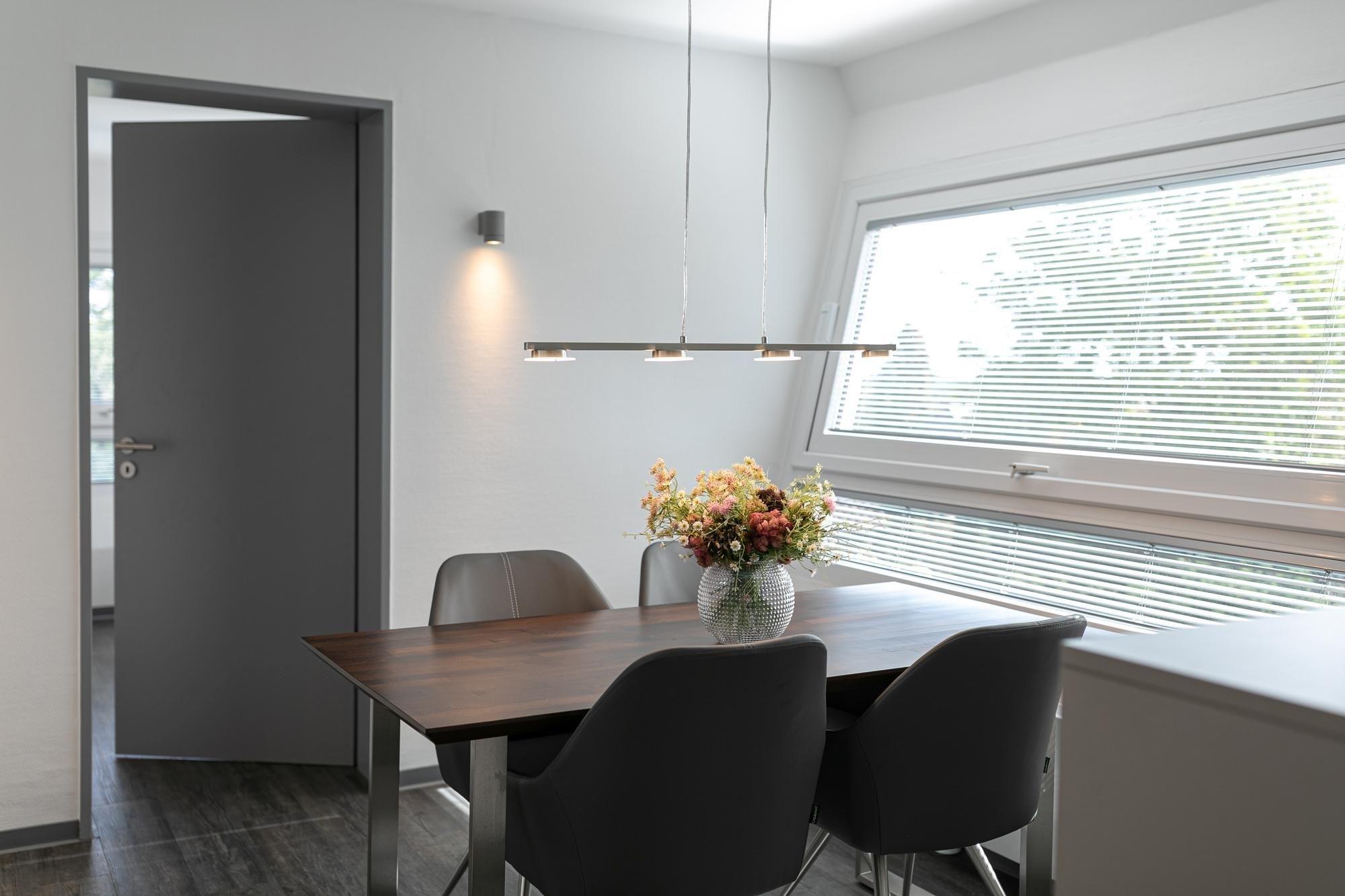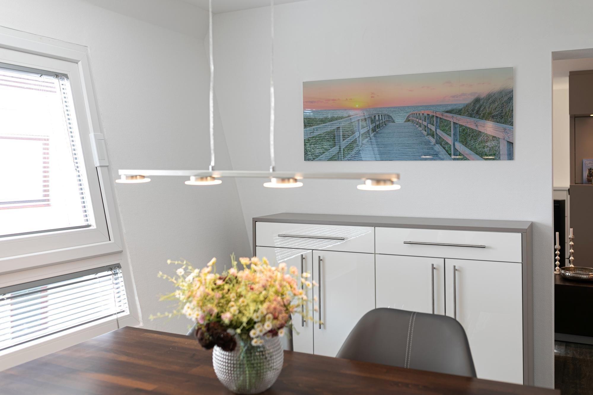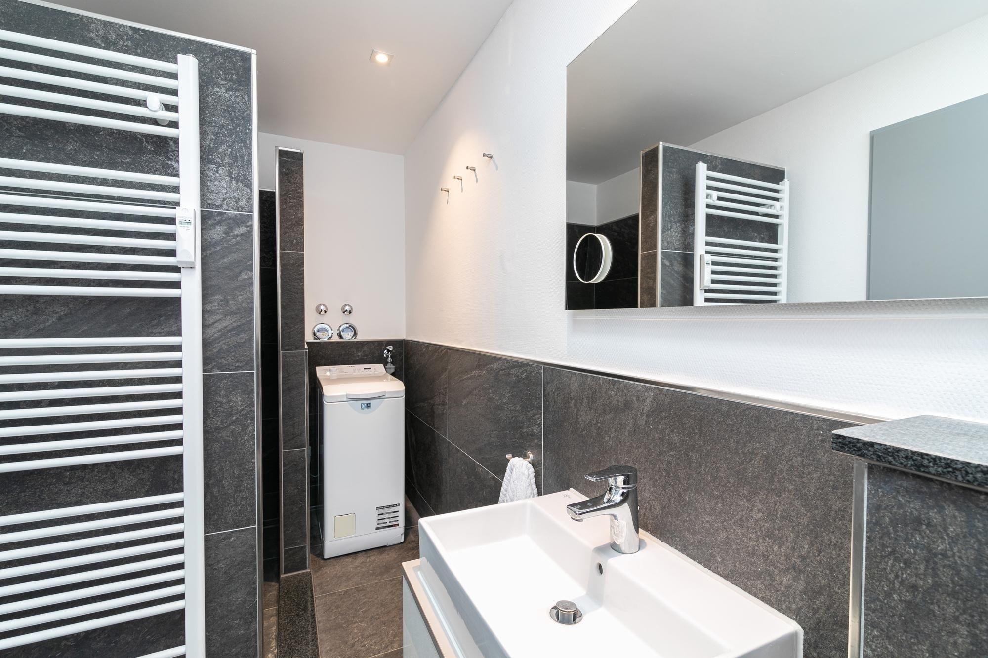 Der moderne Wohn-/Essbereich mit markanter Raumstruktur bietet eine gemütliche Sofa Ecke mit Flatscreen-TV, sowie einen stilsicheren Essplatz für 4 Personen. Die hochwertige, offen gestaltete Küchenzeile ist mit Annehmlichkeiten wie Kühlschrank mit Gefrierfach, Backofen und Spülmaschine gut ausgestattet. Treten Sie aus der Wohnung in den Hausflur, gelangen Sie zur möblierten Dachterrasse mit Süd-West-Ausrichtung. Eines der separaten Schlafzimmer ist mit einem komfortablen Doppelbett (2x 100x200 cm), Flatscreen-TV und Kleiderschrank möbliert. Im zweiten Schlafzimmer befinden sich zwei Einzelschrankbetten (je 100x200 cm), ein Flatscreen-TV, sowie ein Kleiderschrank, dieses Schlafzimmer wird über den Hausflur erreicht und ist daher eher für Erwachsene oder ältere Kinder geeignet. Im geschmackvollen Bad sorgen Wohlfühl-Elemente wie Waschbecken mit Unterschrank und beleuchtetem Spiegel, Walk-in-Dusche, Waschmaschine und beheizbarer Handtuchhalter für Komfort.
