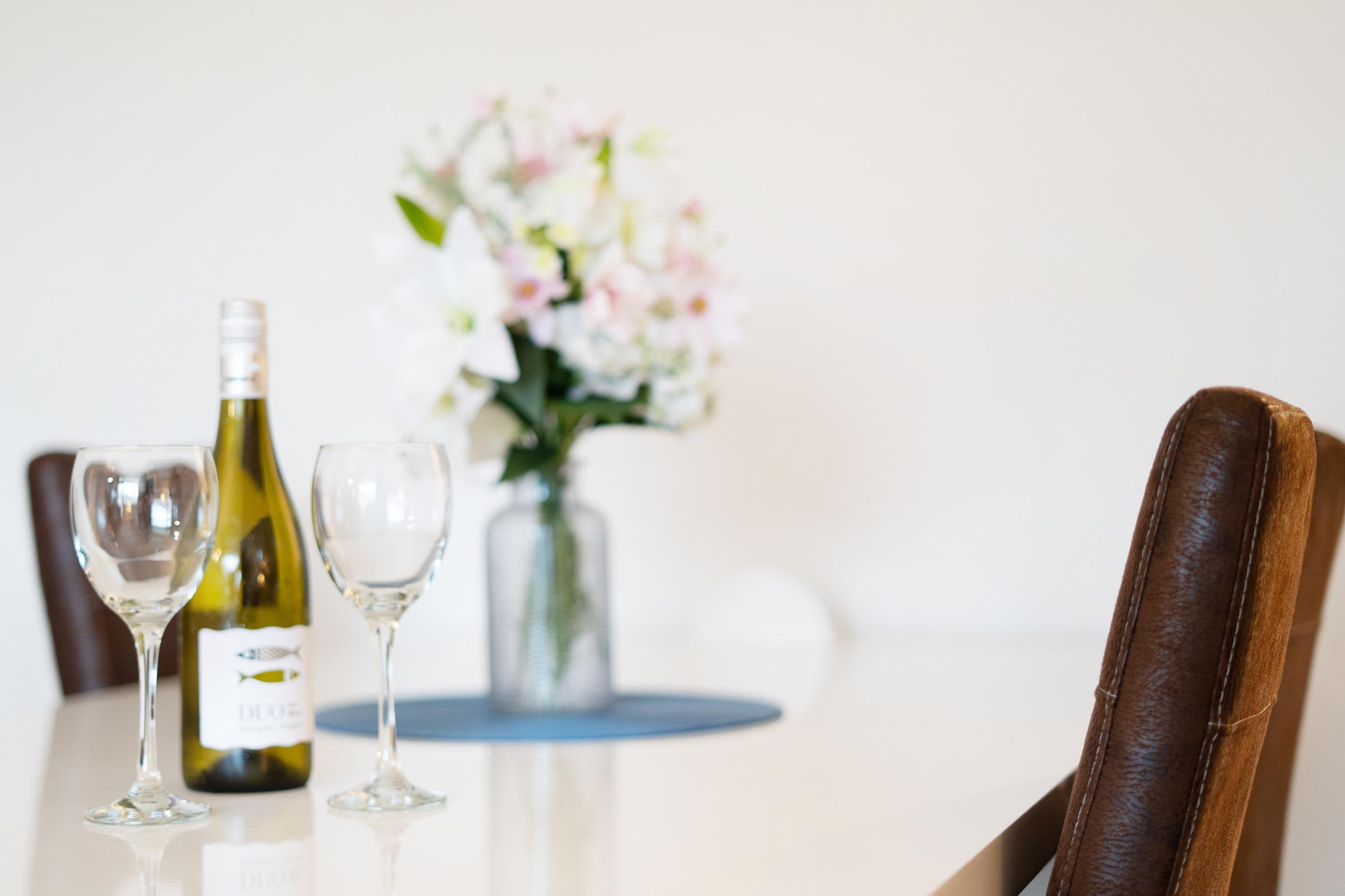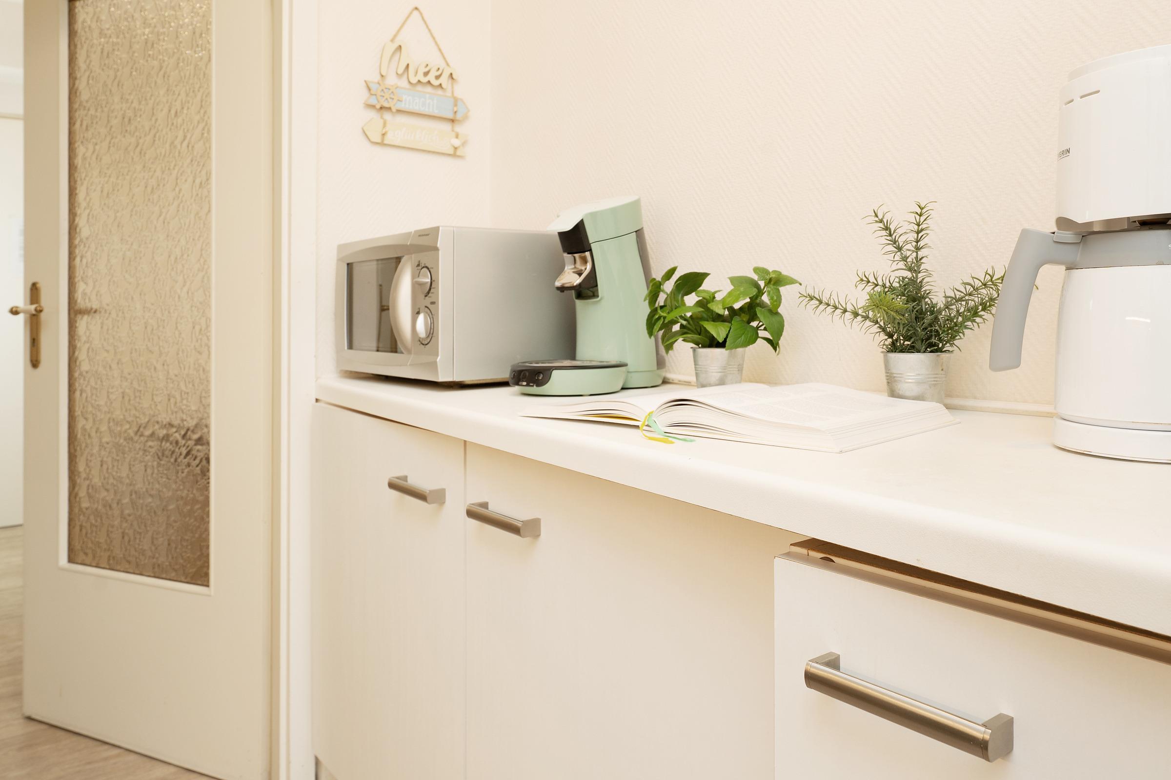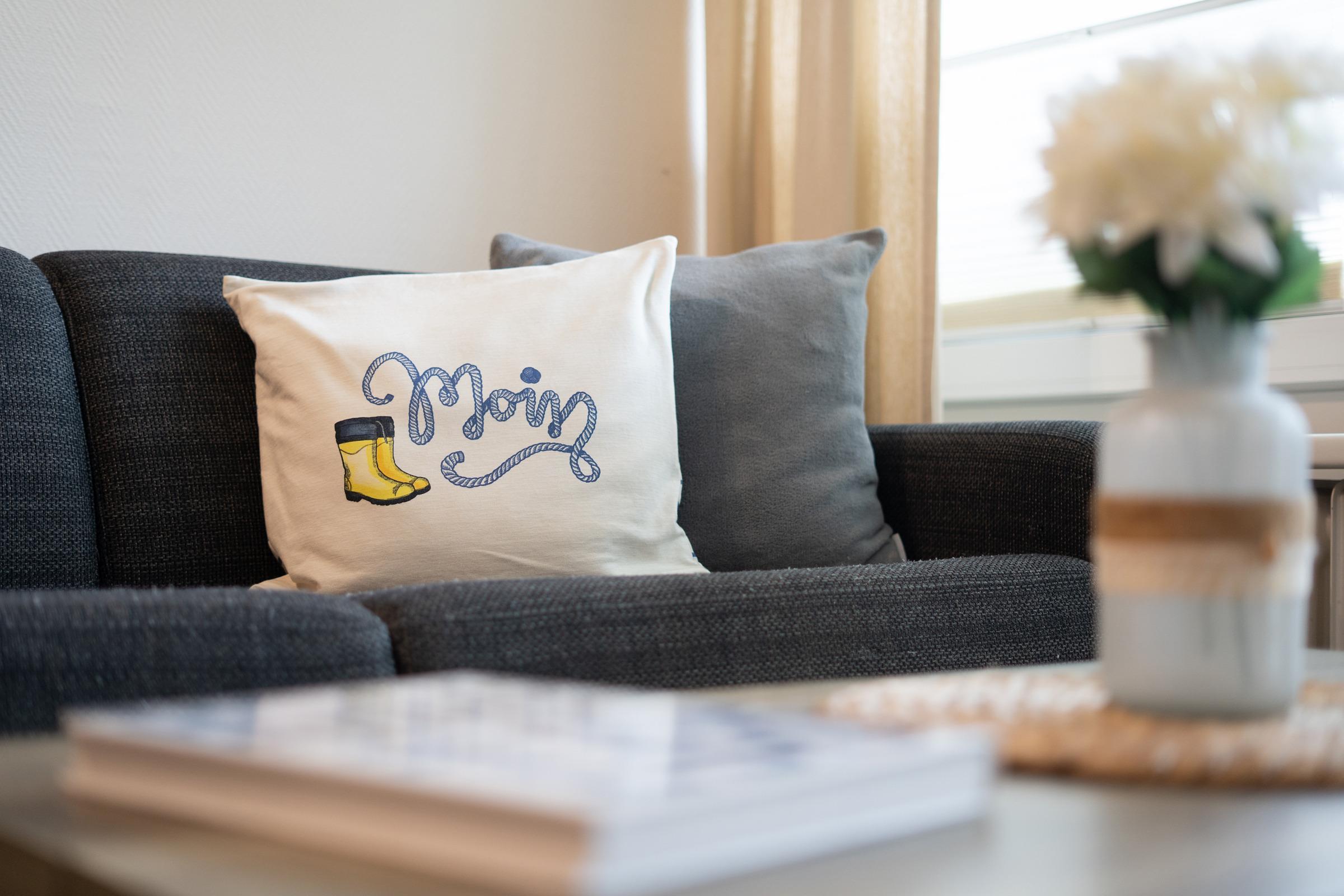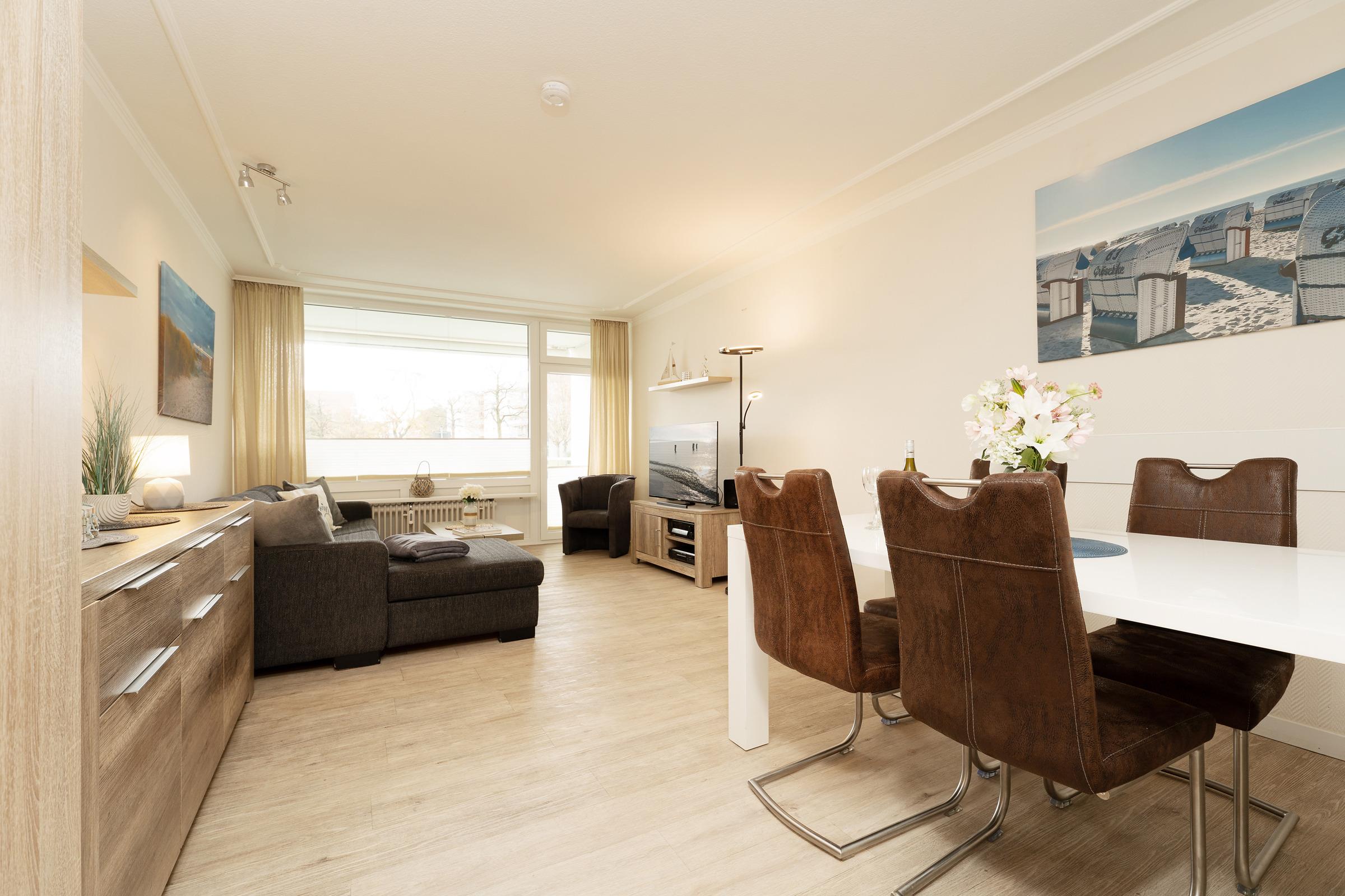 Im gemütlichen Wohnzimmer befindet sich eine offene Küche, die ausgestattet ist mit Herd, Kühlschrank mit Gefrierfach, Geschirrspülmaschine und vielem mehr. Ein ausziehbares Schlafsofa (180x250 cm) bietet Platz für 2 Personen. Im separaten Schlafzimmer ist ein bequemes Doppelbett (160x200 cm) das für 2 weitere Schlafplätze sorgt. Das Badezimmer überzeugt mit einer Dusche und einem beheizbaren Handtuchhalter. Der Balkon mit Südwest-Ausrichtung und Meerblick rundet diese Feriendomizil ab.