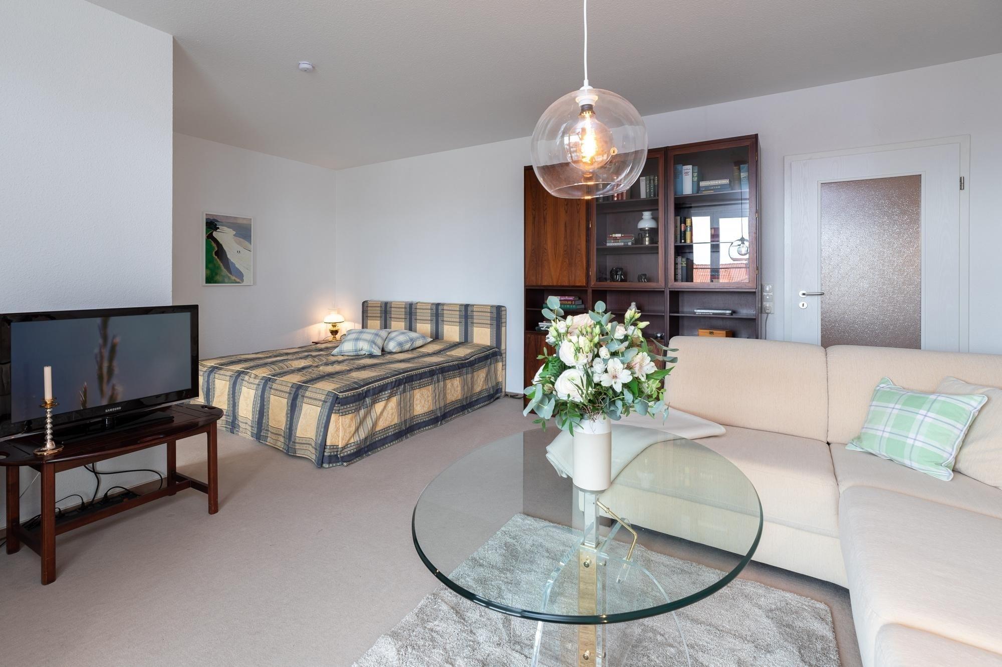 Machen Sie es sich im gemütlichen Wohn-/Schlafraum auf Sofa und Sesseln bequem, für elektronische Unterhaltung sorgen TV, Radio und ein kostenfreier WLAN-Zugang. Nach einem ausgiebigen Strandtag finden Sie Ruhe und Entspannung in dem komfortablen Doppelbett (2x90x200cm), Vorhänge sorgen für angenehme Verdunklung. Mit Alltagshelfern wie 4-Platten-Ceranherd, Backofen und Kühlschrank mit Gefrierfach bietet die separate Küche perfekte Voraussetzungen für entspanntes Kochen im Urlaub. Das Badezimmer ist mit Dusche (Einstiegshöhe ca. 26 cm) und WC klassisch ausgestattet. Auf Ihrem großzügigen Balkon genießen Sie die herrliche Ostseeluft, ein Sonnenschirm schützt an Sommertagen vor zu starker Sonnenstrahlung.