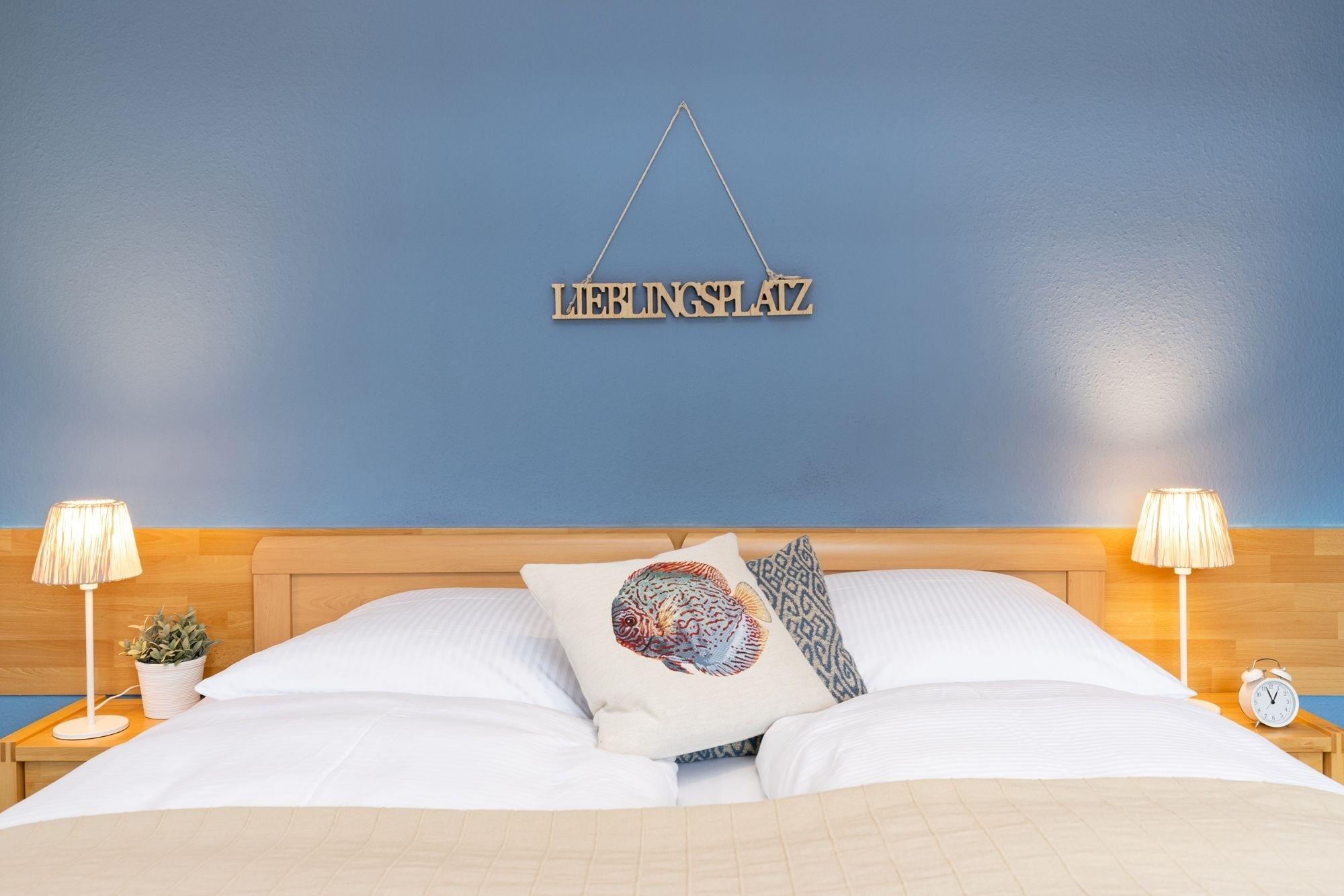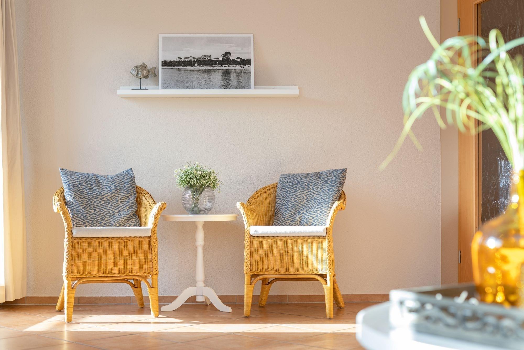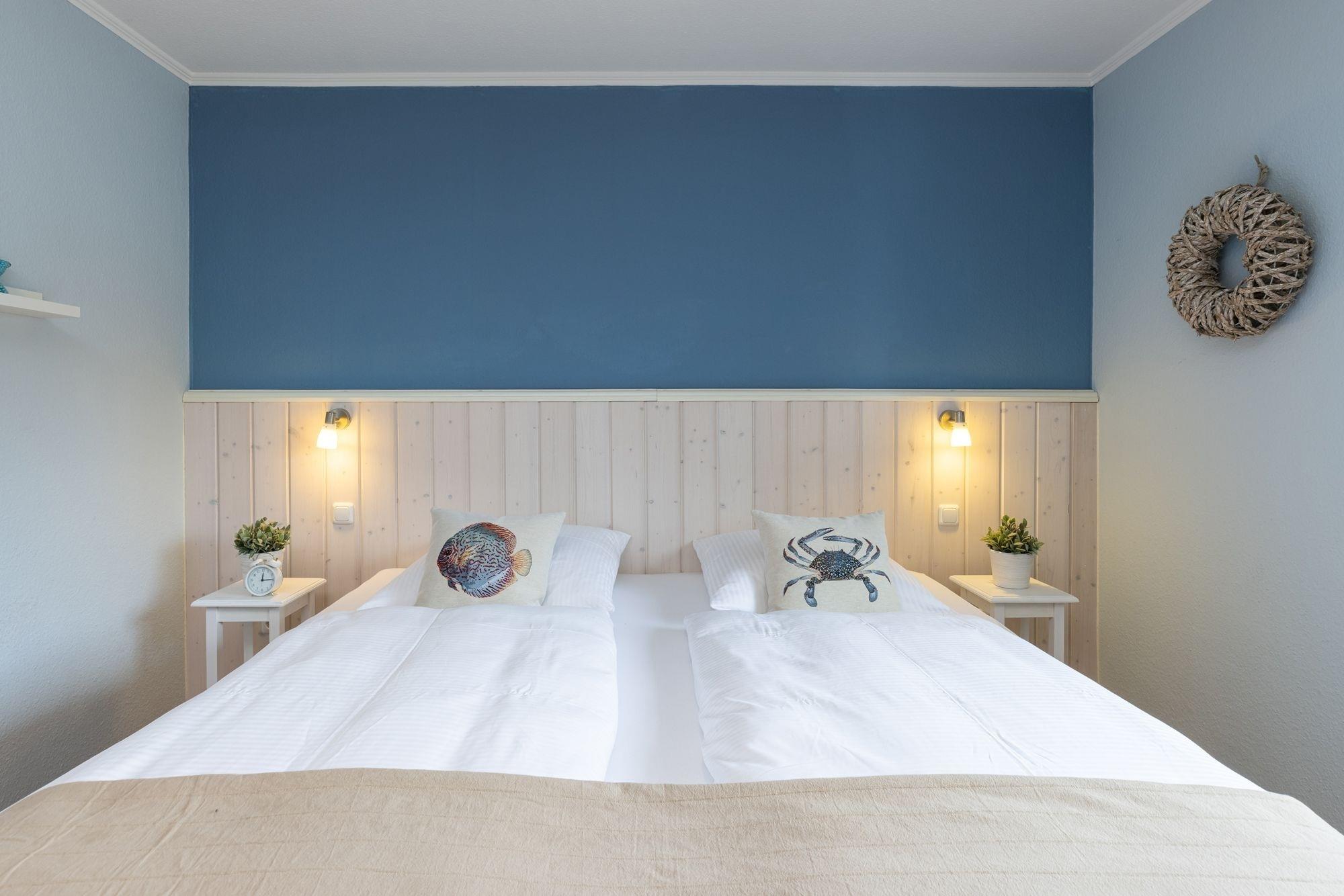 Mittelpunkt der Wohnung ist der einladende Wohnbereich mit kuscheliger Sofalandschaft - hier verbringen Sie gesellige Stunden bei guten Gesprächen, Gesellschaftsspielen oder Filmeabenden vor dem Flat-TV. Auch ein kostenfreier WLAN-Anschluss steht Ihnen zur Verfügung, so dass Sie auch im Urlaub erreichbar bleiben. Auf dem möblierten Balkon mit Sonnenschirm können Sie die gesunde Ostseeluft genießen und bei einem ausgiebigen Frühstück den Tag aus sich zukommen lassen. Verwöhnen Sie Geist und Körper mit gutem Essen, das Sie in der voll ausgestatteten Küche mit Essplatz ohne Mühe zubereiten können. Am Abend ziehen Sie sich in eines der zwei separaten Schlafzimmer zurück. Sie können hier zwischen einem komfortablen Boxspringbett (2x 100x200 cm) oder einem bequemen Doppelbett (2x 90x200 cm)wählen. Ihre Urlaubsgarderobe bringen Sie jeweils in einem Kleiderschrank unter. Das schön gestaltete Badezimmer mit Tageslicht und großer Dusche komplettiert die tolle Ausstattung dieser Ferienwohnung.
