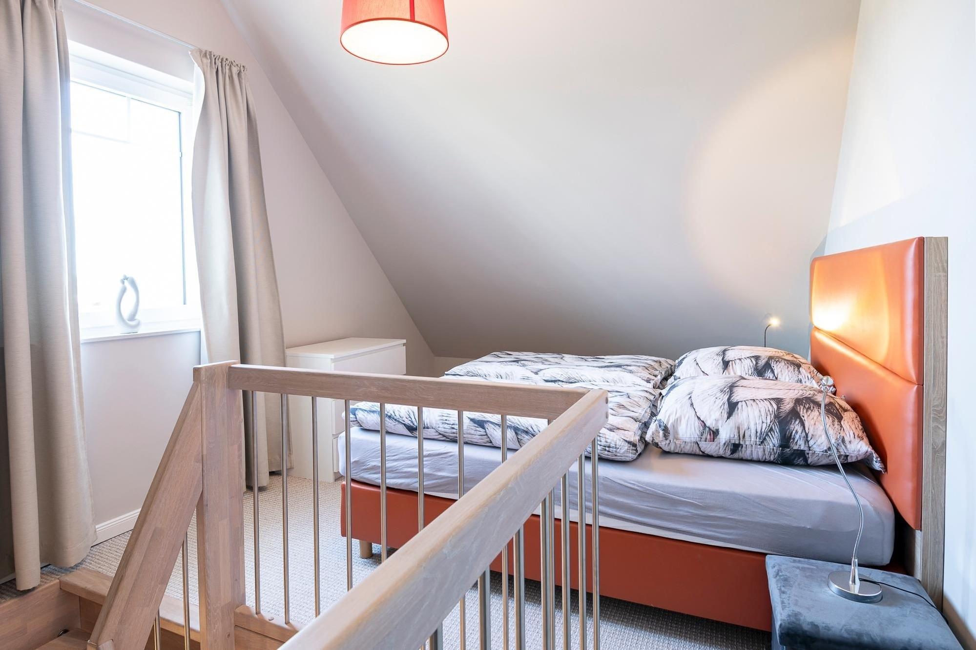 Schlafzimmer 2 (über Treppe erreichbar, offen): 1 Doppelbett (2x 90x200 cm), Vorhänge