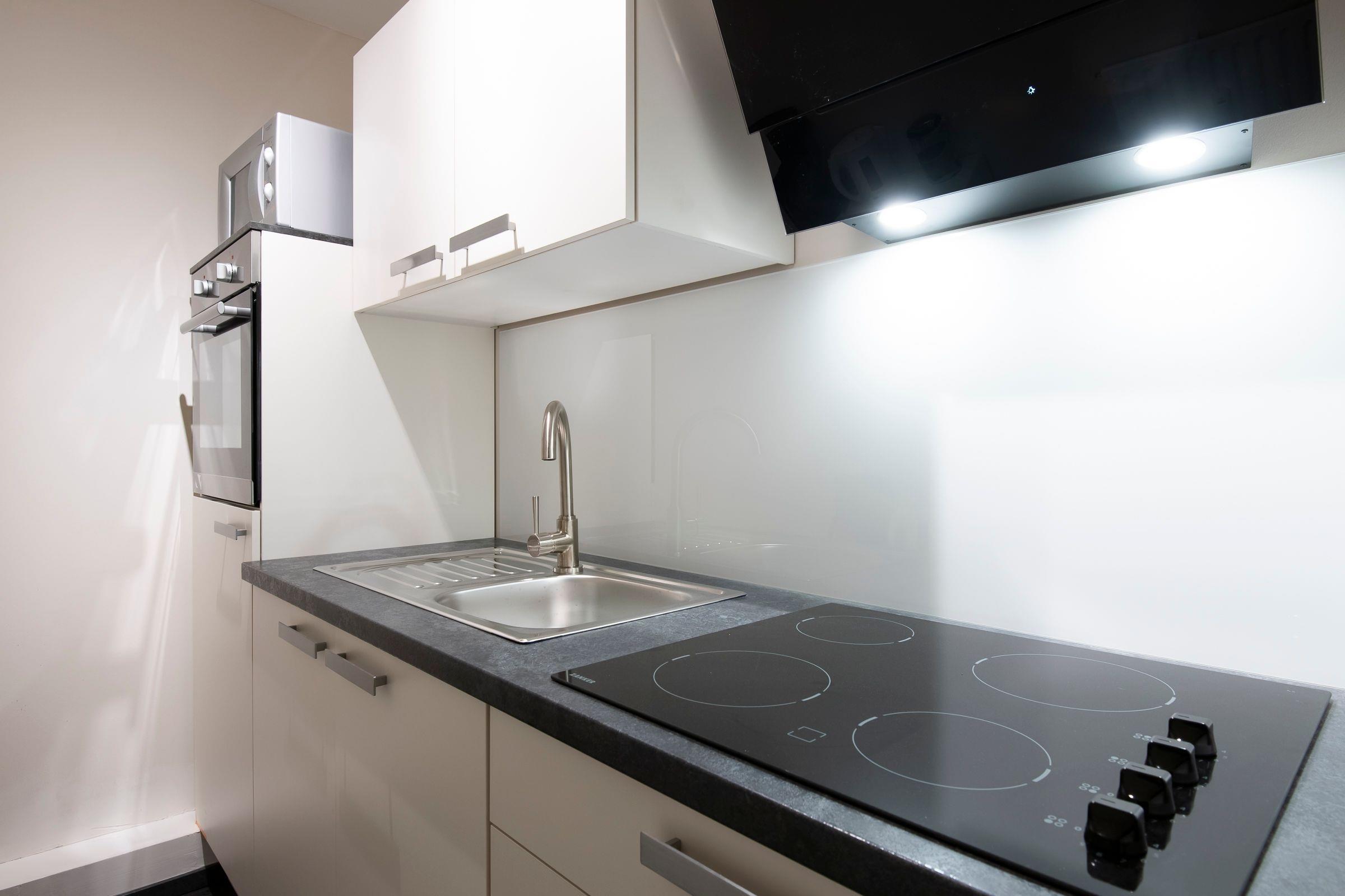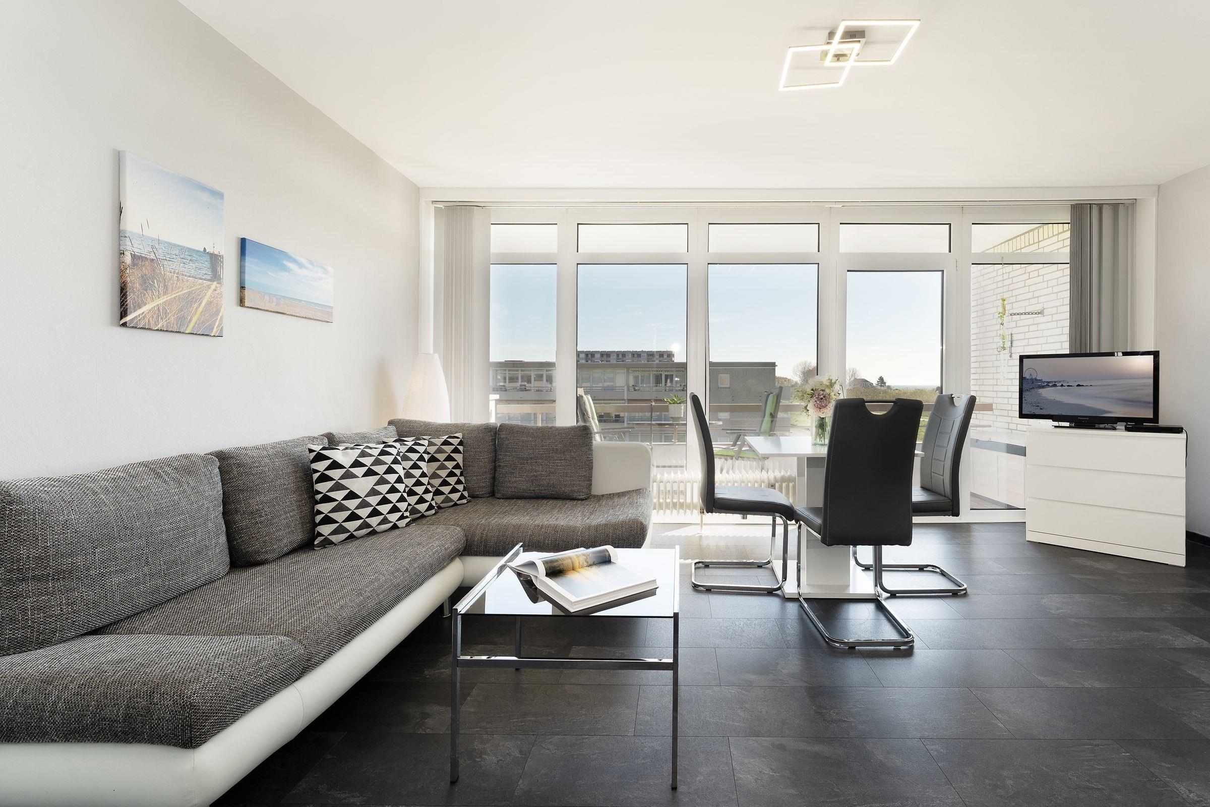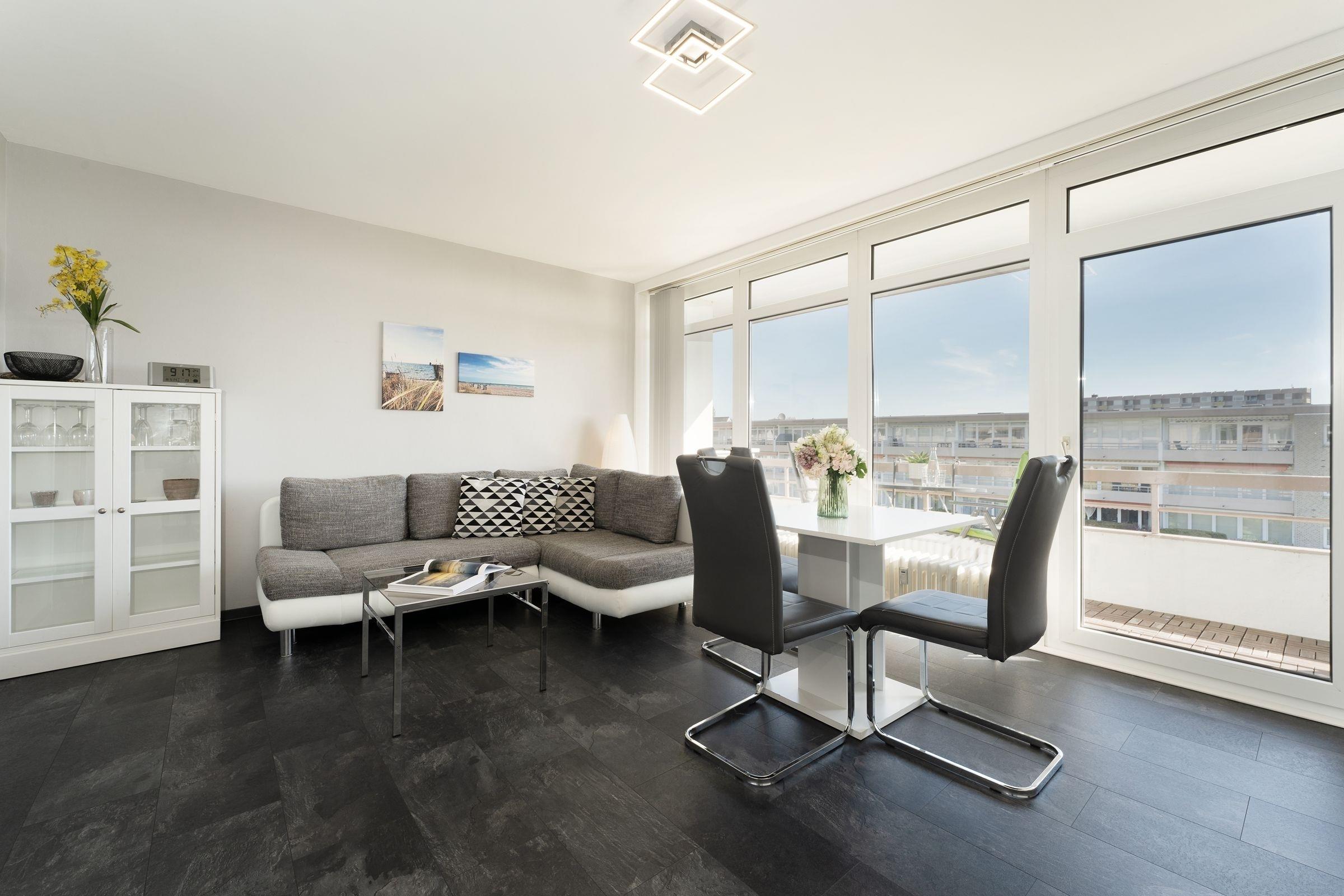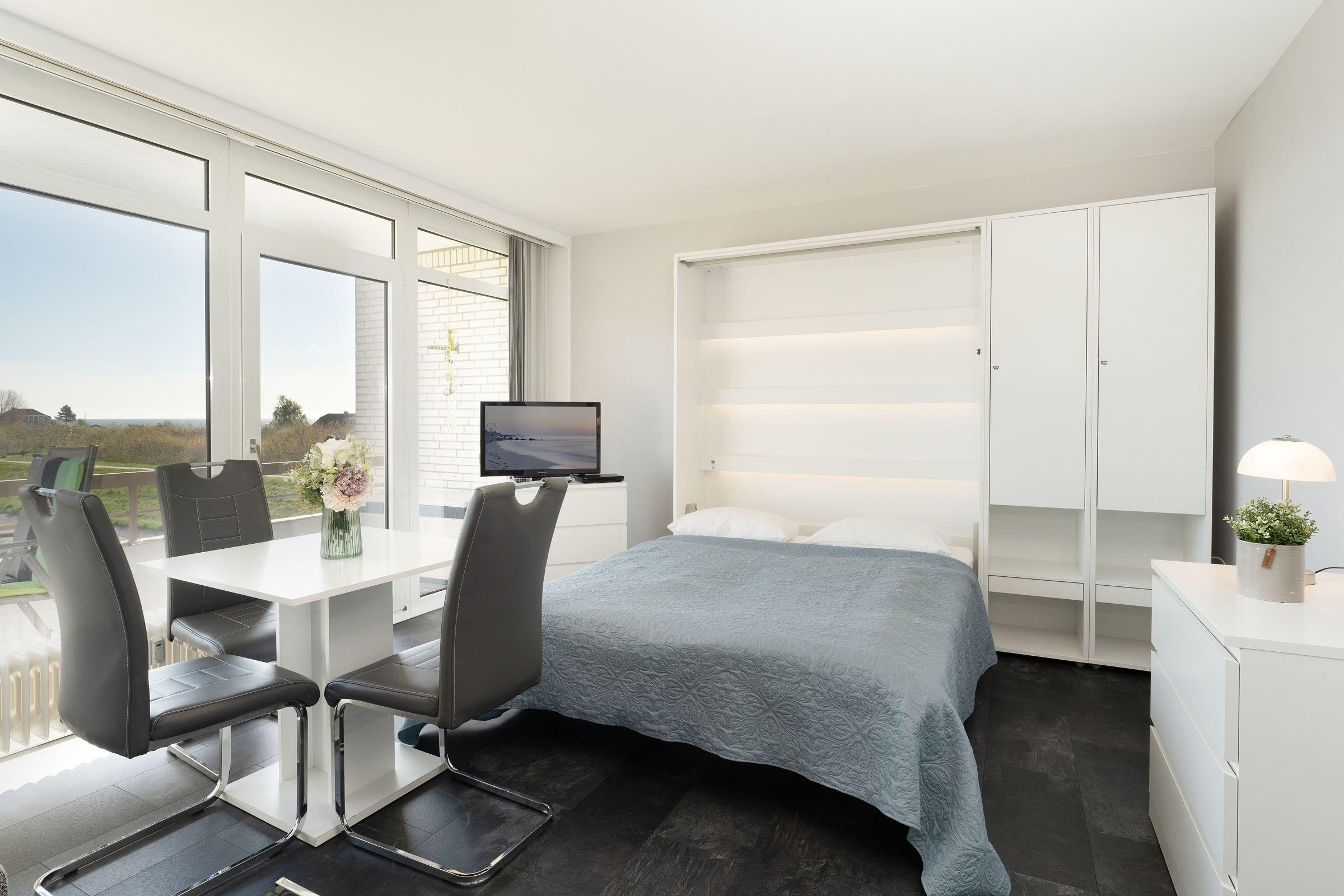 Für alles ist gesorgt! In der gut ausgestatteten, separaten Küche können Sie sich nach Herzenslust Ihre Lieblingsmahlzeiten zubereiten. Ein 4-Platten-Cerankochfeld, eine Mikrowelle, ein Kühlschrank, ein Backofen und eine Kaffeemaschine machen die Ausstattung perfekt. Das Wohn-/Schlafzimmer ist nicht nur funktional sondern auch gemütlich. Ein Schlafsofa und ein Schrankbett lassen sich mit wenigen Handgriffen in gemütliche Nachtlager umwandeln (je 1 Matratze 160x200 cm). Der Meerblick ist einfach atemberaubend! Alternativ bietet der Fernseher weitere Unterhaltung. Sie mögen es dunkel? Ziehen Sie dafür einfach die Vertikallamellen vor. Um morgens gut in den Tag zu starten, können Sie wahlweise mit dem Radio oder dem CD Player Ihrer Lieblingsmusik lauschen. Der ca. 5 m² große Balkon mit bequemer Möblierung lädt zum Verweilen ein.