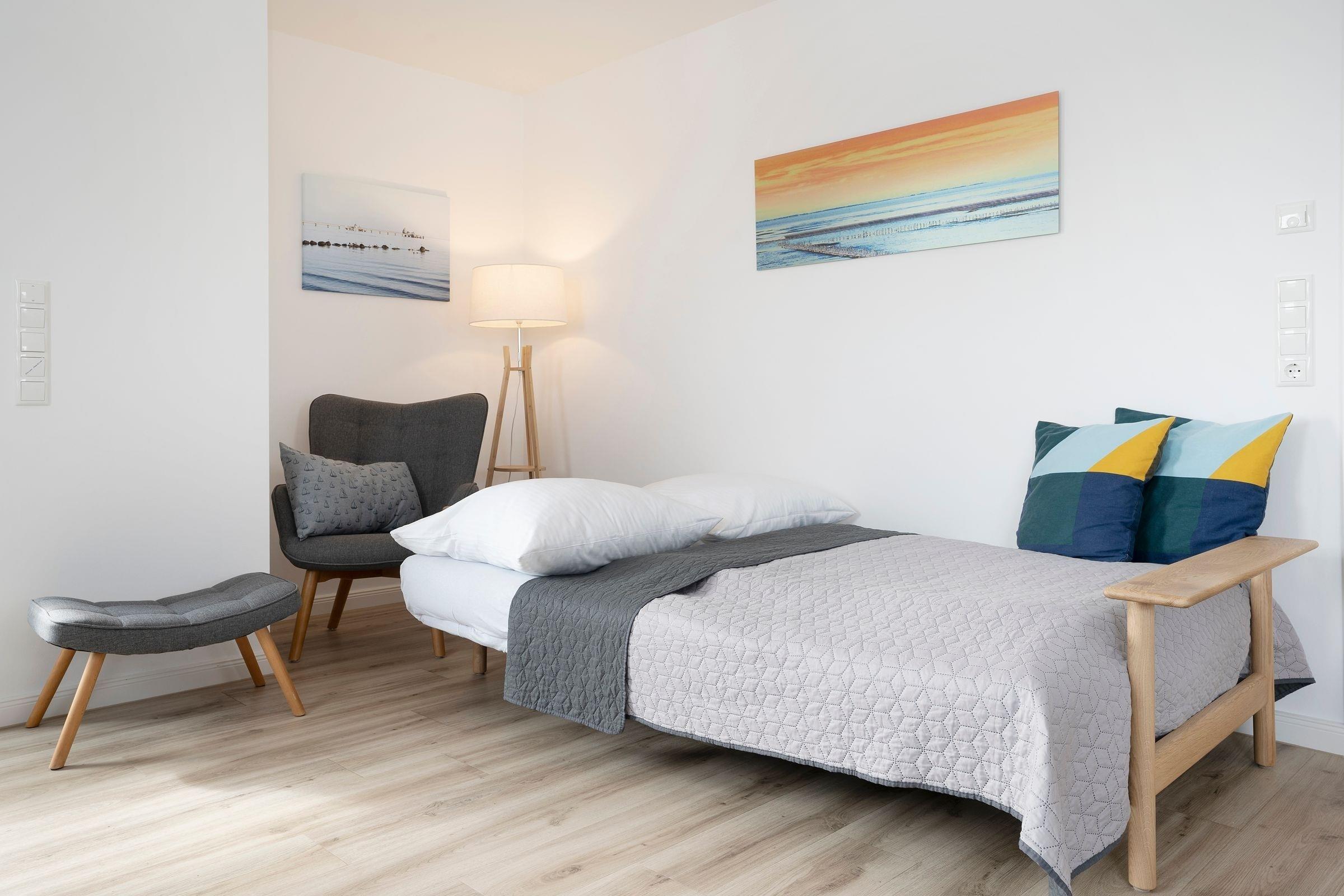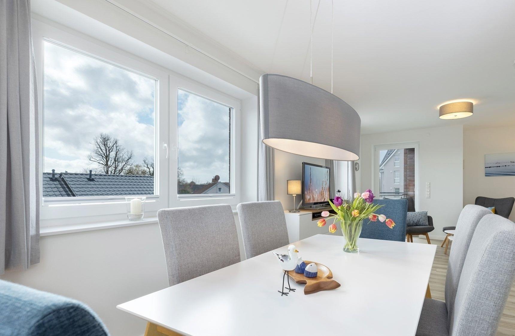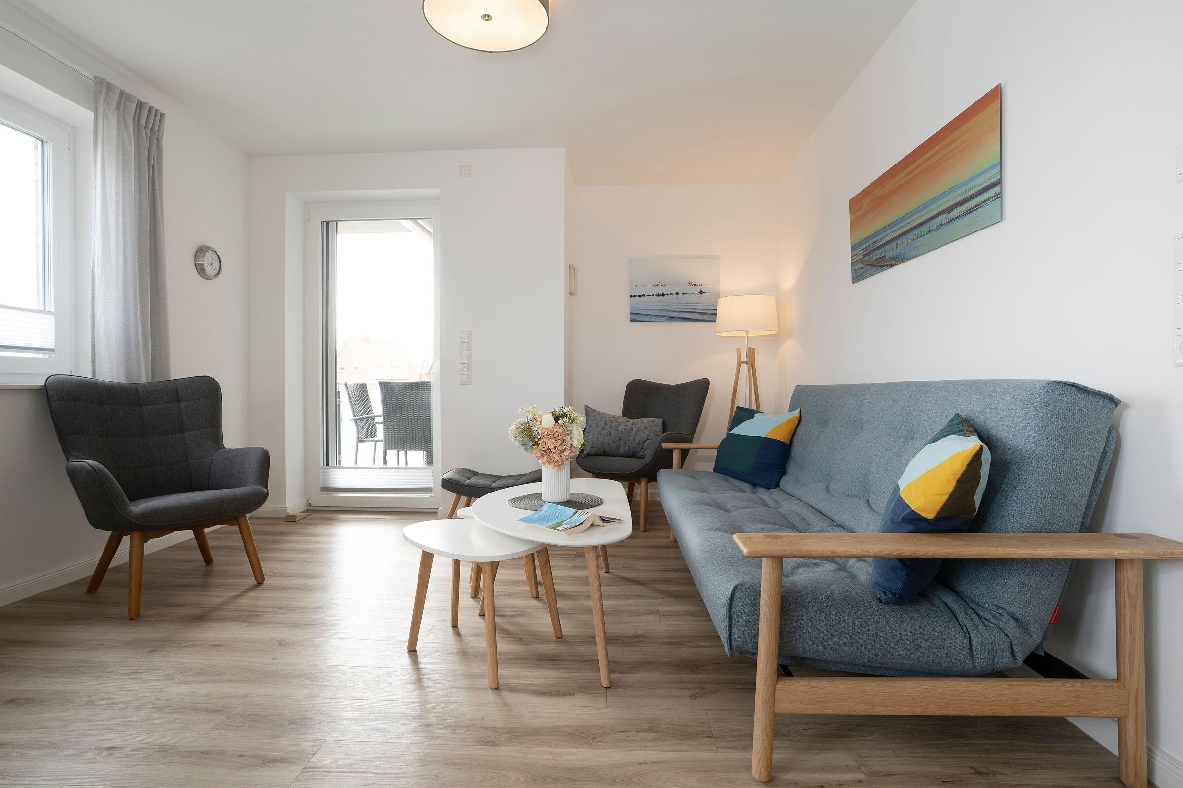Vom Flur mit Garderobe, Gäste WC und Abstellkammer betreten Sie das lichtdurchflutete Wohn-/Esszimmer mit Balkonzugang. Hier haben Sie ausreichend Platz für gesellige Spieleabende oder gemütliche Stunden auf dem Sofa mit Schlaffunktion (Liegefläche ca. 140x200 cm) vor dem Fernsehgerät. Eine Fußbodenheizung sorgt in allen Räumen für behagliche Wärme vor allem in der kalten Jahreszeit. Der Balkon ist möbliert und eine Markise spendet bei Bedarf Schatten. Ein schmackhaftes Mittag- oder Abendessen lässt sich in der offenen Küche unkompliziert zubereiten, denn hier finden Sie einen Herd mit 4 Ceran-Kochfeldern und Backofen, Geschirrspüler, Mikrowelle, Kühl-Gefrierkombination, Mixer, Pürierstab, Eierkocher, Kaffeemaschine, Toaster und Wasserkocher. Im hinteren Teil der Wohnung lädt Sie das Hauptschlafzimmer mit Doppelbett (2x 90x200 cm), Kleiderschrank und TV zum Träumen und Entspannen ein. Auch das zweite Schlafzimmer mit 2 Einzelbetten (2x 90x200 cm) verfügt über Stauraum für die Urlaubsgarderobe, sowie ein TV Gerät. Das Tageslichtbad mit bodentiefer Dusche, Fußboden- und Handtuchheizung, sowie Waschmaschine vervollständigt diese schöne Ferienwohnung. Ein kostenloser WLAN Anschluss ist verfügbar.