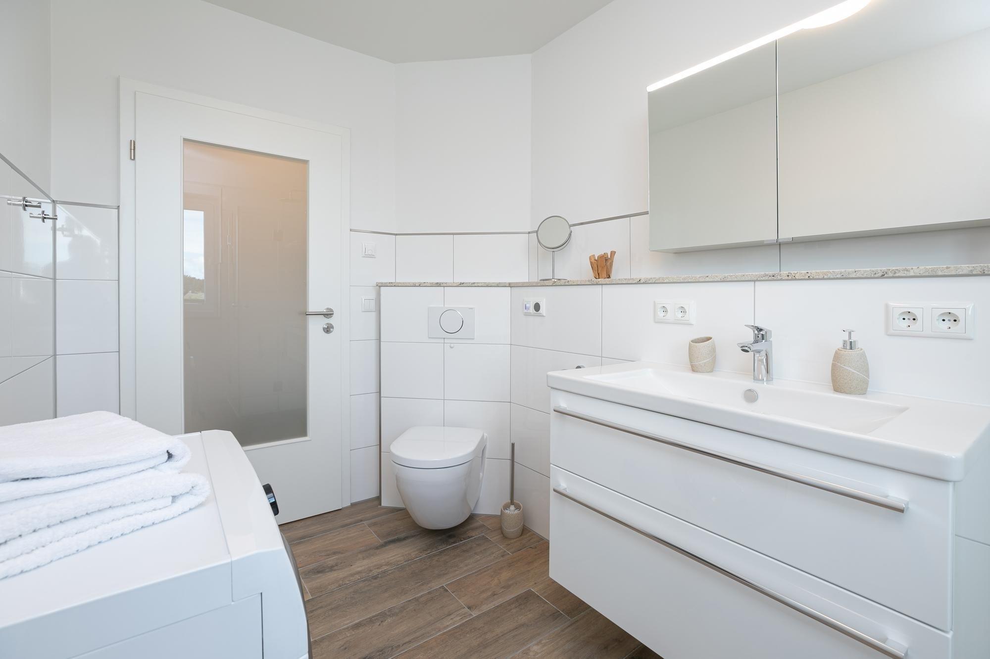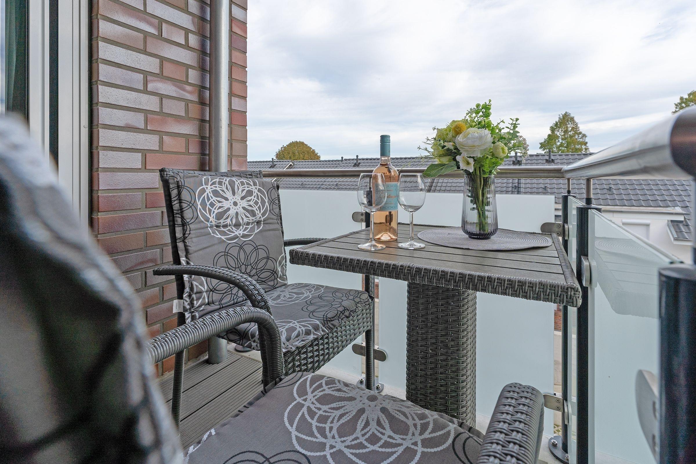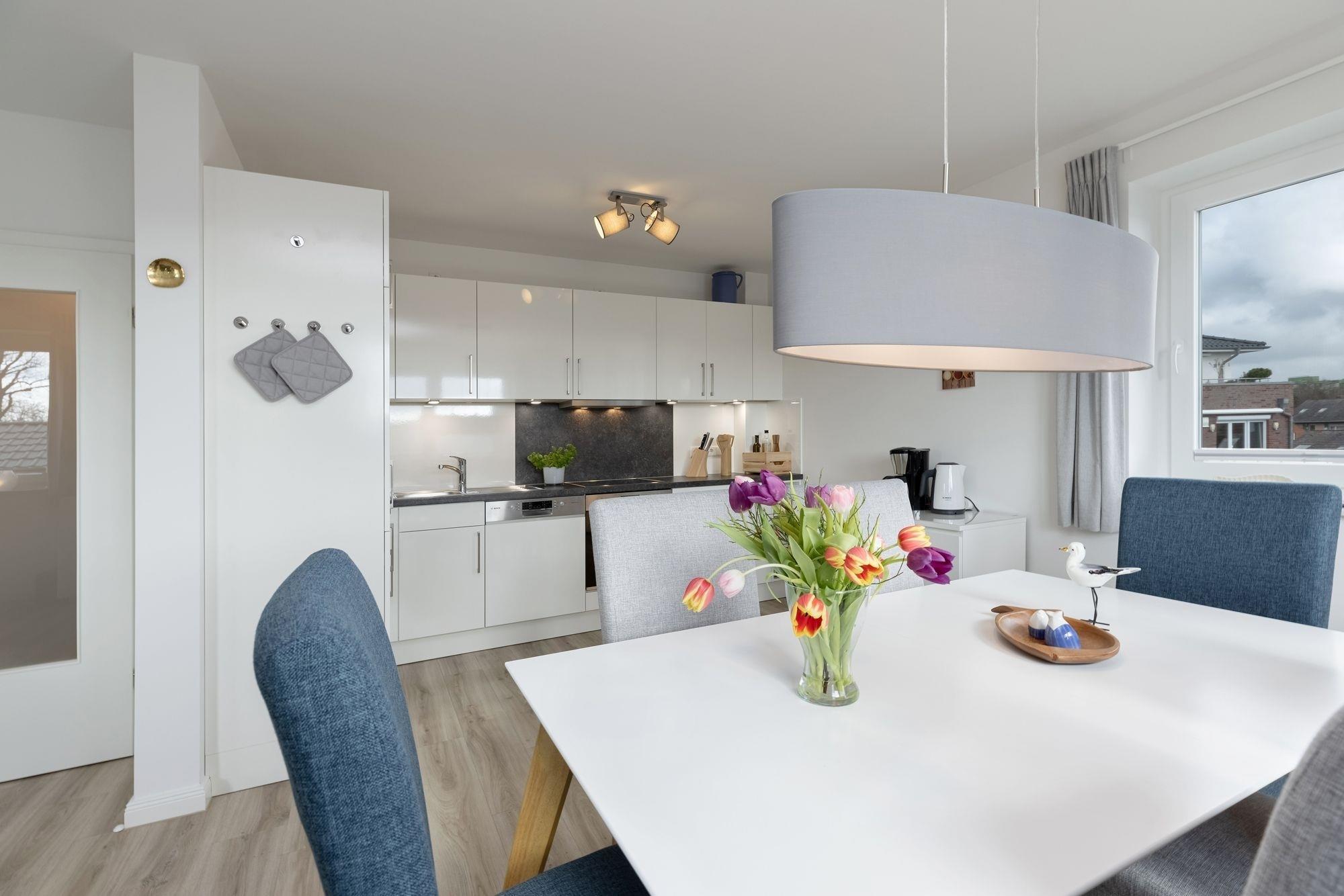Vom Flur mit Garderobe, Gäste WC und Abstellkammer betreten Sie das lichtdurchflutete Wohn-/Esszimmer mit Balkonzugang. Hier haben Sie ausreichend Platz für gesellige Spieleabende oder gemütliche Stunden auf dem Sofa mit Schlaffunktion (Liegefläche ca. 140x200 cm) vor dem Fernsehgerät. Eine Fußbodenheizung sorgt in allen Räumen für behagliche Wärme vor allem in der kalten Jahreszeit. Der Balkon ist möbliert und eine Markise spendet bei Bedarf Schatten. Ein schmackhaftes Mittag- oder Abendessen lässt sich in der offenen Küche unkompliziert zubereiten, denn hier finden Sie einen Herd mit 4 Ceran-Kochfeldern und Backofen, Geschirrspüler, Mikrowelle, Kühl-Gefrierkombination, Mixer, Pürierstab, Eierkocher, Kaffeemaschine, Toaster und Wasserkocher. Im hinteren Teil der Wohnung lädt Sie das Hauptschlafzimmer mit Doppelbett (2x 90x200 cm), Kleiderschrank und TV zum Träumen und Entspannen ein. Auch das zweite Schlafzimmer mit 2 Einzelbetten (2x 90x200 cm) verfügt über Stauraum für die Urlaubsgarderobe, sowie ein TV Gerät. Das Tageslichtbad mit bodentiefer Dusche, Fußboden- und Handtuchheizung, sowie Waschmaschine vervollständigt diese schöne Ferienwohnung. Ein kostenloser WLAN Anschluss ist verfügbar.