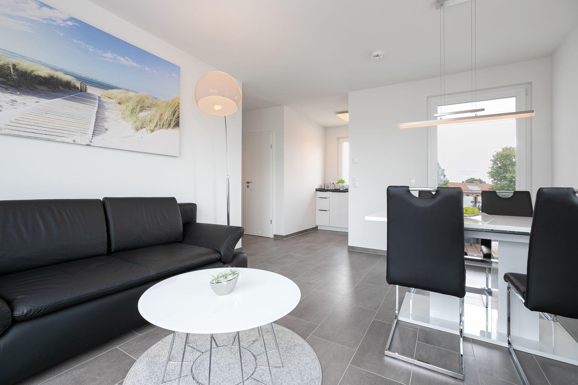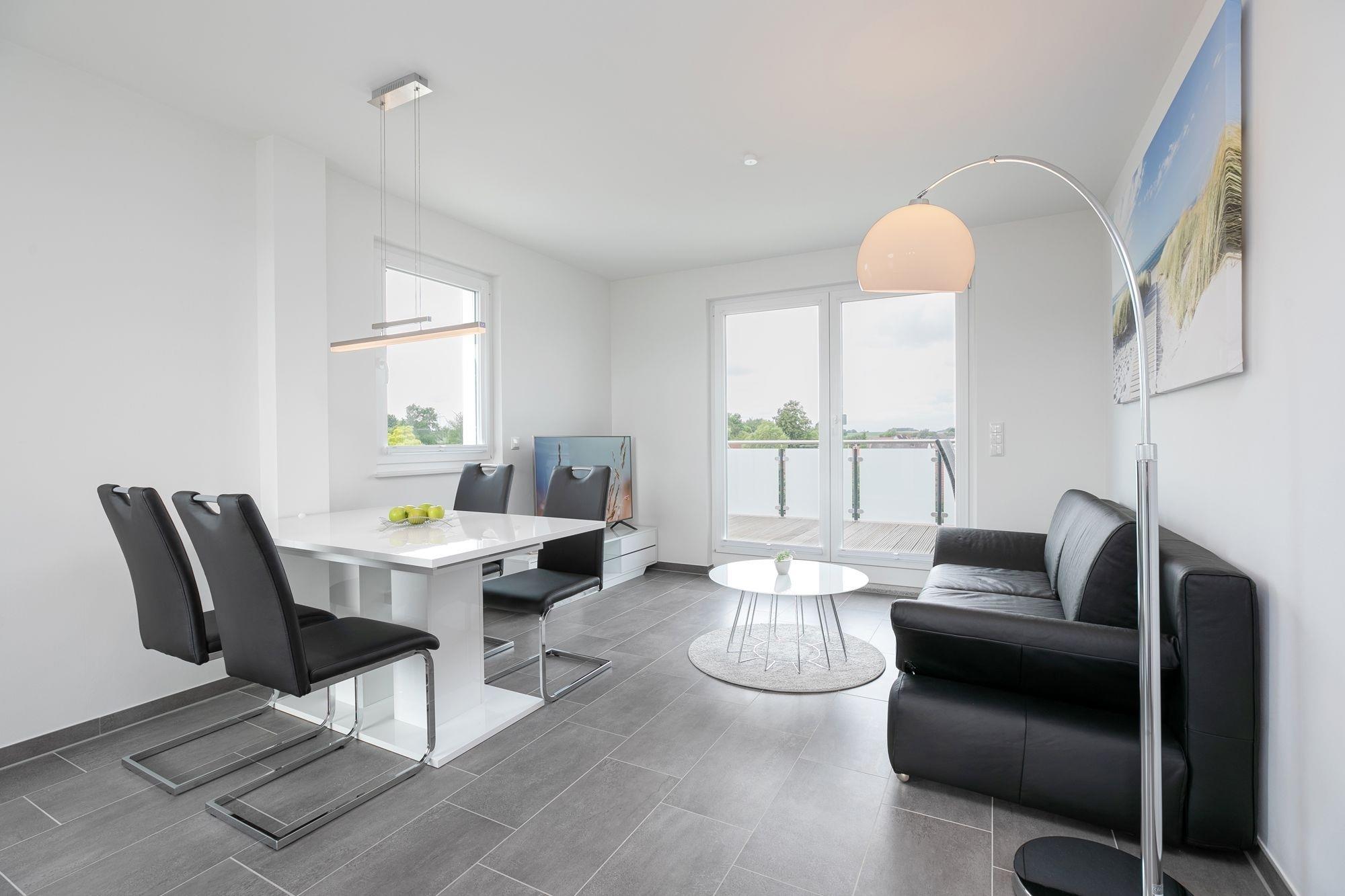 Im gemütlichen Wohnbereich können Sie nicht nur unterhaltsame Stunden, zum Beispiel vor dem Fernseher verbringen, sondern sich auch ein gemütliches Nachtlager auf dem Schlafsofa (ca. 150x200 cm Liegefläche) einrichten. Die separate Küche ist modern und komfortabel ausgestattet und punktet mit einem 4 Feld-Induktionsherd und Backofen, Mikrowelle, Kühlschrank mit Gefrierfach, Spülmaschine, Kaffeemaschine, Wasserkocher und Toaster. Im großen Doppelbett (2x 90x200 cm) im Schlafzimmer können Sie sich in die Kissen fallen lassen, ein Kleiderschrank sorgt für ausreichend Stauraum für Ihre Garderobe. Auch hier gibt es ein TV-Gerät. Keine Wünsche offen bleiben auch im Tageslichtbad mit bodentiefer Dusche, Fußboden- und Handtuchheizung und Fön. Balkon und Dachterrasse: In dieser Wohnung haben Sie die doppelte Möglichkeit die gute Ostseeluft zu schnuppern und den Ausblick zu genießen. Im großen Strandkorb legen Sie entspannt die Beine hoch und können in Ihrem Lieblingsbuch schmökern. Ein kostenloser WLAN Anschluss ist verfügbar.