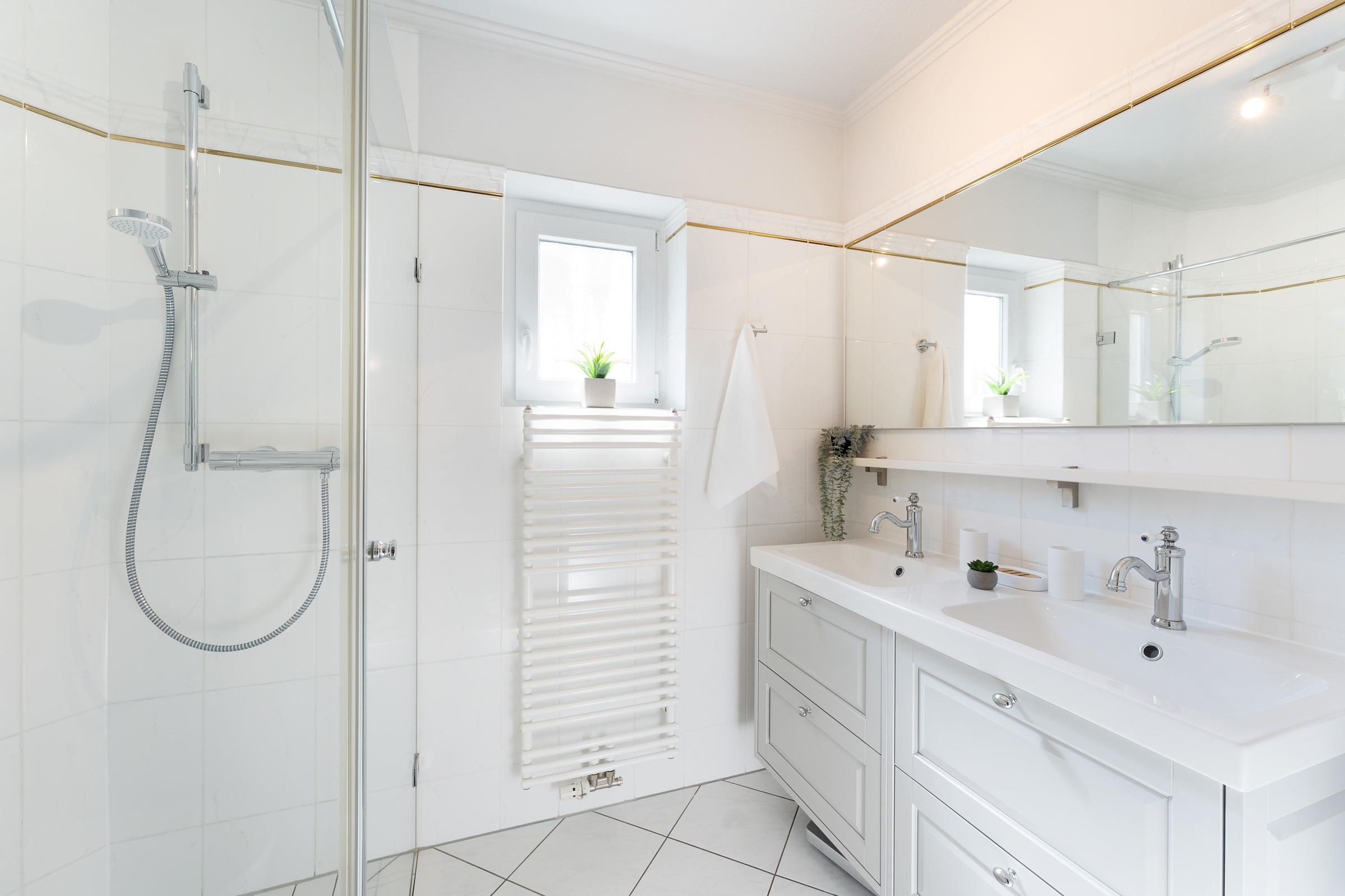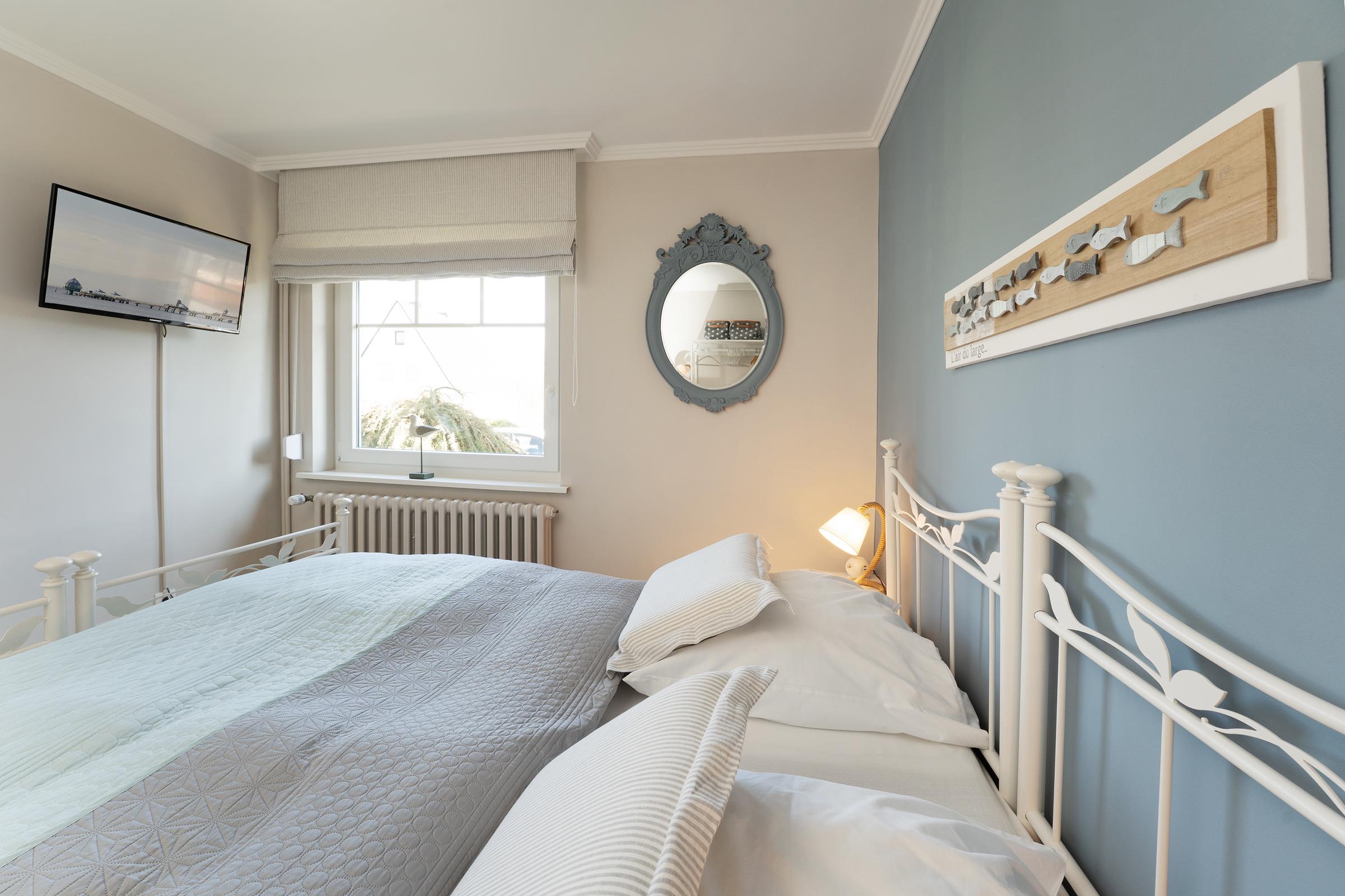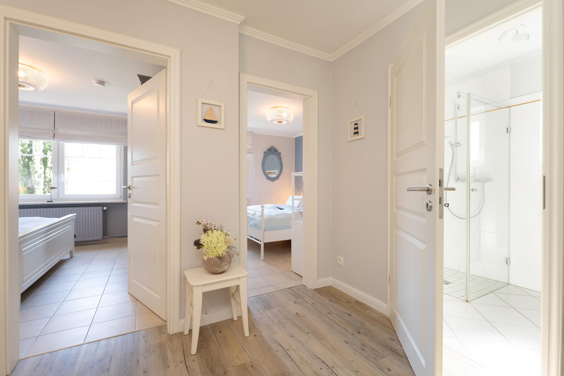 Die Nacht verbringen Sie entspannt im separaten Schlafzimmer in einem einladenden Doppelbett (2x 90x200 cm) mit elektrischen Lattenrosten. Im Kleiderschrank ist ausreichend Platz für Ihre Urlaubsgarderobe vorhanden. Über elektrische Außenrolläden lässt sich dieser Raum abdunkeln. Das zweite Schlafzimmer ist mit zwei gemütlichen Einzelbetten (je 90x200 cm), einem Kleiderschrank und einem weiteren Flat-TV ausgestattet. Rollos sorgen hier für angenehme Nachtruhe. Ein besonderes Highlight ist der starseed®-Sternenhimmel an der Decke der beiden Schlafzimmer. Beim Anblick des kunstvoll gestalteten Sternenbildes, welches abends erscheint, lässt es sich umso besser nächtigen. Nach einem langen Tag am Strand können Sie in der ebenerdigen Dusche im Tageslichtbad die letzten Sandkörner abspülen und einen ereignisreichen Tag erfrischt ausklingen lassen.