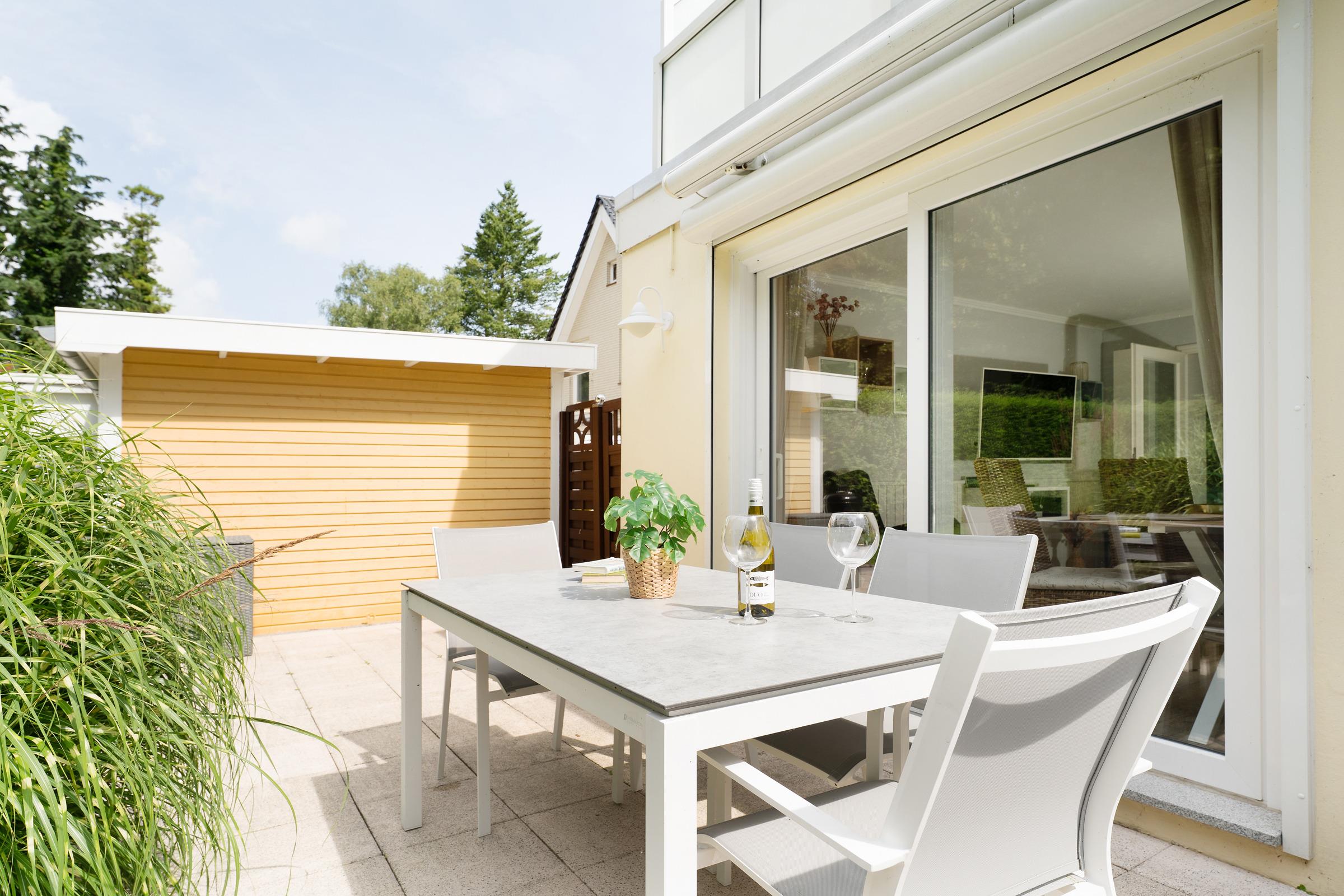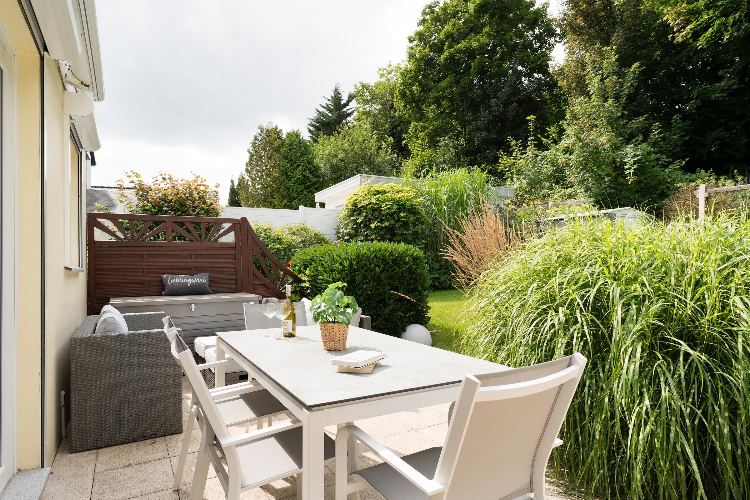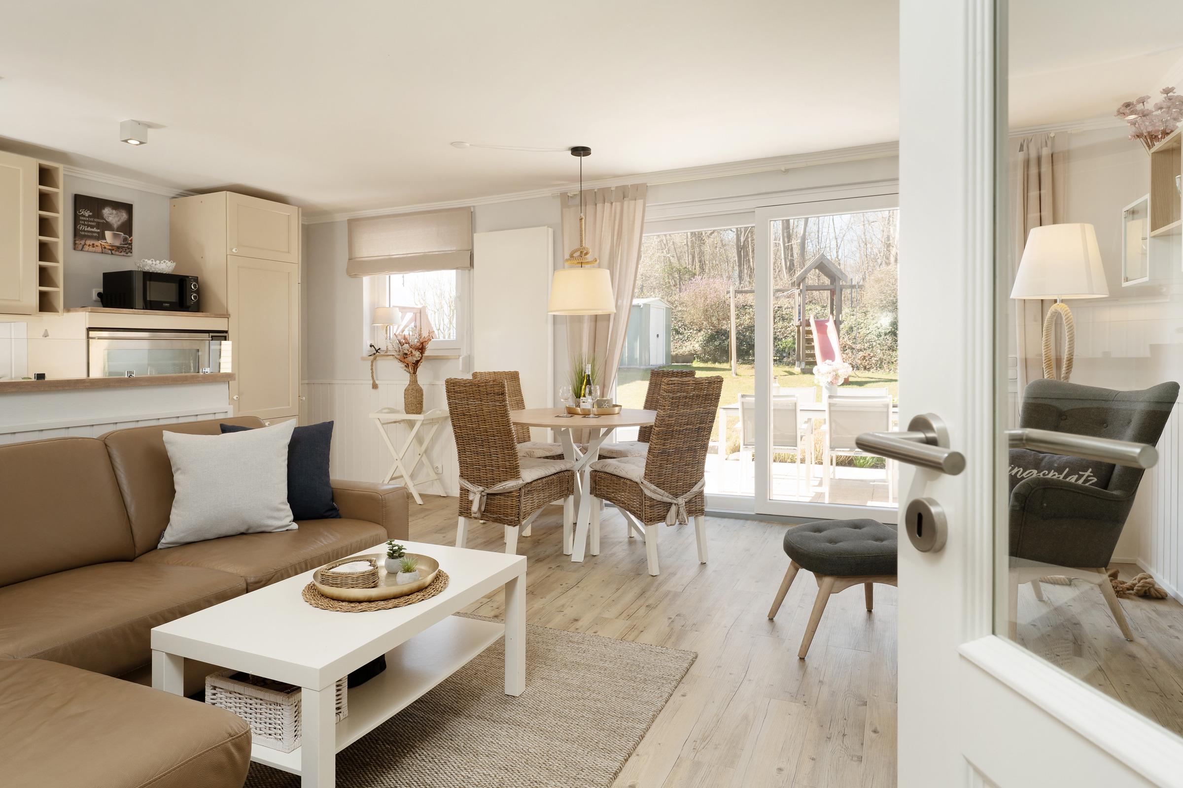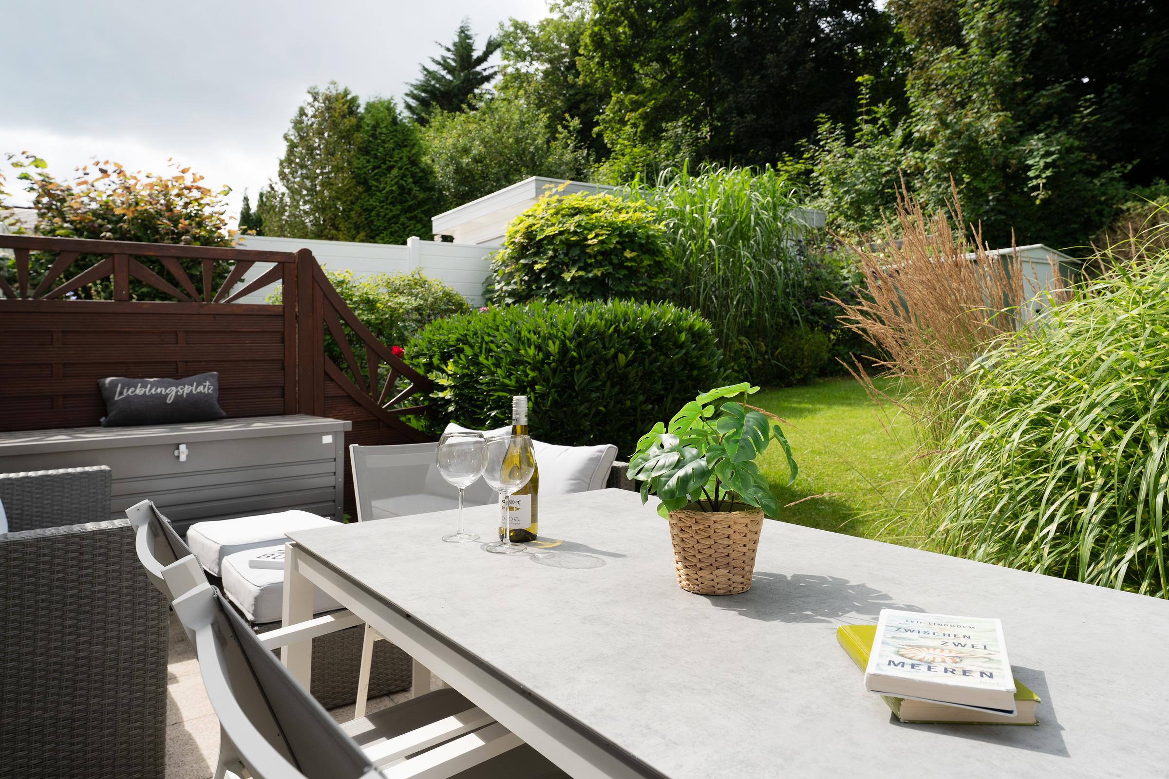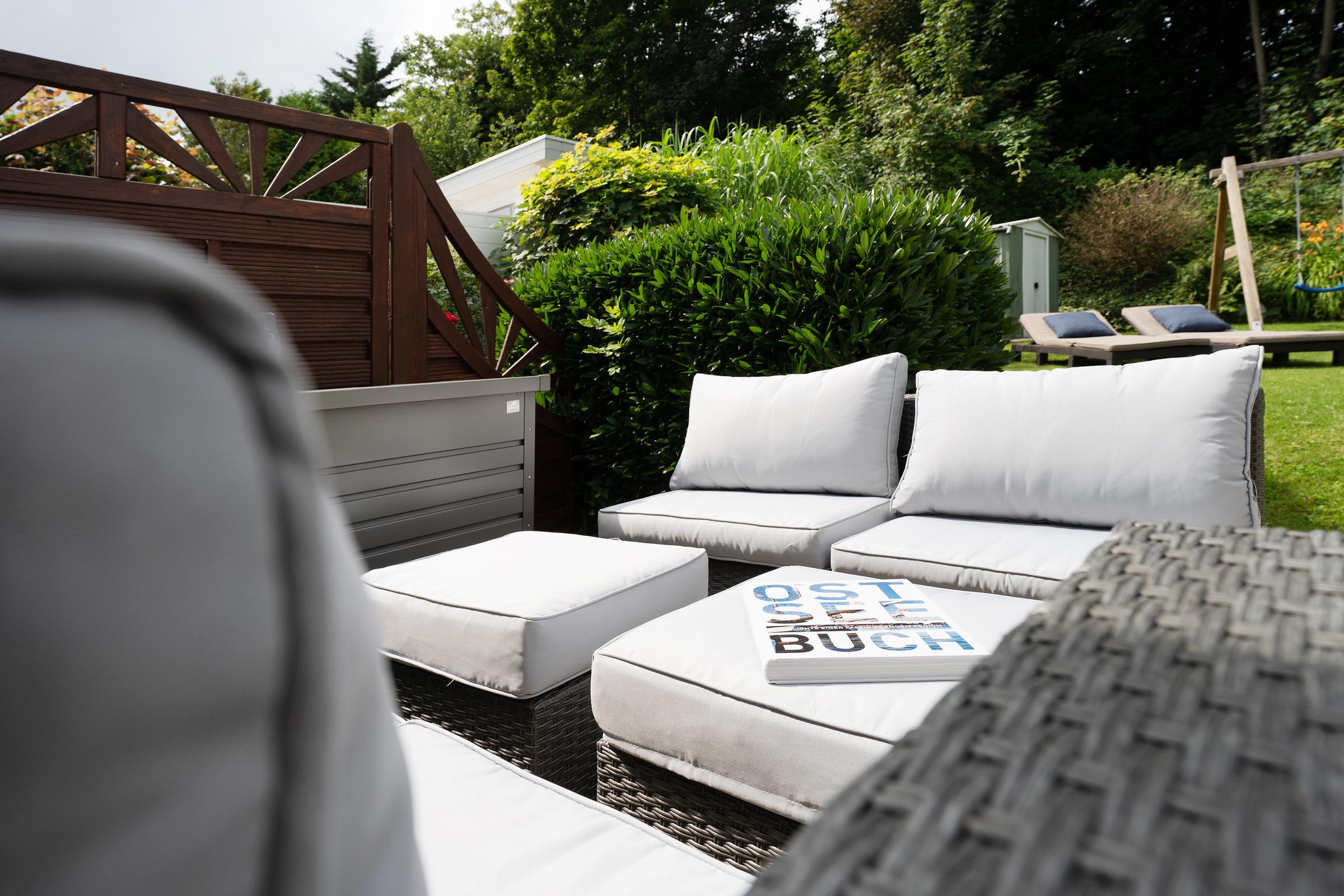 Lassen Sie sich von der maritimen Gemütlichkeit des offenen Wohnbereiches einfangen und legen Sie auf dem komfortablen Ecksofa entspannt die Füße hoch. Wenn Sie mögen, unterhält Sie der Flat-TV mit DVD-Player. Natürlich verfügt diese Wohnung über einen kostenlosen WLAN-Zugang, so dass Sie auch im Urlaub erreichbar sind. Die offene, voll ausgestattete Küche mit angrenzendem Essplatz fügt sich charmant in den Wohnbereich ein - optimal, um viel Zeit mit der Familie zu verbringen. Durch die große Terrassentür gelangen Sie auf Ihre eigene möblierte Terrasse, auf der Sie bei einem guten Glas Wein die Sonne und die gesunde Ostseeluft genießen können. Während die kleinen Urlaubsgäste sich an dem Spielturm im Garten ausprobieren, können Sie auf dem Steingrill für Abwechslung auf dem Speiseplan sorgen. Eine Markise schützt Sie bei Bedarf vor unerwünschten Sonnenstrahlen.