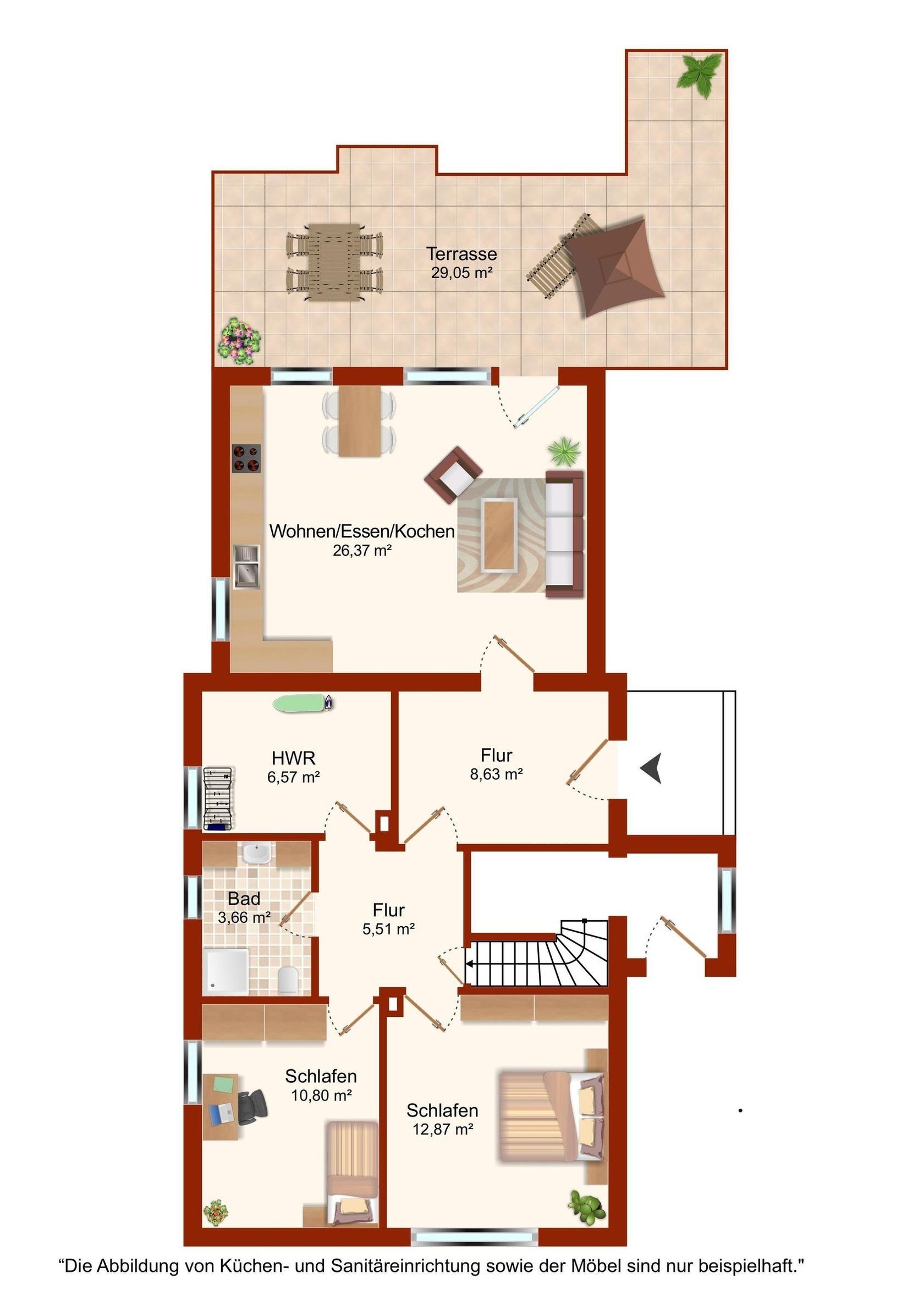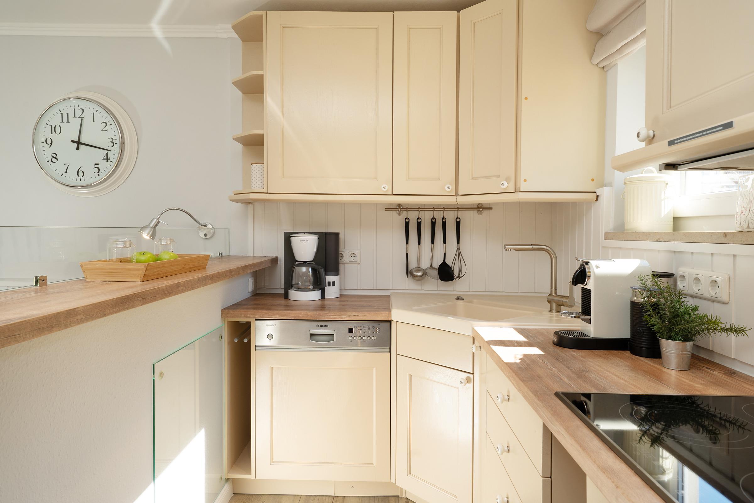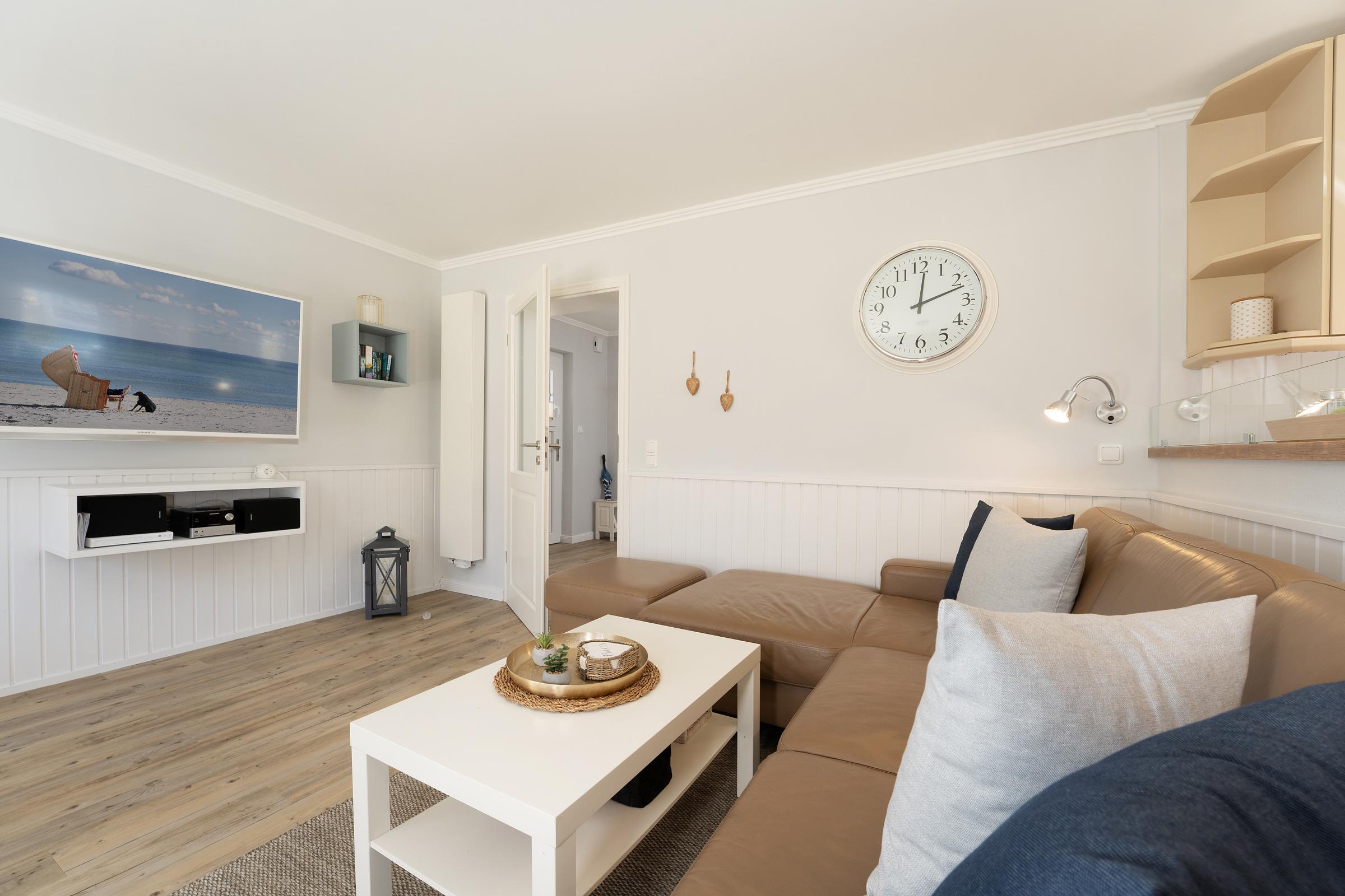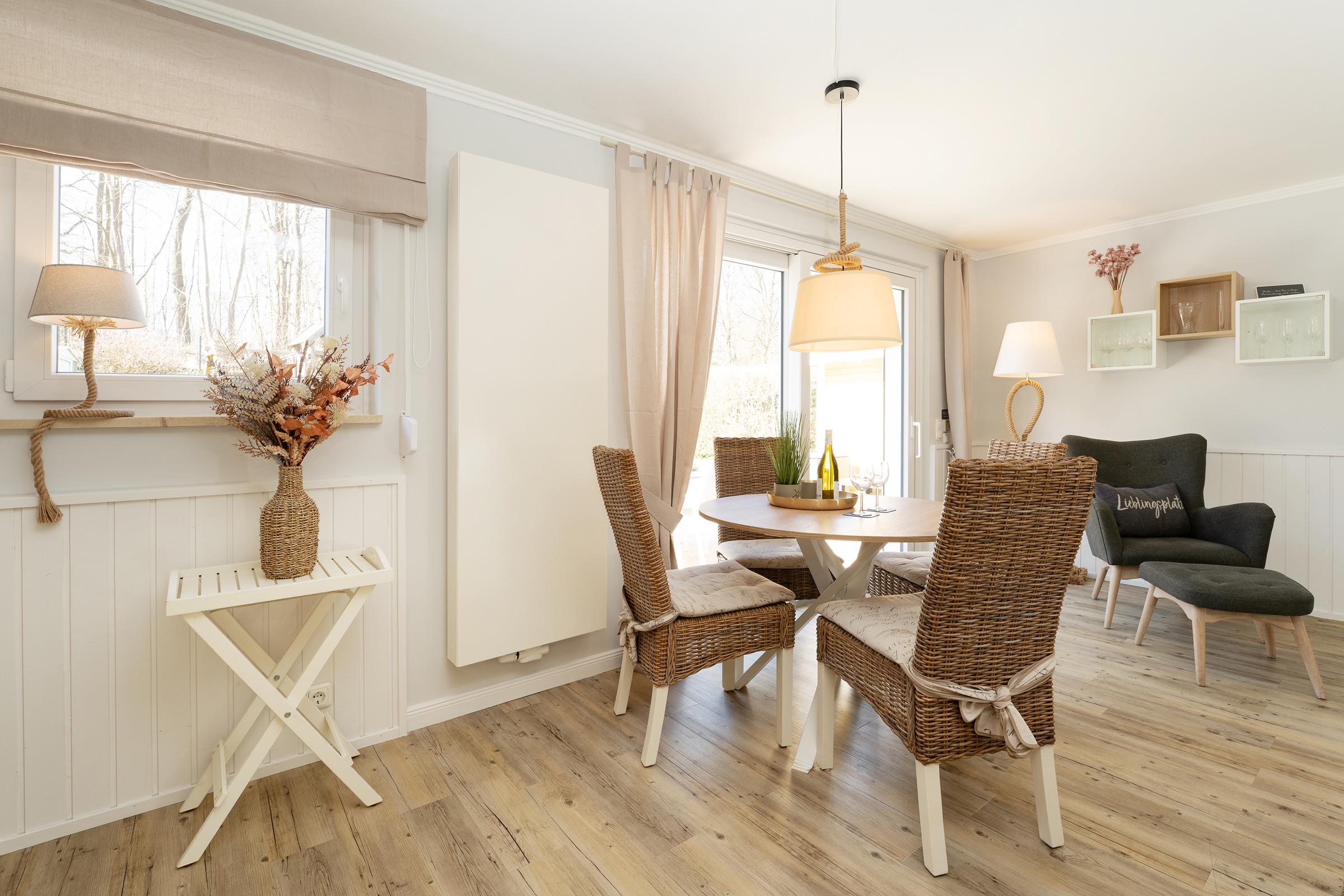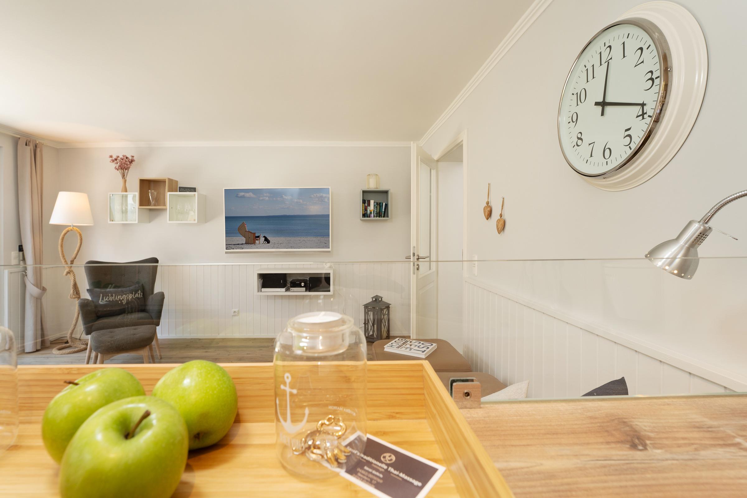Lassen Sie sich von der maritimen Gemütlichkeit des offenen Wohnbereiches einfangen und legen Sie auf dem komfortablen Ecksofa entspannt die Füße hoch. Wenn Sie mögen, unterhält Sie der Flat-TV mit DVD-Player. Natürlich verfügt diese Wohnung über einen kostenlosen WLAN-Zugang, so dass Sie auch im Urlaub erreichbar sind. Die offene, voll ausgestattete Küche mit angrenzendem Essplatz fügt sich charmant in den Wohnbereich ein - optimal, um viel Zeit mit der Familie zu verbringen. Durch die große Terrassentür gelangen Sie auf Ihre eigene möblierte Terrasse, auf der Sie bei einem guten Glas Wein die Sonne und die gesunde Ostseeluft genießen können. Während die kleinen Urlaubsgäste sich an dem Spielturm im Garten ausprobieren, können Sie auf dem Steingrill für Abwechslung auf dem Speiseplan sorgen. Eine Markise schützt Sie bei Bedarf vor unerwünschten Sonnenstrahlen.