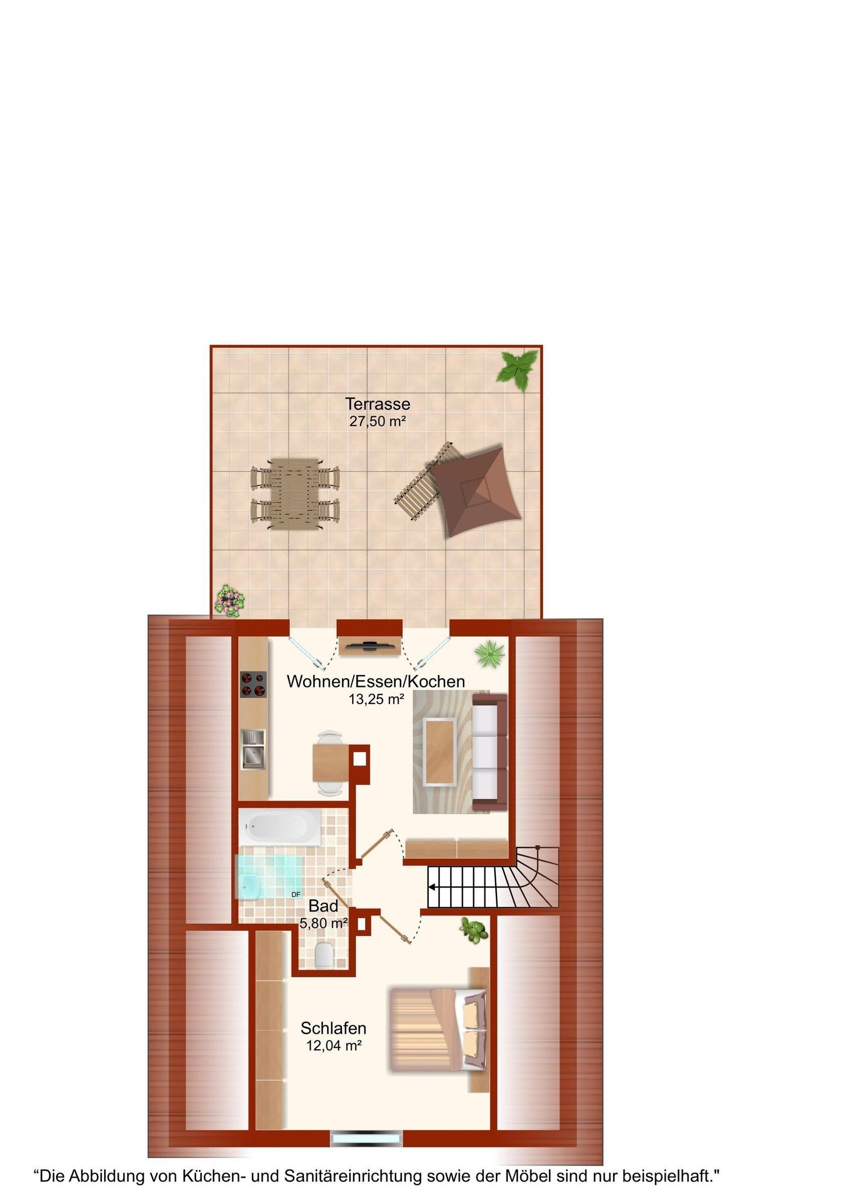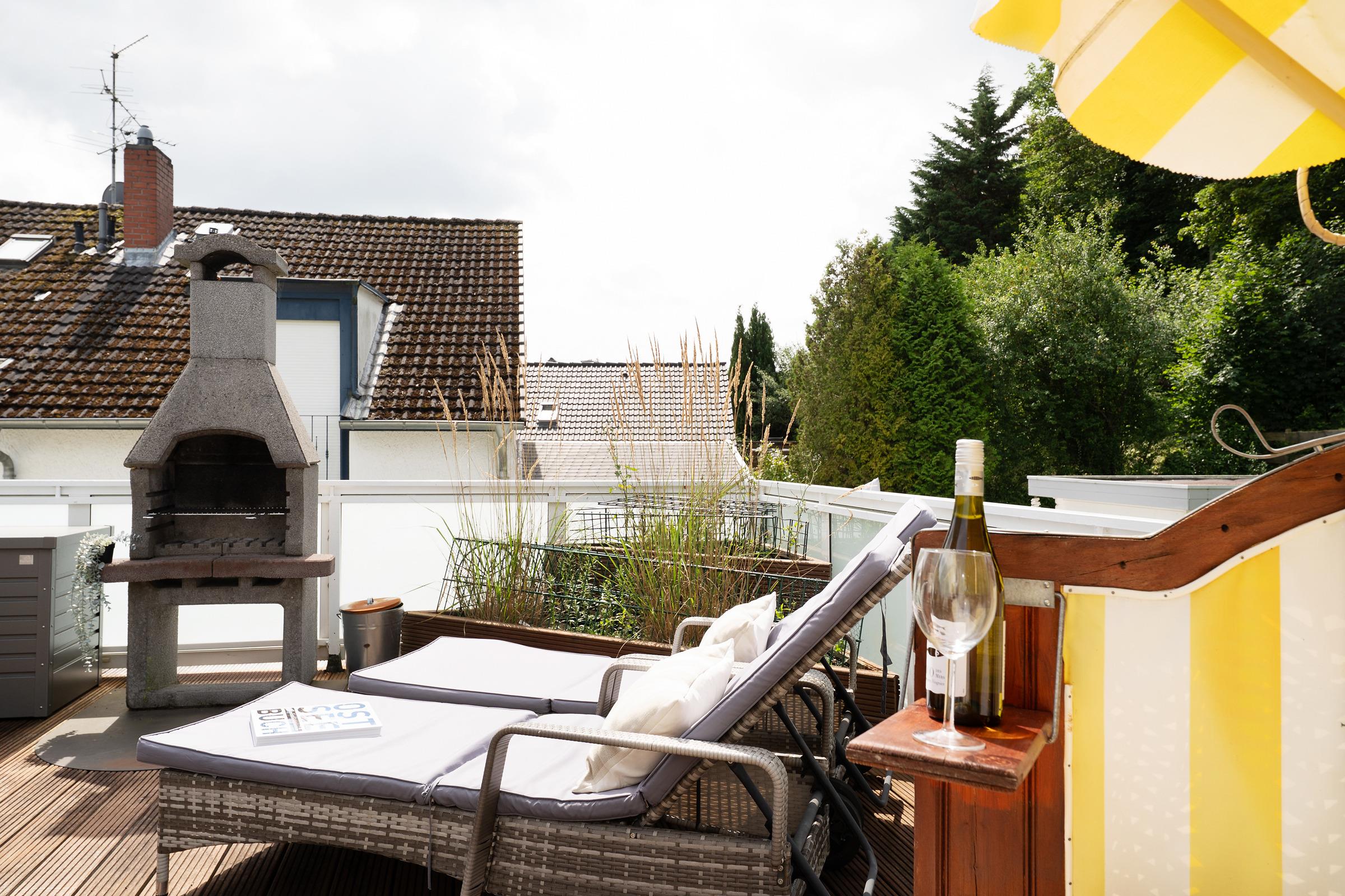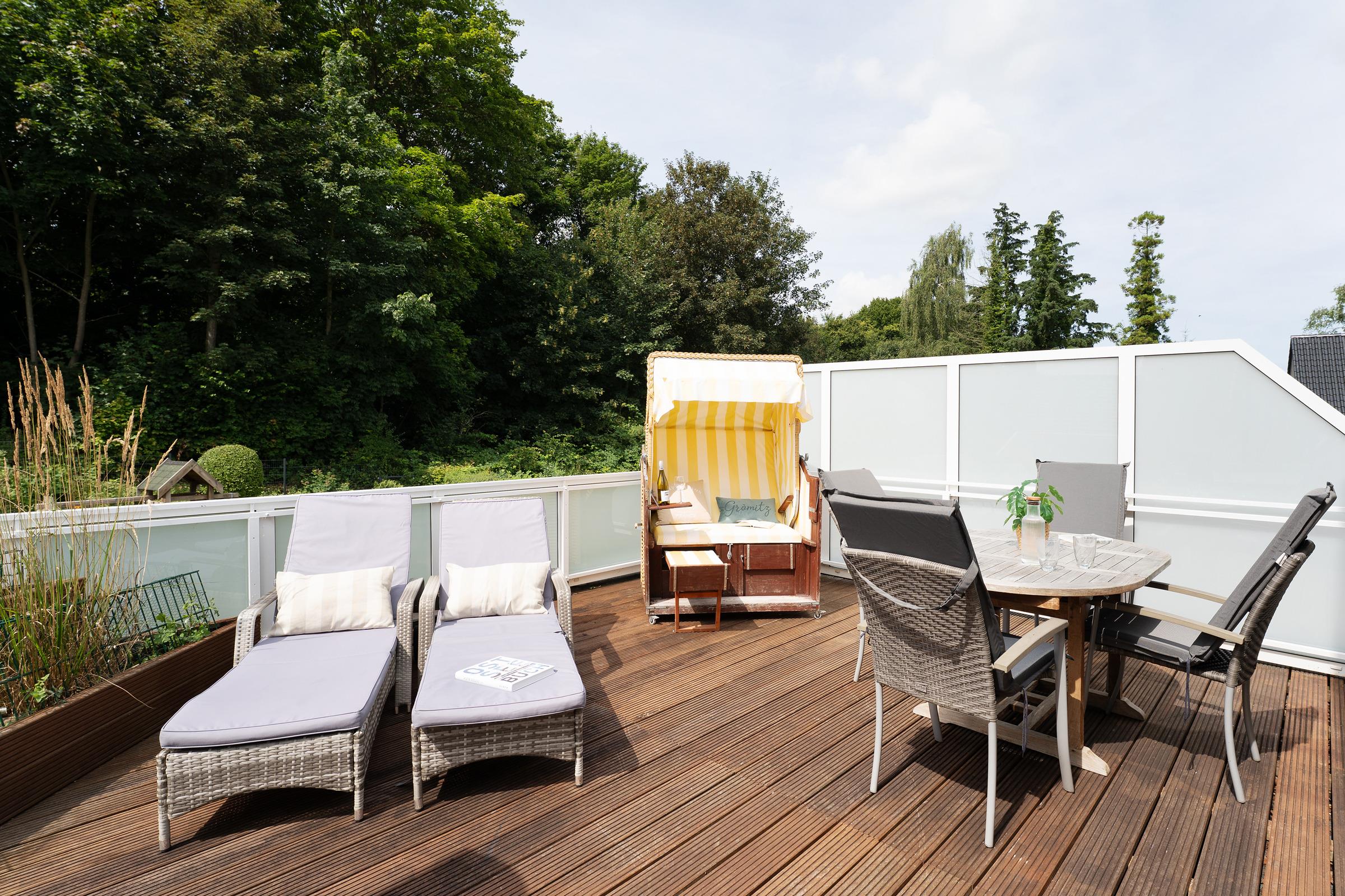 Im hellen und freundlichen Wohnbereich können Sie ungestörte Zweisamkeit genießen. Auch an Regentagen lässt es sich hier gut aushalten, denn ein Flat-TV und ein kostenloser WLAN-Anschluss zum Streamen Ihrer Lieblingsmusik stehen Ihnen zur Verfügung. In der zum Wohnbereich offenen Küche sorgen Sie mühelos für Ihr leibliches Wohl. Dank hochwertiger Ausstattung geht die Zubereitung schmackhafter Köstlichkeiten leicht von der Hand - zum Beispiel eine Kaffeespezialität aus der Nespresso-Kapselmaschine. Ein gemütlicher Essplatz ist ebenfalls integriert. Bei Sonnenschein können Sie Ihre Mahlzeiten aber auch auf der eigenen großzügigen Dachterrasse genießen, bei Bedarf verwandelt diese sich durch eine Markise in ein schattiges Plätzchen. Sonnenliegen, Terrassenmöbel und auch ein Strandkorb bieten vielfältige Rückzugs- und Entspannungsmöglichkeiten. Ein auf dem Steingrill zubereiteter Ostseefisch schmeckt unter freiem Himmel bei einem Glas Wein doppelt gut. Ein Sichtschutz sorgt für ungestörte Urlaubsmomente. Erholung und Ruhe finden Sie im komfortablen Doppelbett (2x 90x200 cm) im separaten Schlafzimmer, das sich angenehm abdunkeln lässt. Ihre Reisegarderobe bringen Sie mühelos in einem geräumigen Kleiderschrank unter. Das zeitlose Tageslichtduschbad rundet die stilvolle Ausstattung dieses Feriendomizils ab.