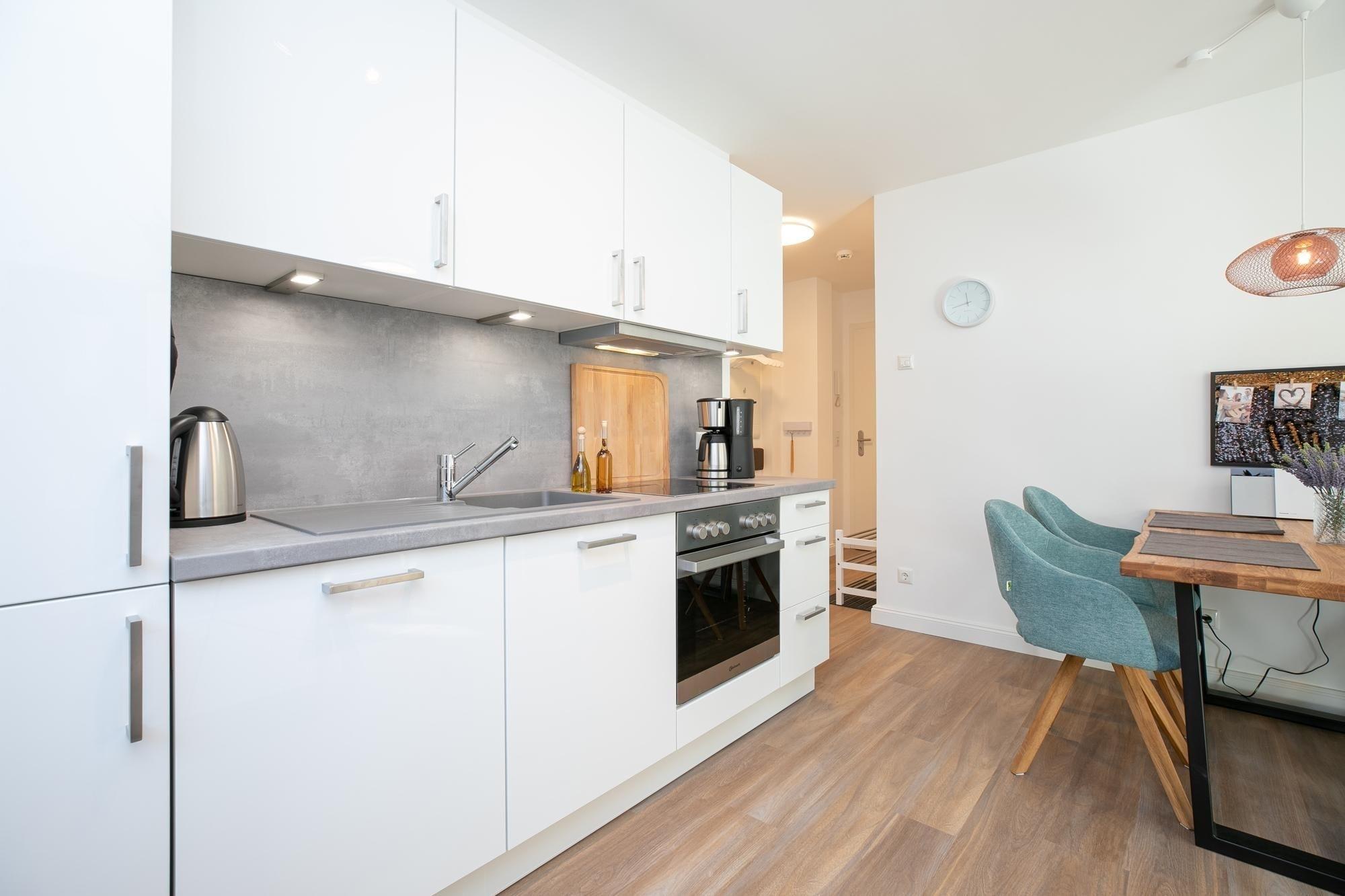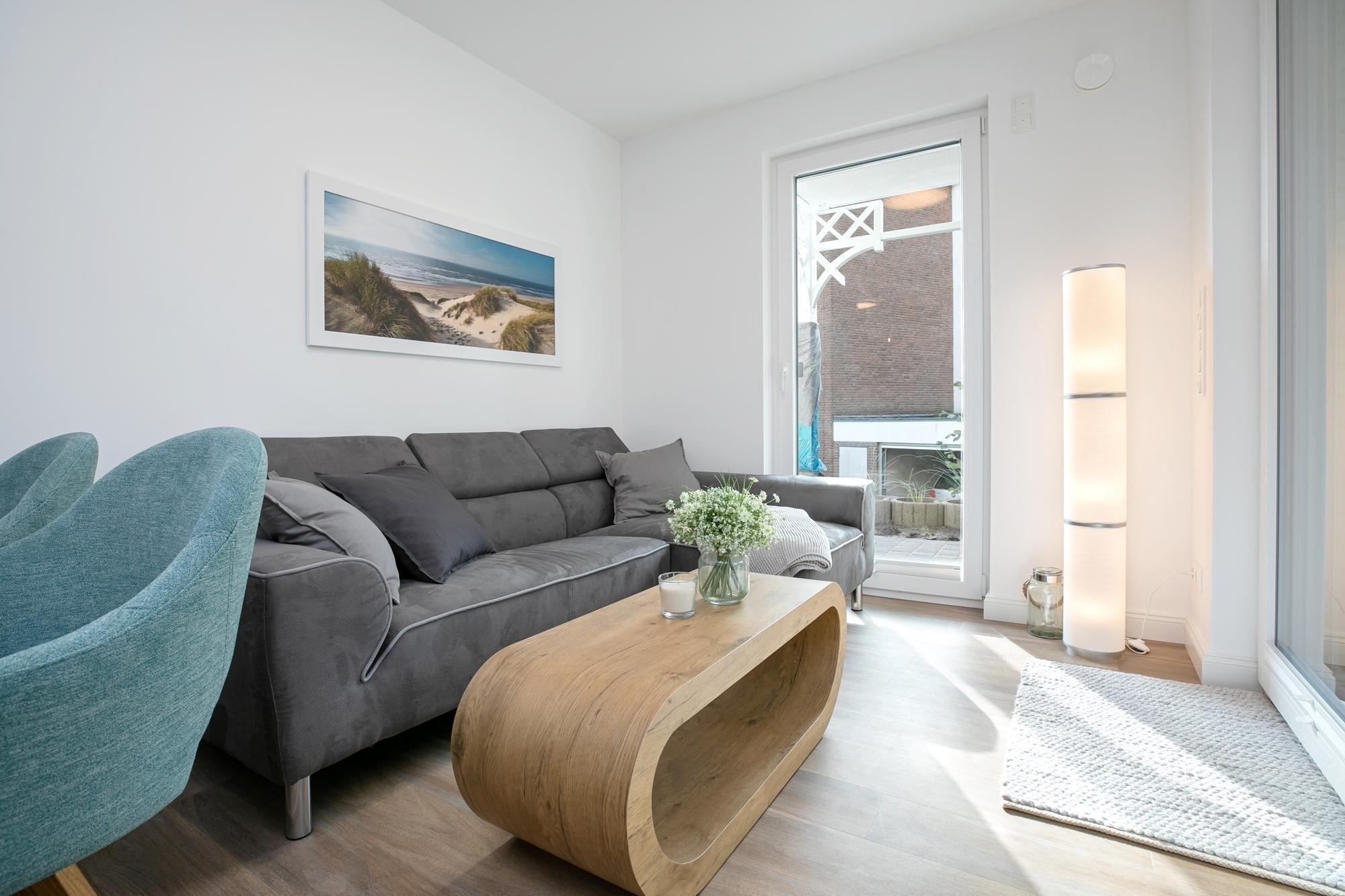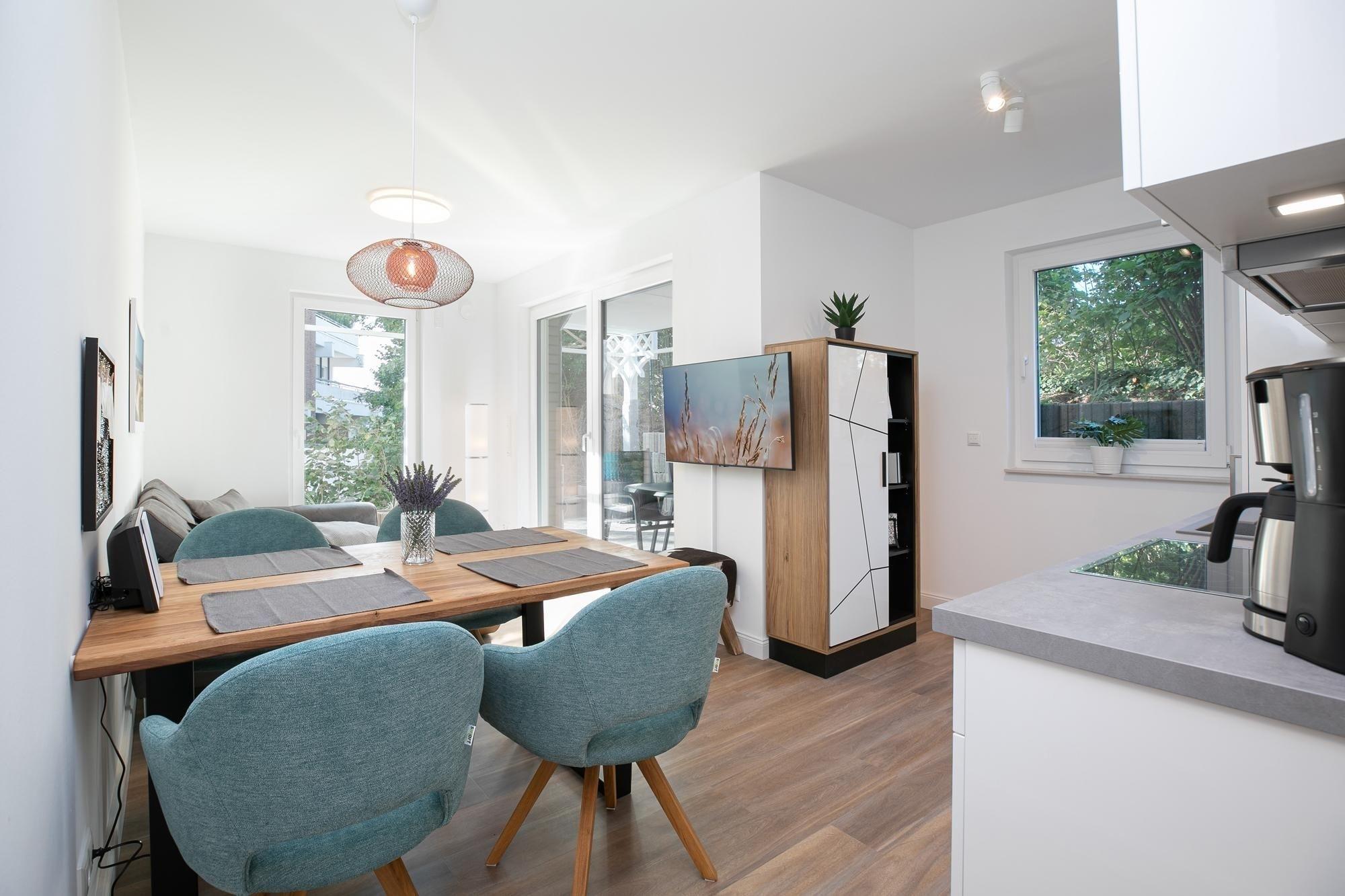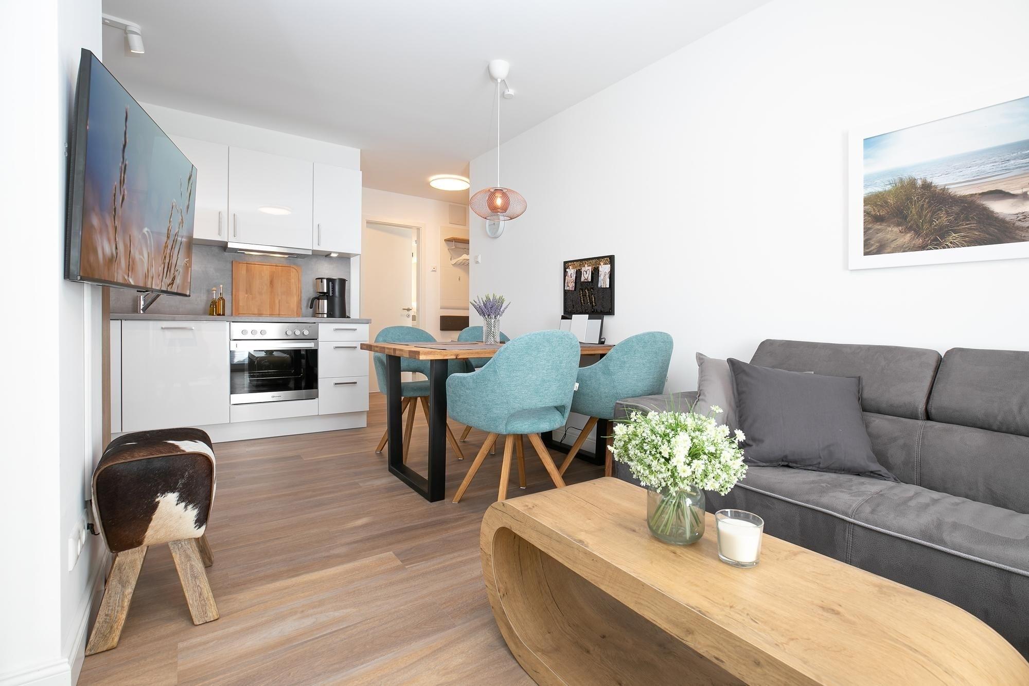 Durch einen kleinen, hellen Flur gelangen Sie in den Wohnbereich mit integrierter Küche. Die geschmackvolle und hochwertige Ausstattung wird Sie überzeugen. Kommen Sie erstmal an und genießen Sie nach der Anreise einen Begrüßungsdrink auf dem gemütlichen Sofa. Lassen Sie Ihren Blick schweifen und planen Sie das Menü für den Abend, dass Sie ohne Mühe in der voll ausgestatteten Küche zaubern können. Am Esstisch können Sie dann bei einem guten Essen den Urlaub einläuten. Ein Flat-TV und ein kostenloser WLAN-Anschluss sorgen an Regentagen für Unterhaltung. Bei Sonnenschein empfehlen wir ein Frühstück auf Ihrer großzügigen, möblierten Terrasse. Auf 15 m² können Sie die Seele baumeln lassen und den Alltag vergessen. Unsere gute Ostseeluft macht müde - lassen Sie sich in die Kissen des komfortablen Boxspringbettes (2x 90x200 cm) fallen und verbringen Sie traumhafte Nächte im abgedunkelten separaten Schlafzimmer. Ein Kleiderschrank bietet viel Platz für Ihre Habseligkeiten. Ein TV Gerät sorgt bei Bedarf für Unterhaltung.