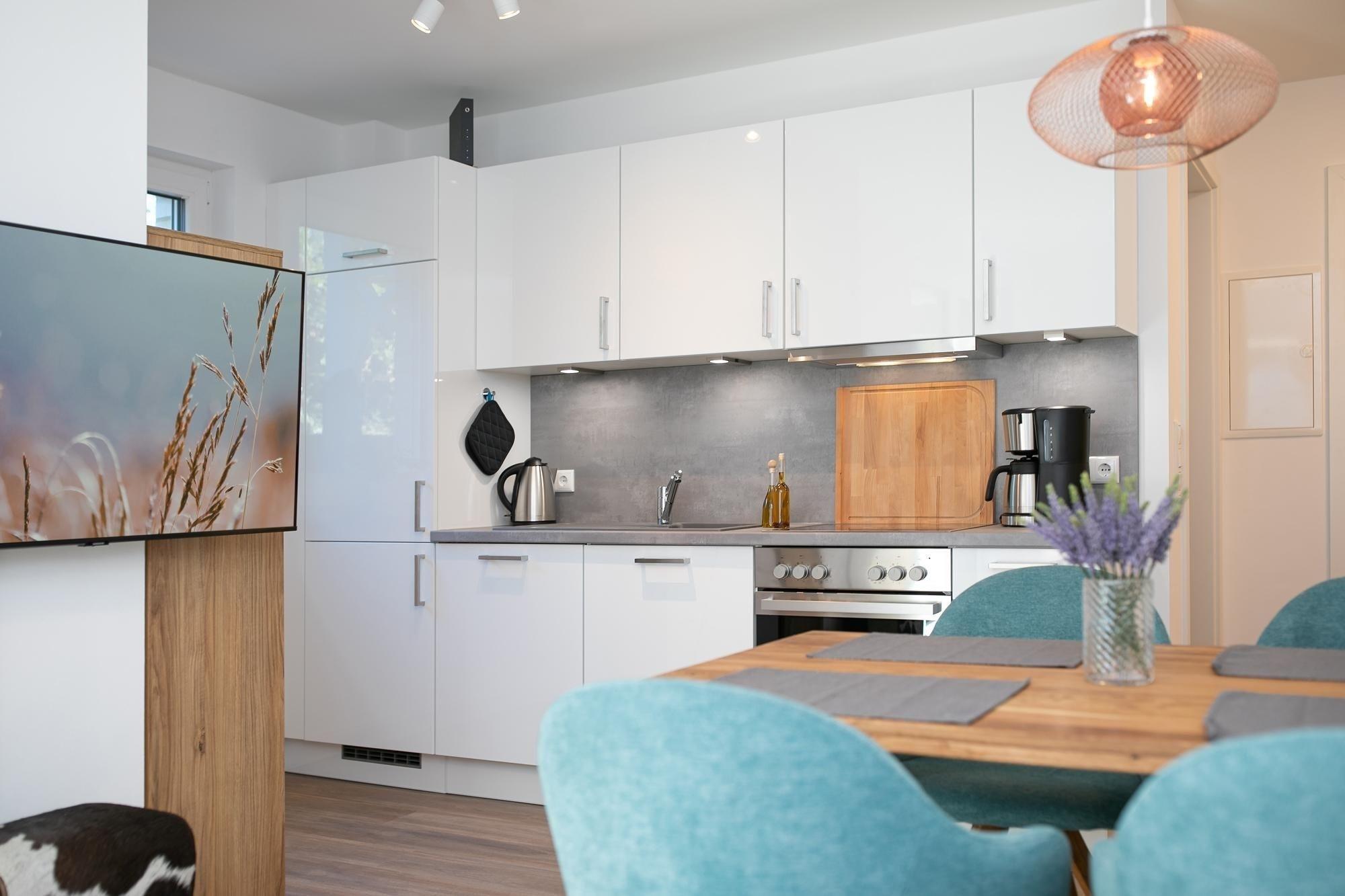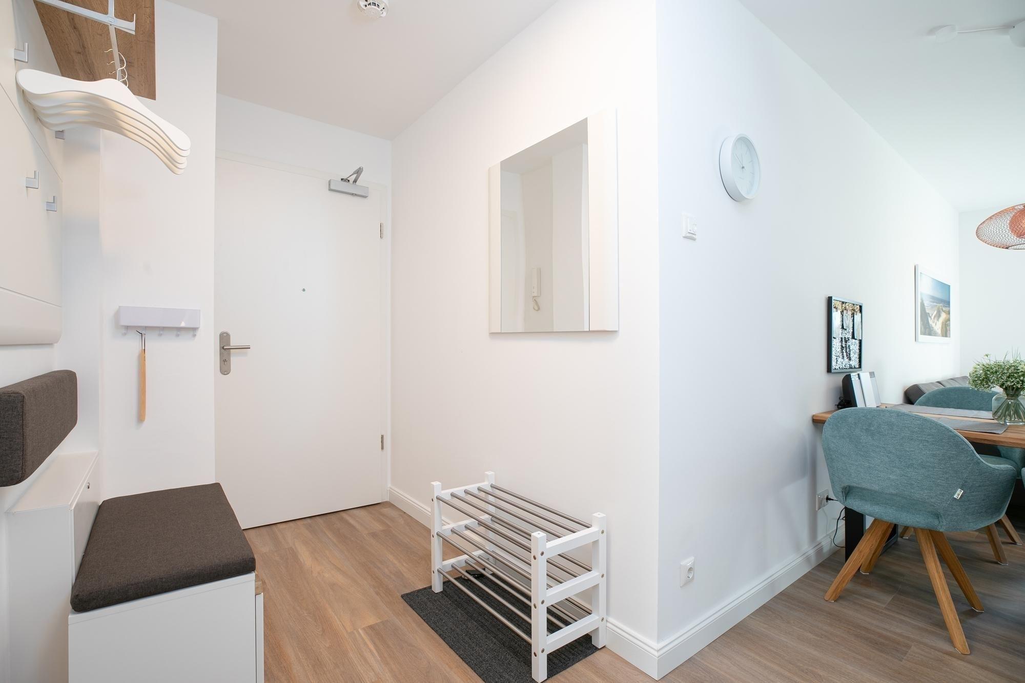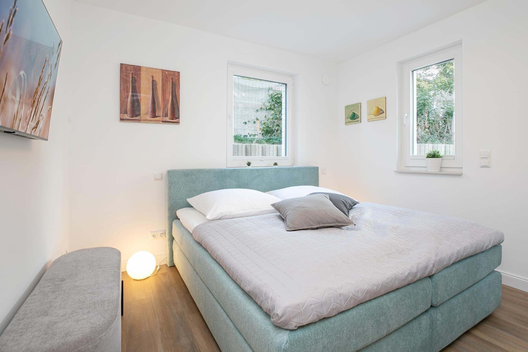 Durch einen kleinen, hellen Flur gelangen Sie in den Wohnbereich mit integrierter Küche. Die geschmackvolle und hochwertige Ausstattung wird Sie überzeugen. Kommen Sie erstmal an und genießen Sie nach der Anreise einen Begrüßungsdrink auf dem gemütlichen Sofa. Lassen Sie Ihren Blick schweifen und planen Sie das Menü für den Abend, dass Sie ohne Mühe in der voll ausgestatteten Küche zaubern können. Am Esstisch können Sie dann bei einem guten Essen den Urlaub einläuten. Ein Flat-TV und ein kostenloser WLAN-Anschluss sorgen an Regentagen für Unterhaltung. Bei Sonnenschein empfehlen wir ein Frühstück auf Ihrer großzügigen, möblierten Terrasse. Auf 15 m² können Sie die Seele baumeln lassen und den Alltag vergessen. Unsere gute Ostseeluft macht müde - lassen Sie sich in die Kissen des komfortablen Boxspringbettes (2x 90x200 cm) fallen und verbringen Sie traumhafte Nächte im abgedunkelten separaten Schlafzimmer. Ein Kleiderschrank bietet viel Platz für Ihre Habseligkeiten. Ein TV Gerät sorgt bei Bedarf für Unterhaltung.