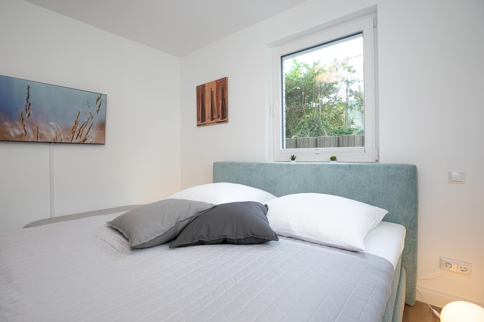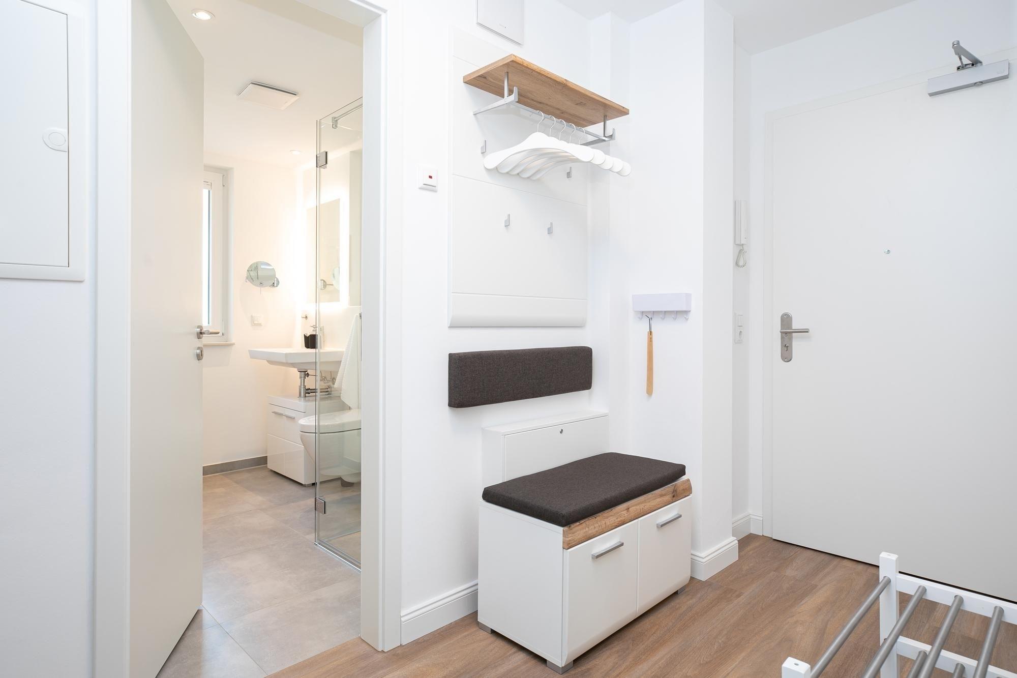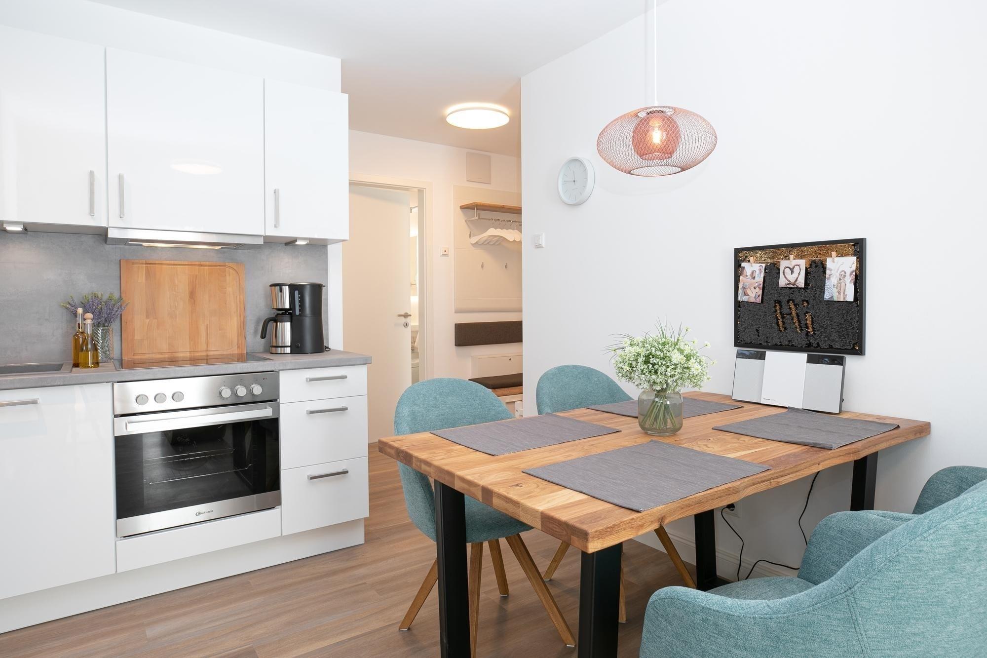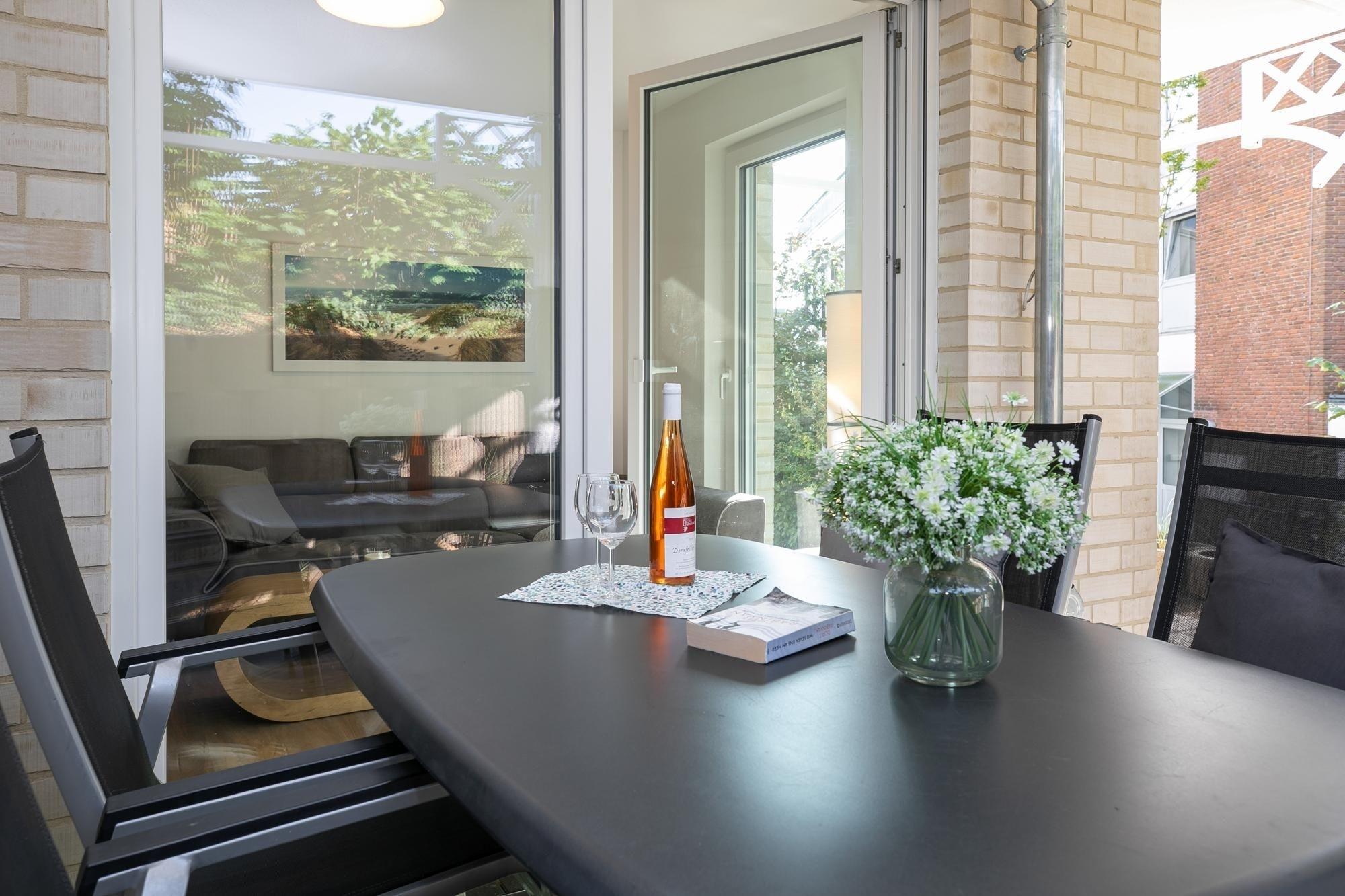 Durch einen kleinen, hellen Flur gelangen Sie in den Wohnbereich mit integrierter Küche. Die geschmackvolle und hochwertige Ausstattung wird Sie überzeugen. Kommen Sie erstmal an und genießen Sie nach der Anreise einen Begrüßungsdrink auf dem gemütlichen Sofa. Lassen Sie Ihren Blick schweifen und planen Sie das Menü für den Abend, dass Sie ohne Mühe in der voll ausgestatteten Küche zaubern können. Am Esstisch können Sie dann bei einem guten Essen den Urlaub einläuten. Ein Flat-TV und ein kostenloser WLAN-Anschluss sorgen an Regentagen für Unterhaltung. Bei Sonnenschein empfehlen wir ein Frühstück auf Ihrer großzügigen, möblierten Terrasse. Auf 15 m² können Sie die Seele baumeln lassen und den Alltag vergessen. Unsere gute Ostseeluft macht müde - lassen Sie sich in die Kissen des komfortablen Boxspringbettes (2x 90x200 cm) fallen und verbringen Sie traumhafte Nächte im abgedunkelten separaten Schlafzimmer. Ein Kleiderschrank bietet viel Platz für Ihre Habseligkeiten. Ein TV Gerät sorgt bei Bedarf für Unterhaltung.