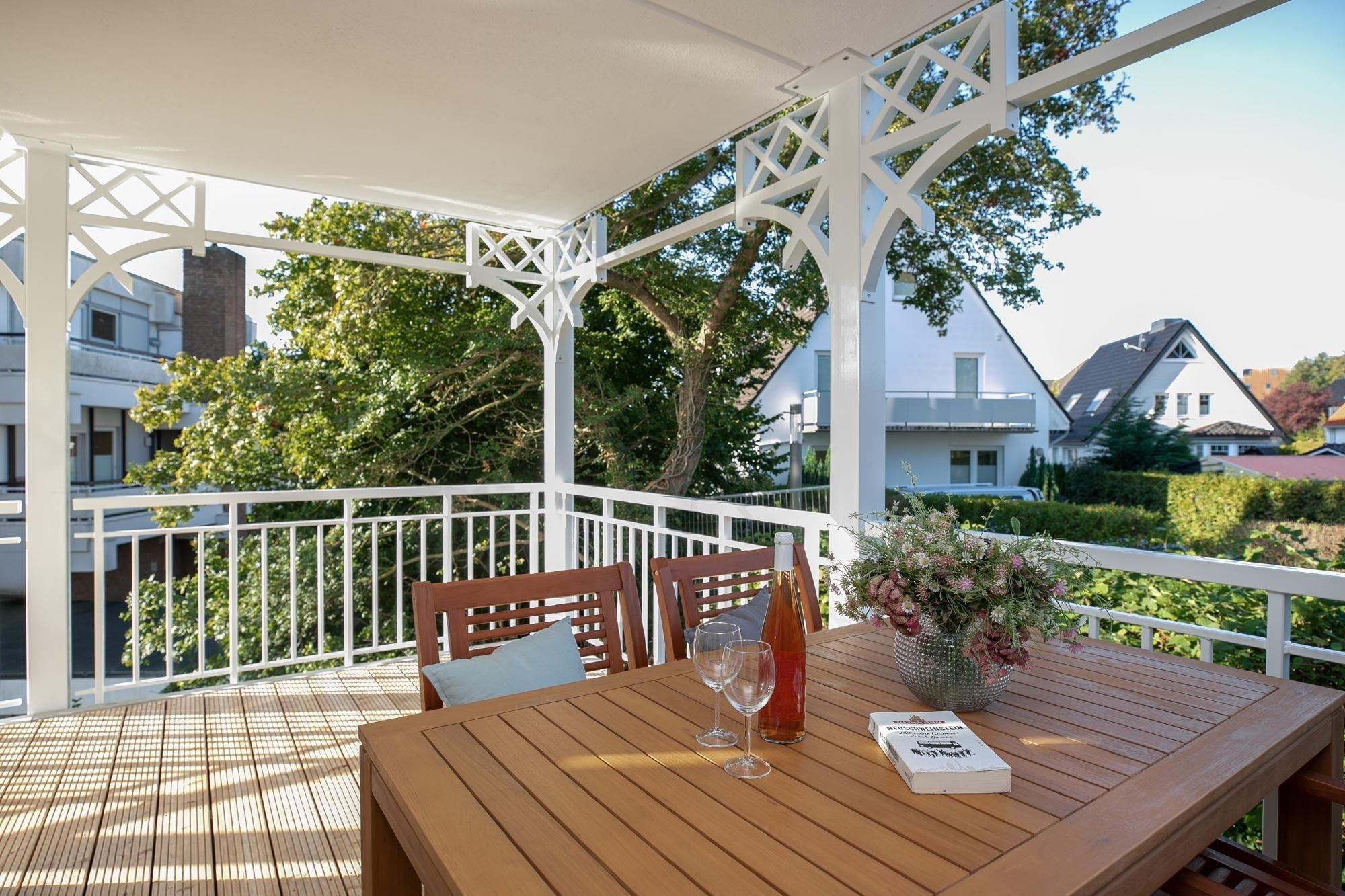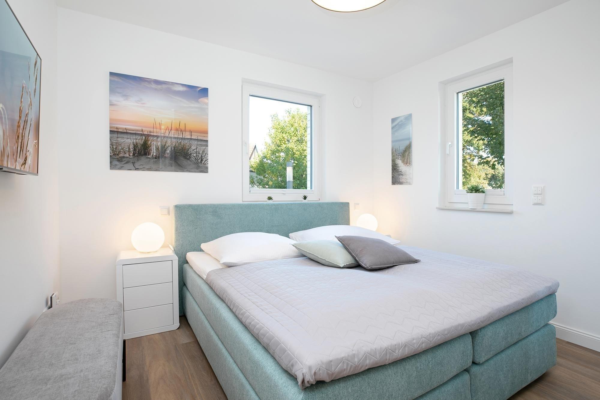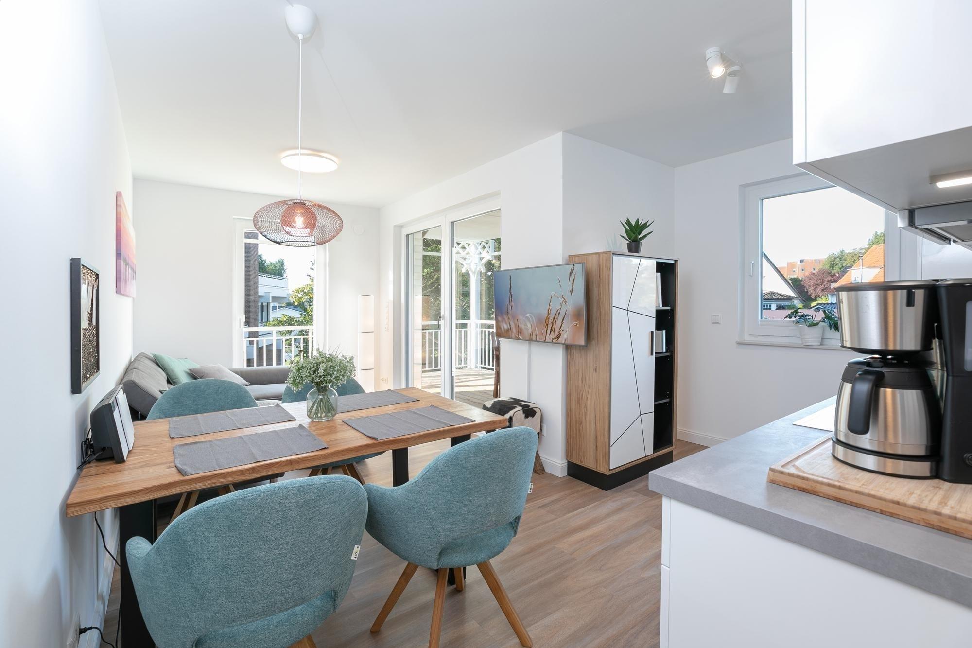 Ein schicker Wohnbereich begrüßt Sie und das bequeme Sofa verspricht kuschelige Abende zu Zweit bei einem Glas Wein und guten Gesprächen oder langen Kinoabenden vor dem Flat-TV. Loggen Sie sich in das kostenfreie WLAN-Netzwerk ein und lassen Sie sich von Ihrer Lieblingsmusik auch im Urlaub begleiten. Verwöhnen Sie sich im Urlaub mit kulinarischen Köstlichkeiten, die Sie in der offenen, voll ausgestatteten Küche mühelos zubereiten können. Nach einem ausgiebigen Frühstück auf Ihrem überdachten 15m² großen Balkon können Sie schwungvoll in den Tag starten. Auch der schönste Urlaubstag geht mal zu Ende - für traumhafte Nächte sorgt dann das komfortable Boxspringbett mit Topper (180x200 cm) im separaten Schlafzimmer, dass sich über Plissees und/oder elektrische Rollläden verdunkeln lässt. Ein geräumiger Kleiderschrank bietet ausreichend Platz für Ihre Urlaubsgarderobe. Ein Tageslichtbad mit bodentiefer Dusche und Fußbodenheizung sorgt für Wellness-Feeling.