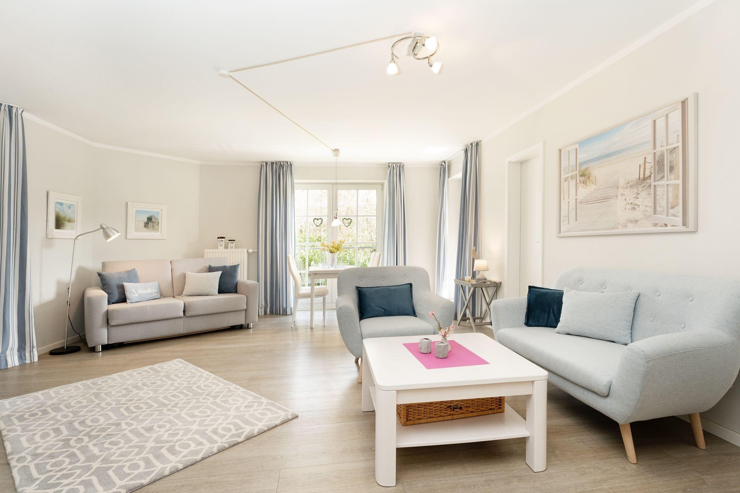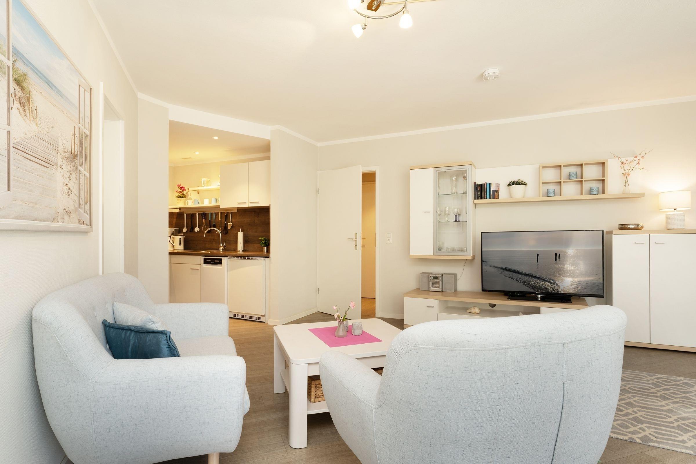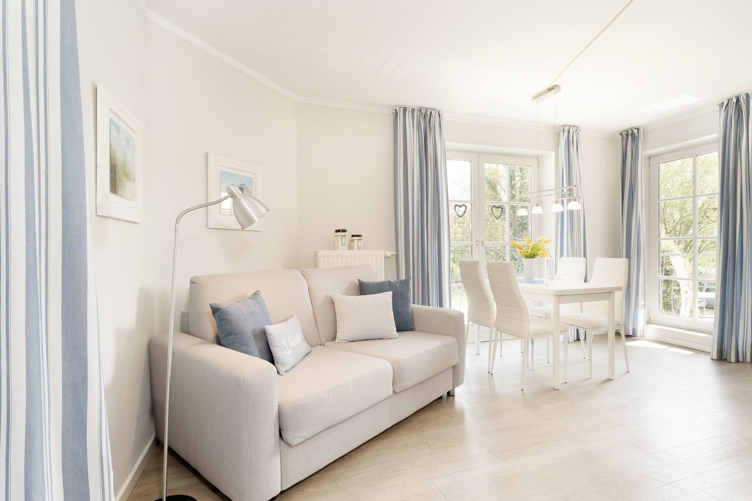 Der Wohn- und Essbereich ist lichtdurchflutet und modern ausgestattet. Auch in der offenen Küche finden Sie alle Annehmlichkeiten vor, die Sie zum Zubereiten der Mahlzeiten benötigen: Von der Spülmaschine über die Kaffeemaschine bis hin zum Eierkocher ist alles vorhanden. WLAN steht Ihnen selbstverständlich kostenfrei zur Verfügung. Zwei Schlafmöglichkeiten bietet das gemütliche Doppelbett (160x200 cm) im separaten Schlafzimmer. Dort befindet sich ein großer Kleiderschrank, in dem Ihre Kleidung verstaut werden kann. Zwei weitere Personen können auf der bequemen Schlafcouch (135x190 cm) im Wohnzimmer übernachten. Auf dem Balkon mit Strandkorb haben Sie einen schönen Blick in die Natur und können Ihren Kaffee am Morgen oder das Glas Wein am Abend genießen.