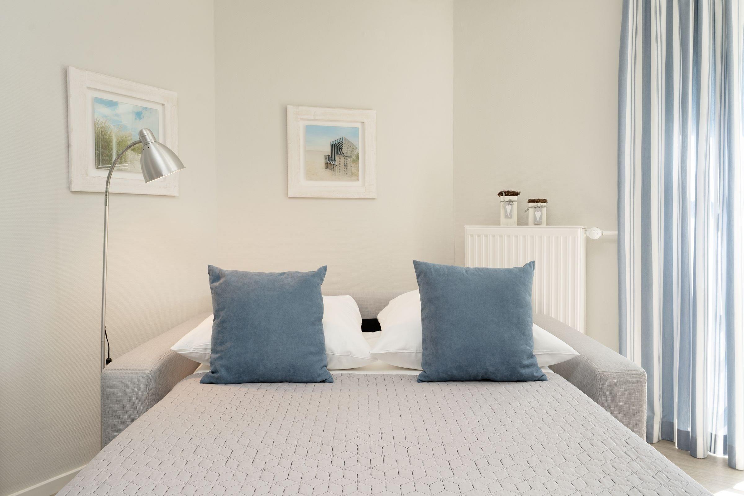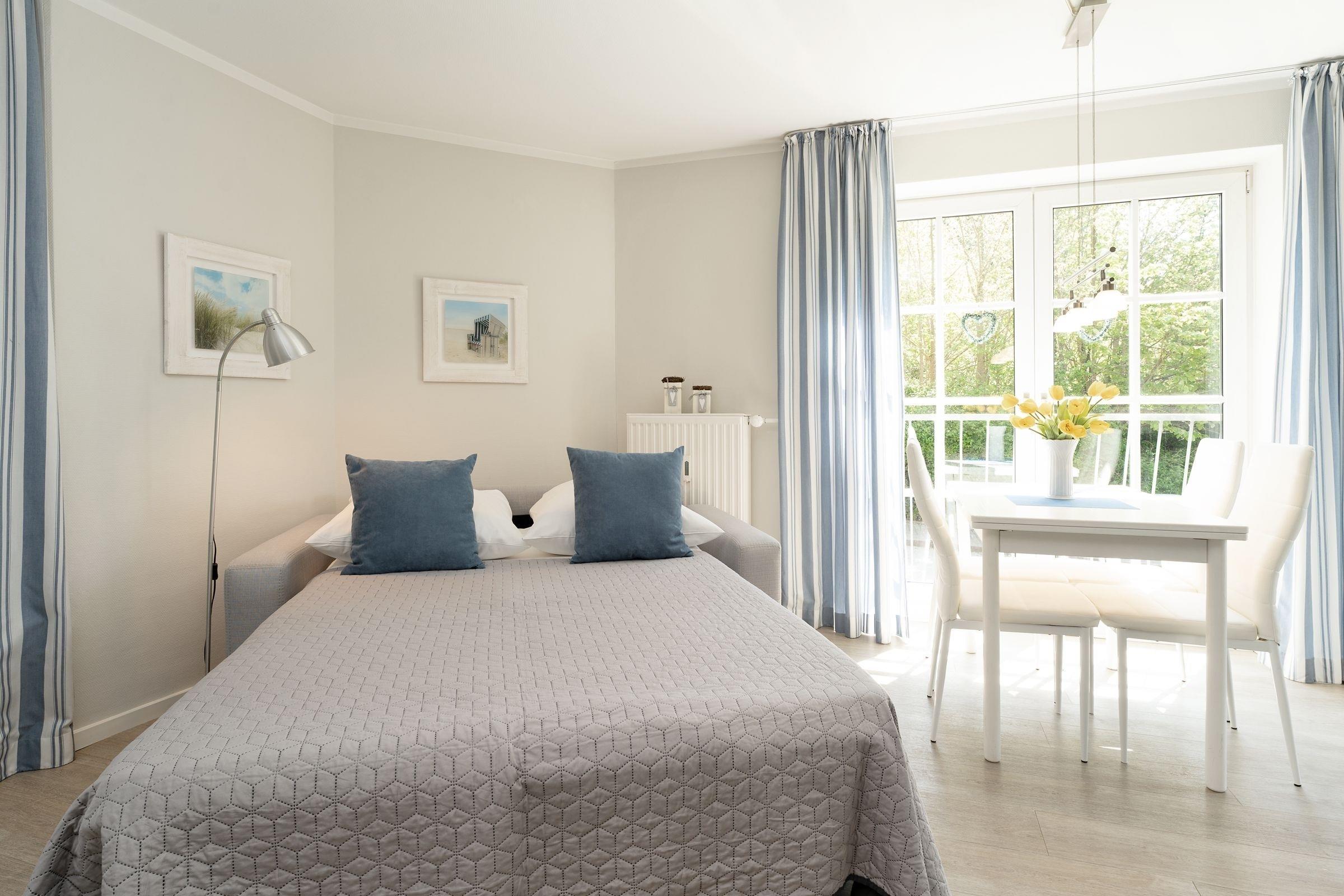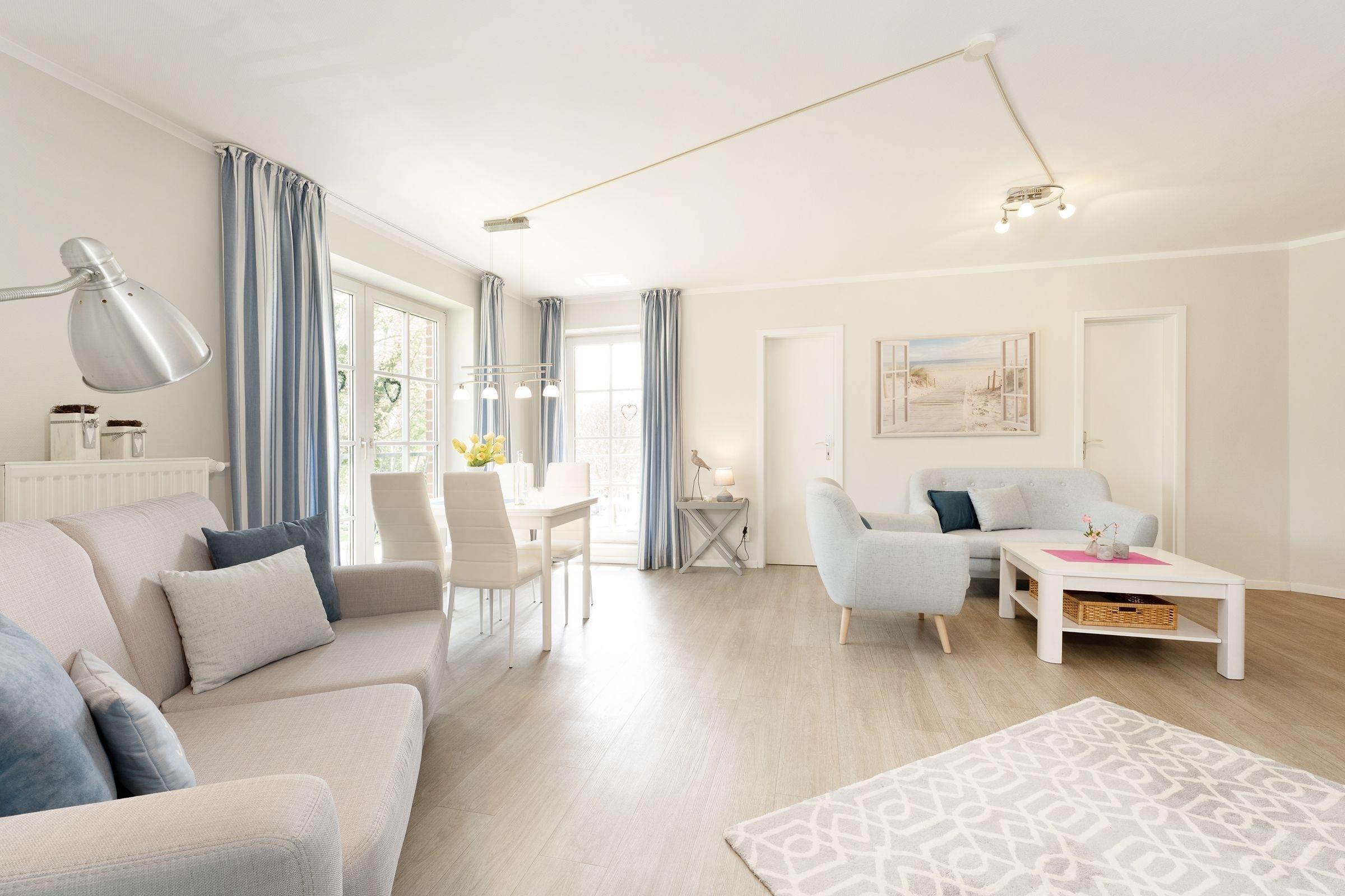 Der Wohn- und Essbereich ist lichtdurchflutet und modern ausgestattet. Auch in der offenen Küche finden Sie alle Annehmlichkeiten vor, die Sie zum Zubereiten der Mahlzeiten benötigen: Von der Spülmaschine über die Kaffeemaschine bis hin zum Eierkocher ist alles vorhanden. WLAN steht Ihnen selbstverständlich kostenfrei zur Verfügung. Zwei Schlafmöglichkeiten bietet das gemütliche Doppelbett (160x200 cm) im separaten Schlafzimmer. Dort befindet sich ein großer Kleiderschrank, in dem Ihre Kleidung verstaut werden kann. Zwei weitere Personen können auf der bequemen Schlafcouch (135x190 cm) im Wohnzimmer übernachten. Auf dem Balkon mit Strandkorb haben Sie einen schönen Blick in die Natur und können Ihren Kaffee am Morgen oder das Glas Wein am Abend genießen.