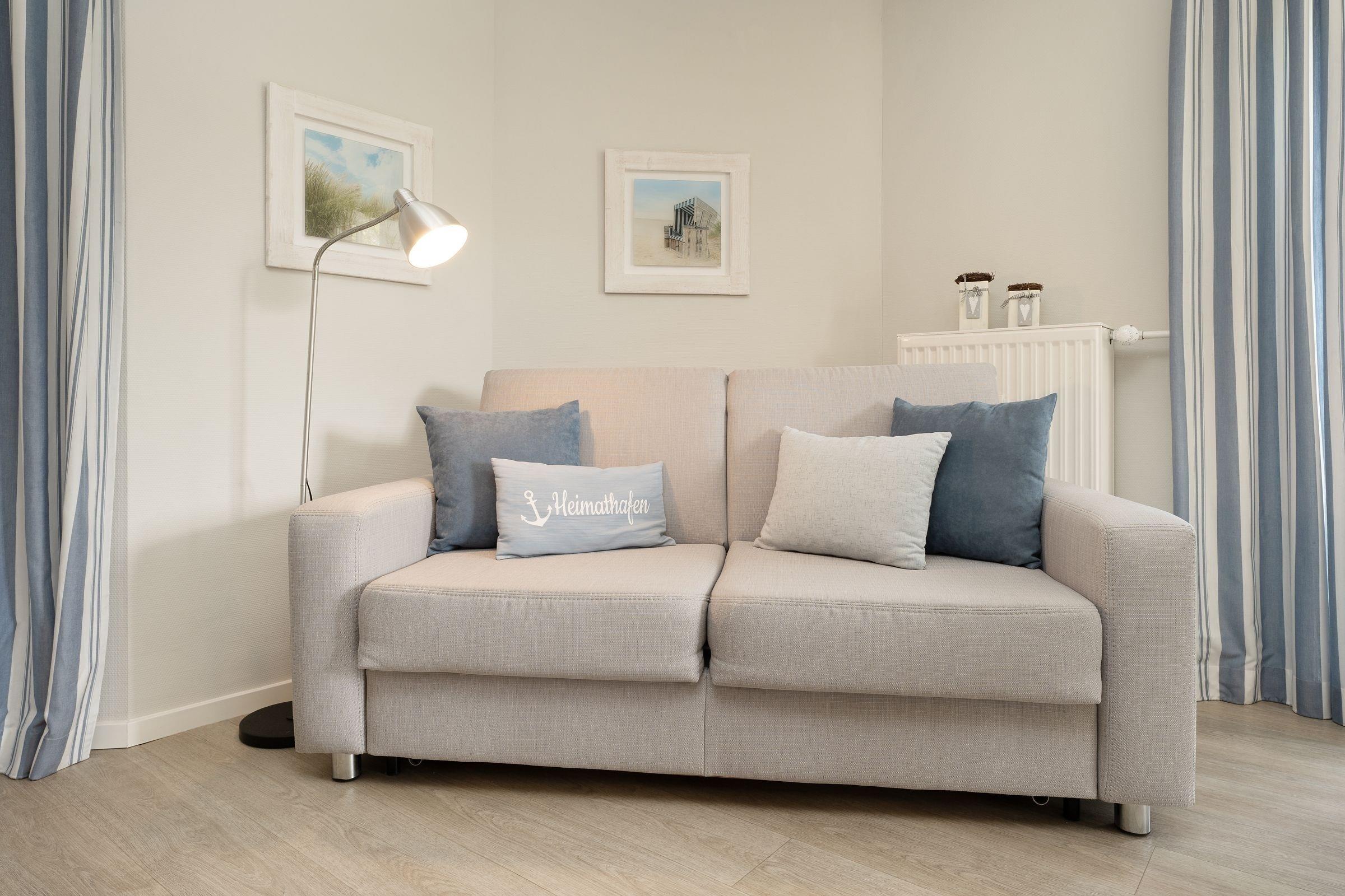 Wohnzimmer: 1 Schlafsofa (135x190 cm), Lichtschutzgardinen