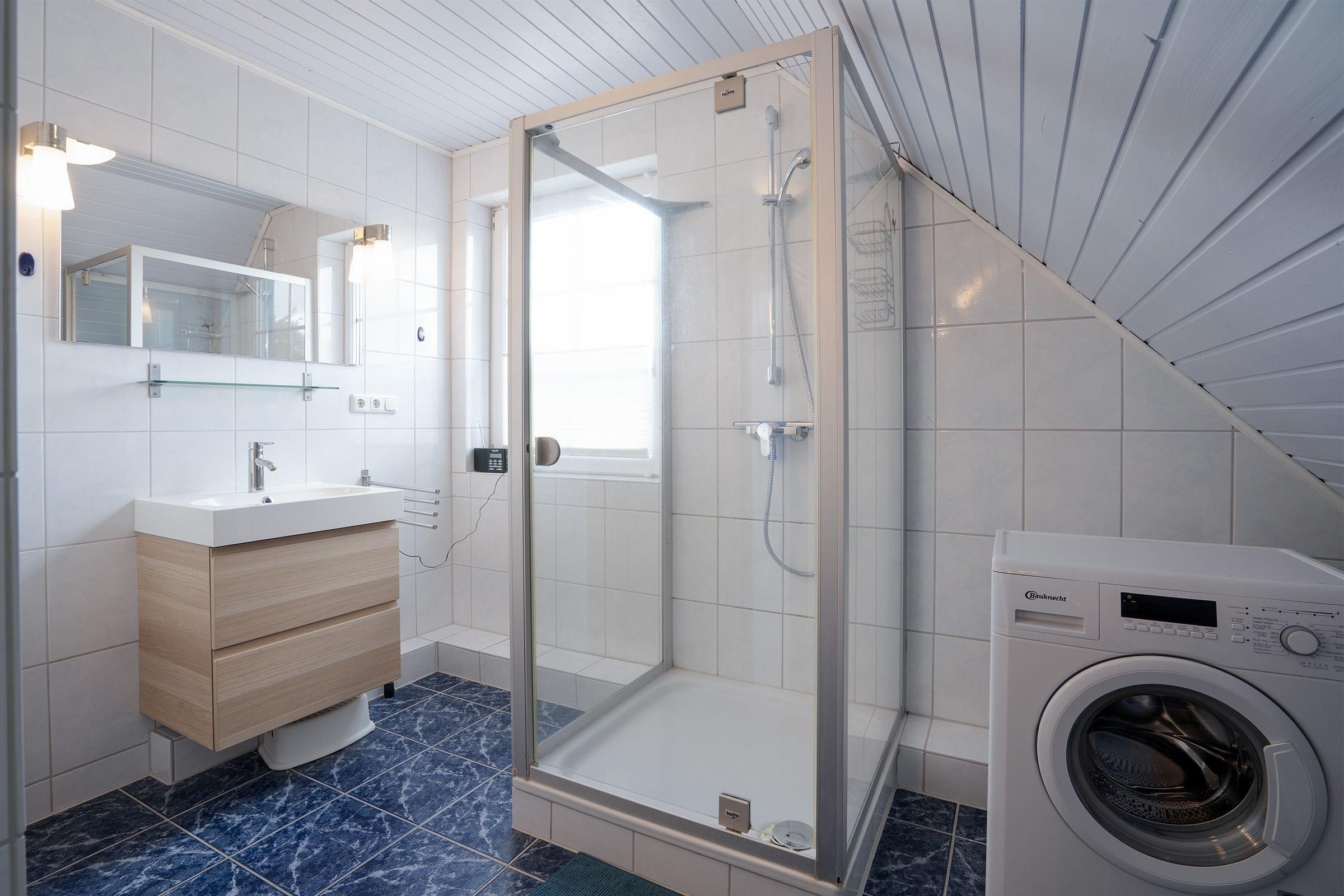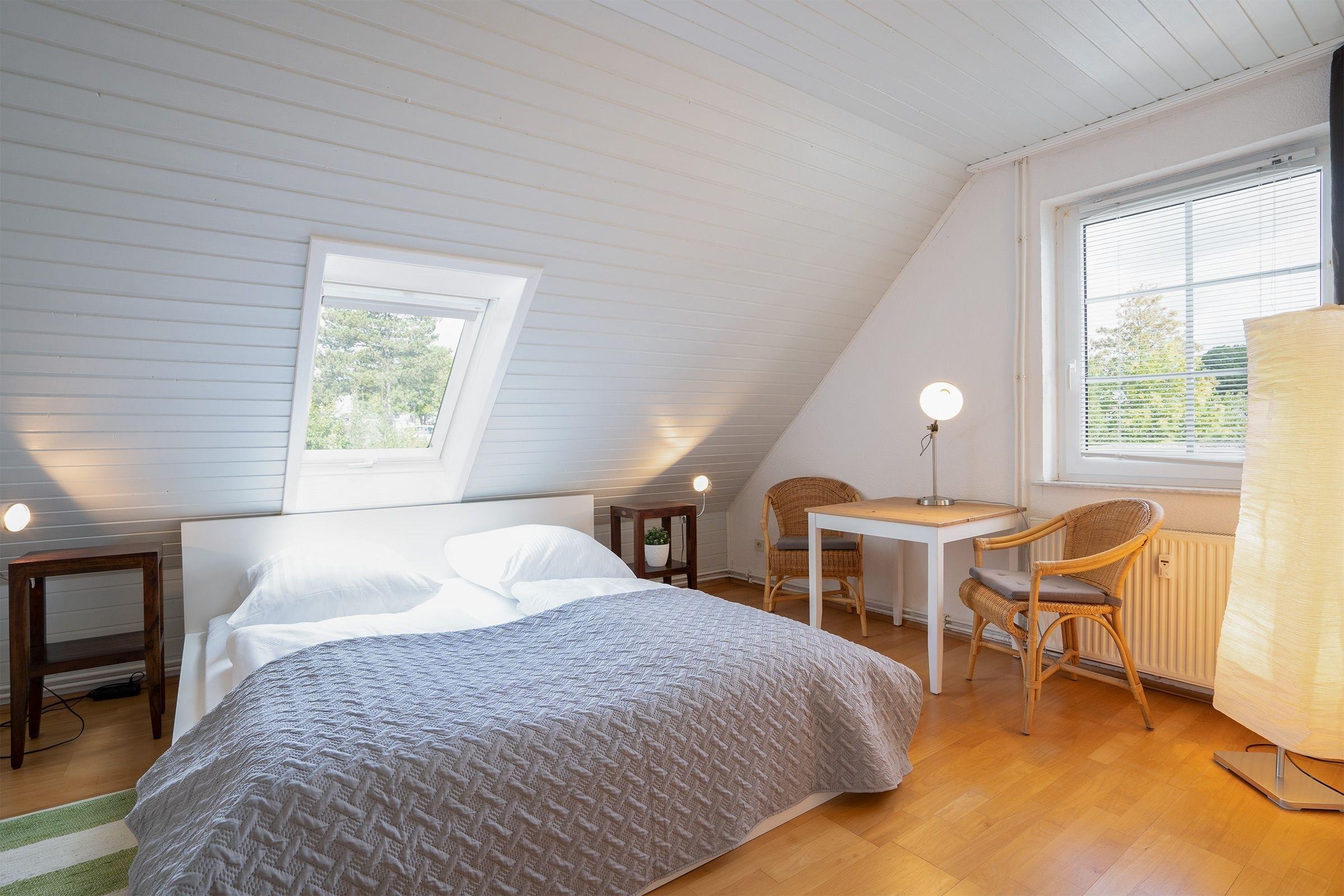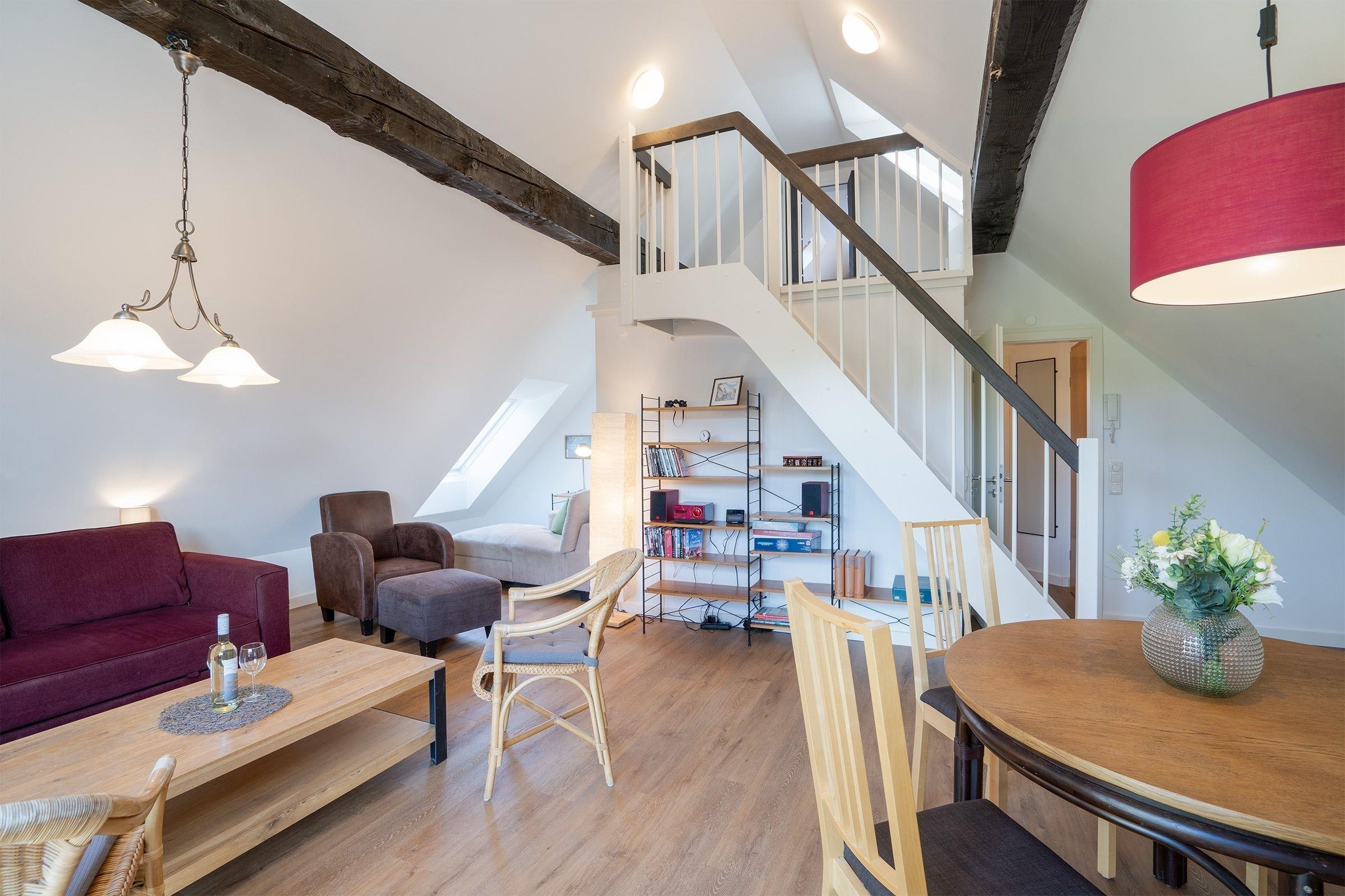 Eine Treppe führt hinauf ins 2. Obergeschoss, wo Sie einen weiteren Wohnraum mit einem Schlafsofa (140x200 cm) für 2 Personen, einen TV, eine Musikanlage sowie eine kleine Bücher- und Spielesammlung vorfinden. Auf dieser Etage befinden sich ebenfalls das separate Schlafzimmer mit Doppelbett (2x 90x200 cm) sowie ein separates, hell gefliestes Duschbad mit Waschmaschine. Eine weitere kleine Treppe führt in das 3 OG. Dort befindet sich unter dem Spitzdach eine kleine