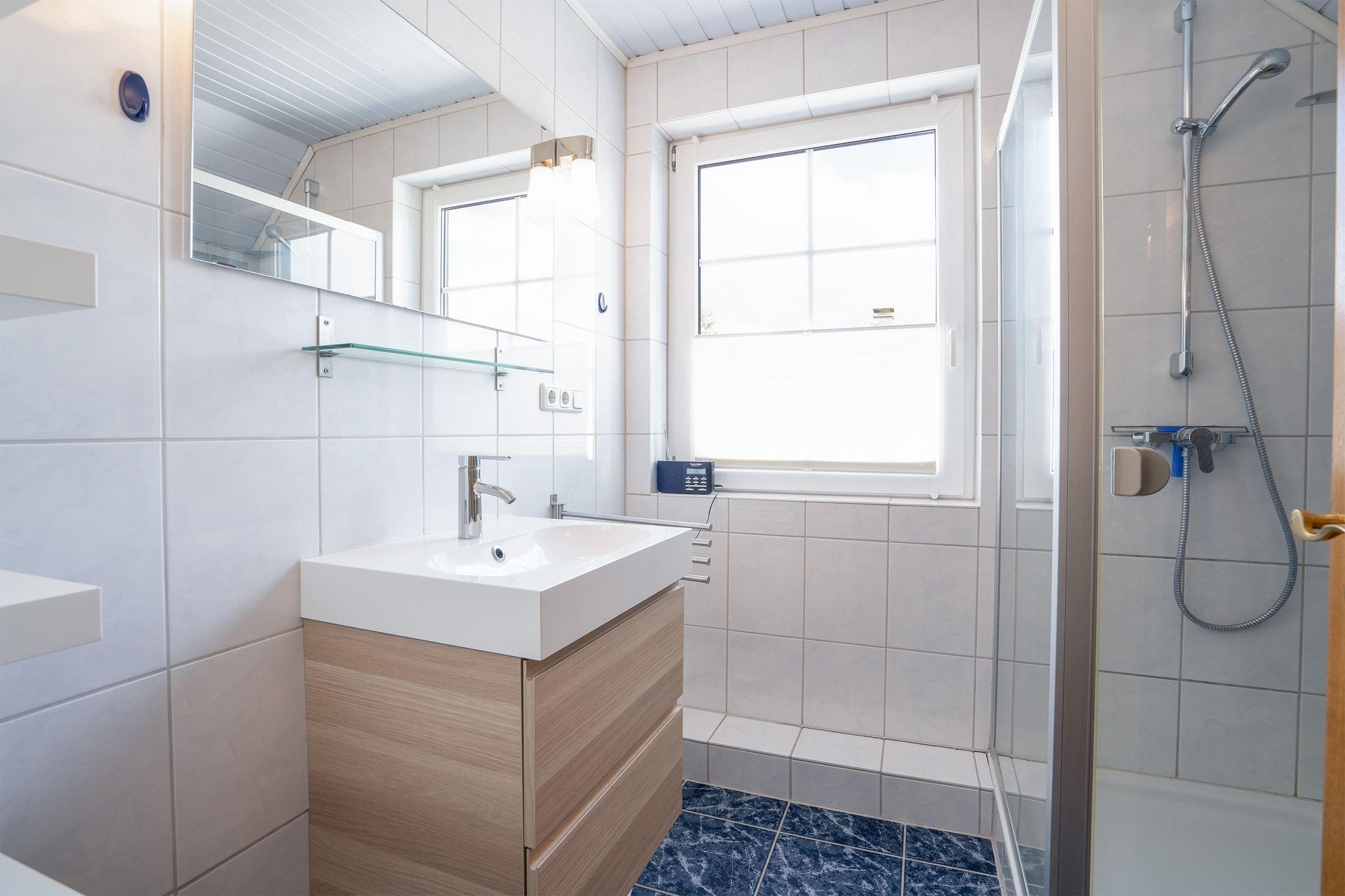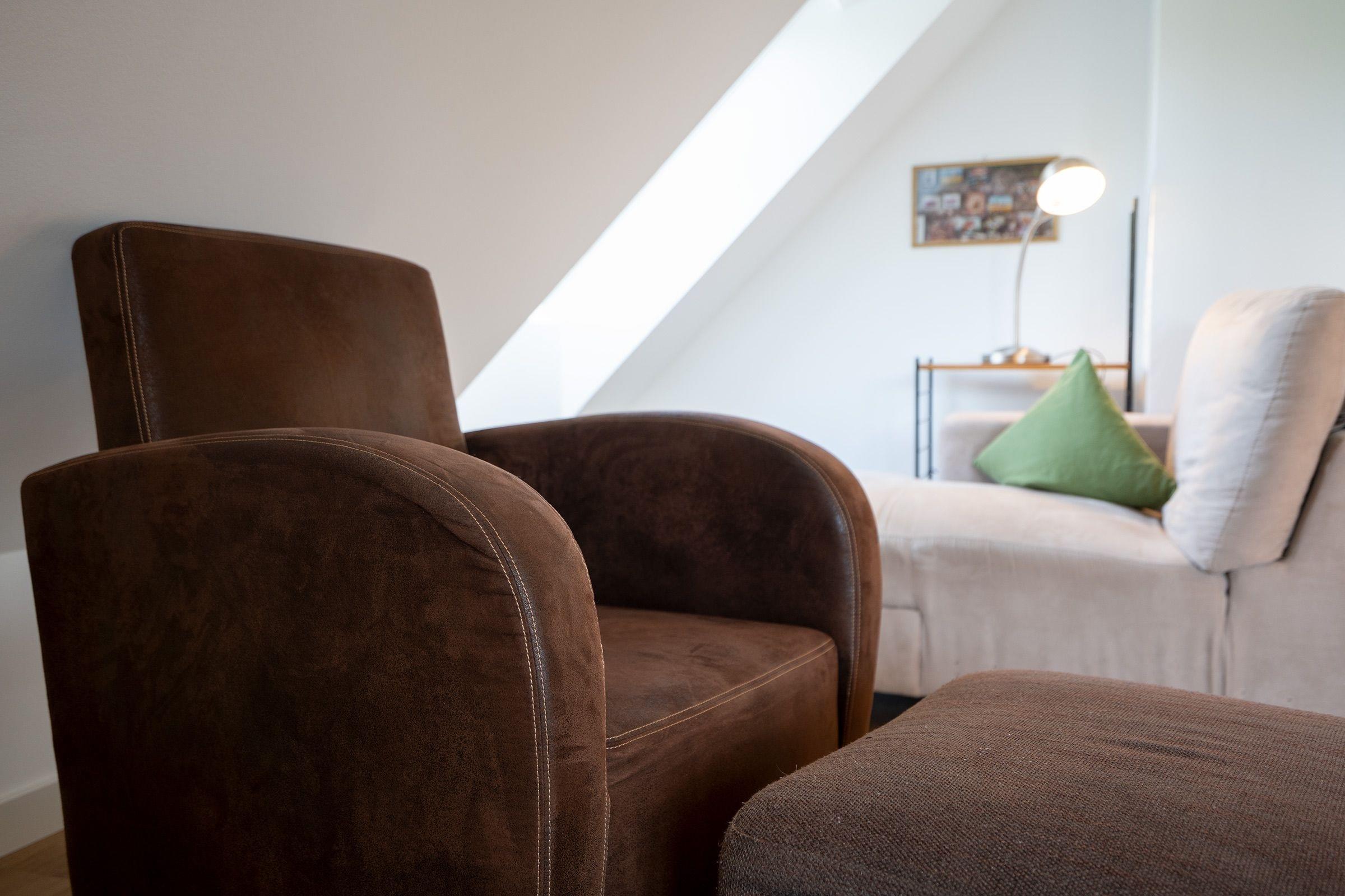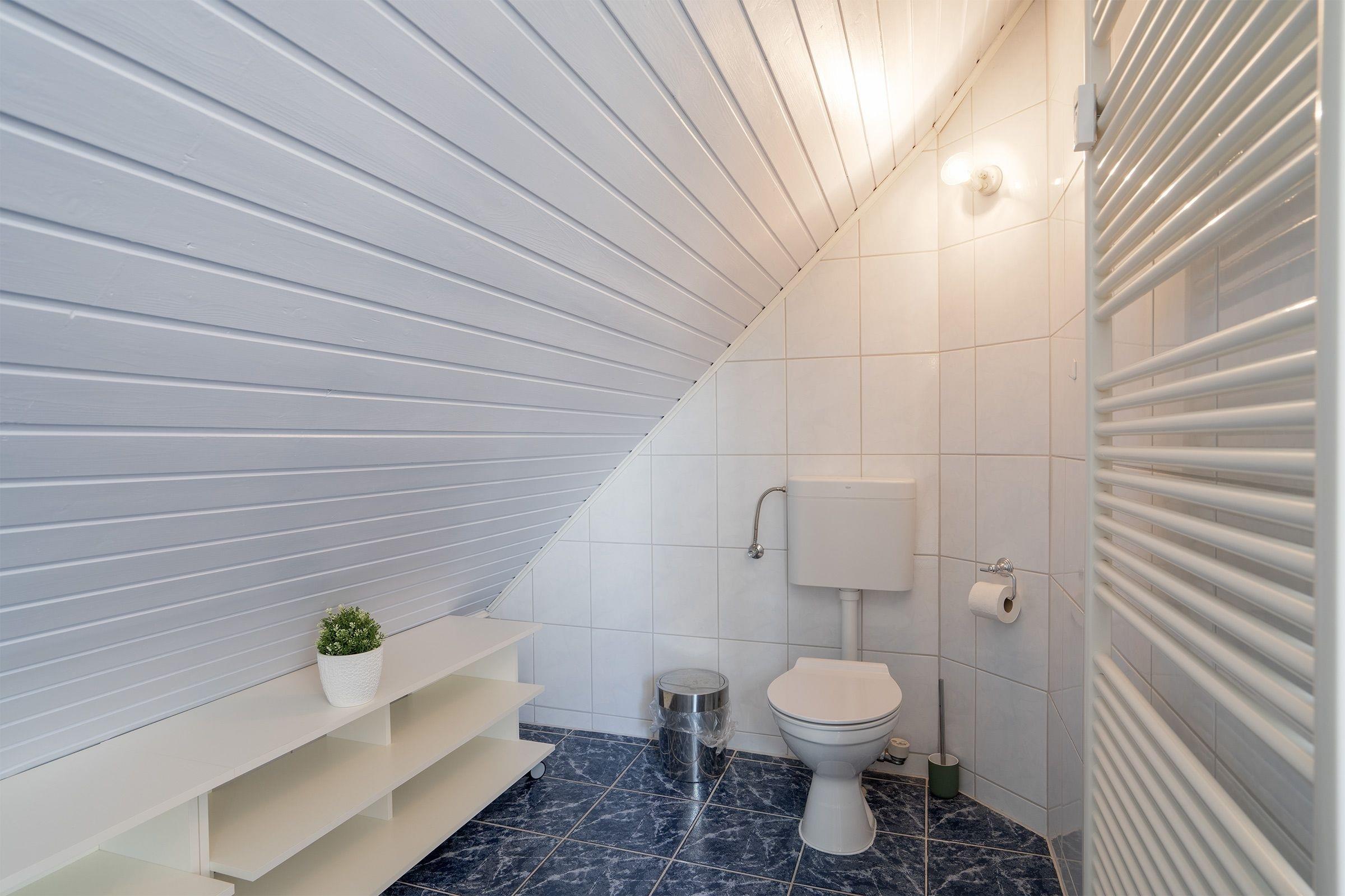 Eine Treppe führt hinauf ins 2. Obergeschoss, wo Sie einen weiteren Wohnraum mit einem Schlafsofa (140x200 cm) für 2 Personen, einen TV, eine Musikanlage sowie eine kleine Bücher- und Spielesammlung vorfinden. Auf dieser Etage befinden sich ebenfalls das separate Schlafzimmer mit Doppelbett (2x 90x200 cm) sowie ein separates, hell gefliestes Duschbad mit Waschmaschine. Eine weitere kleine Treppe führt in das 3 OG. Dort befindet sich unter dem Spitzdach eine kleine