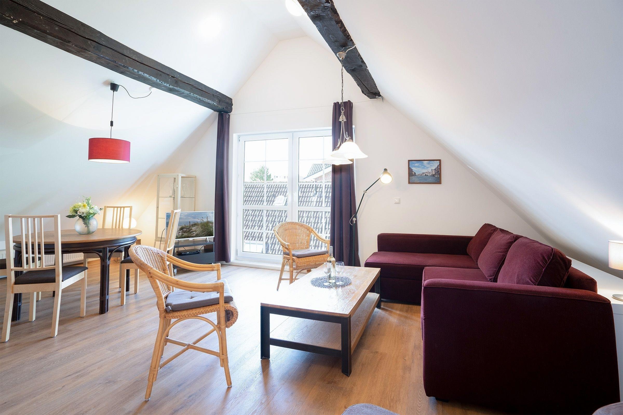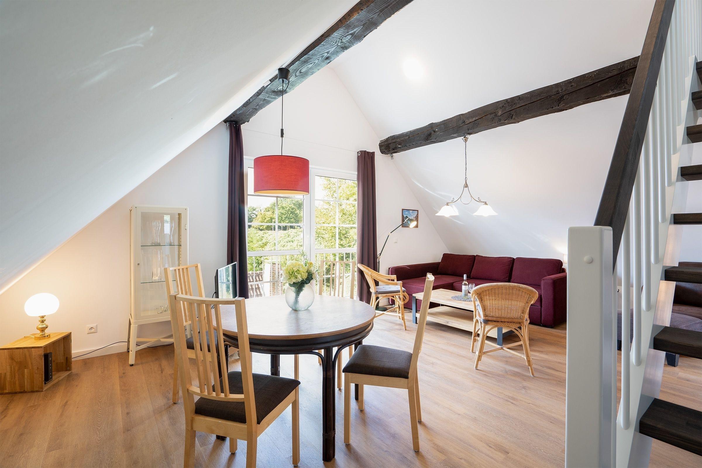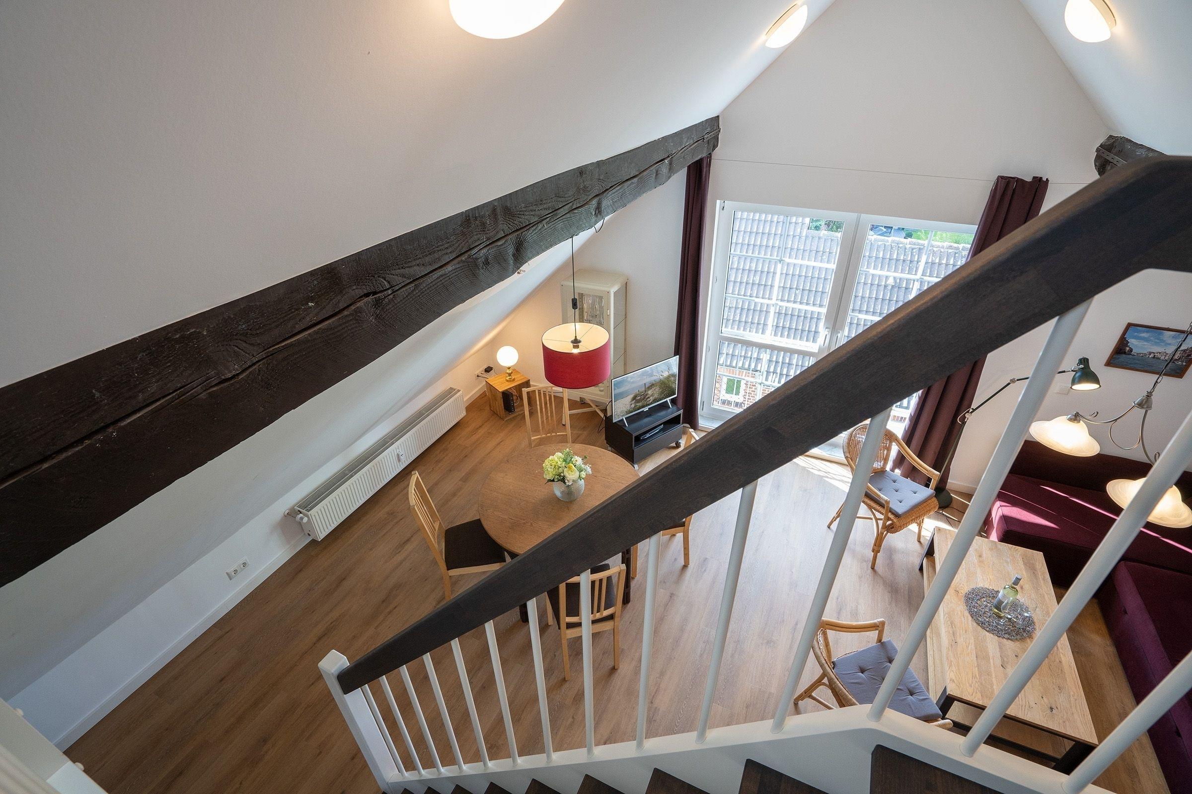 Durch den Haupteingang gelangen Sie über wenige Stufen in den Eingangsbereich der Appartementanlage Seeschwalbe mit nur 7 Wohneinheiten. Über eine urige Holztreppe erreichen Sie auf der 1. Etage (rechte Seite) Ihre Wohnung. Beim Eintreten befinden Sie sich direkt im geräumigen Wohn- und Essbereich mit offener Küche und vielen Fenstern. In der Küche stehen Ihnen alle notwendigen Küchengeräte zur Verfügung und hier ist viel Platz, um ausgiebig mit der Familie zu kochen. Den Wohn- und Essbereich können Sie mit einem Vorhang in eine kleine Küche und einen separaten Wohnraum mit Ecksofa (Schlafmöglichkeit für 1 Person, 135x200cm), Kleiderschrank, Musikanlage und Flachbildfernseher aufteilen.