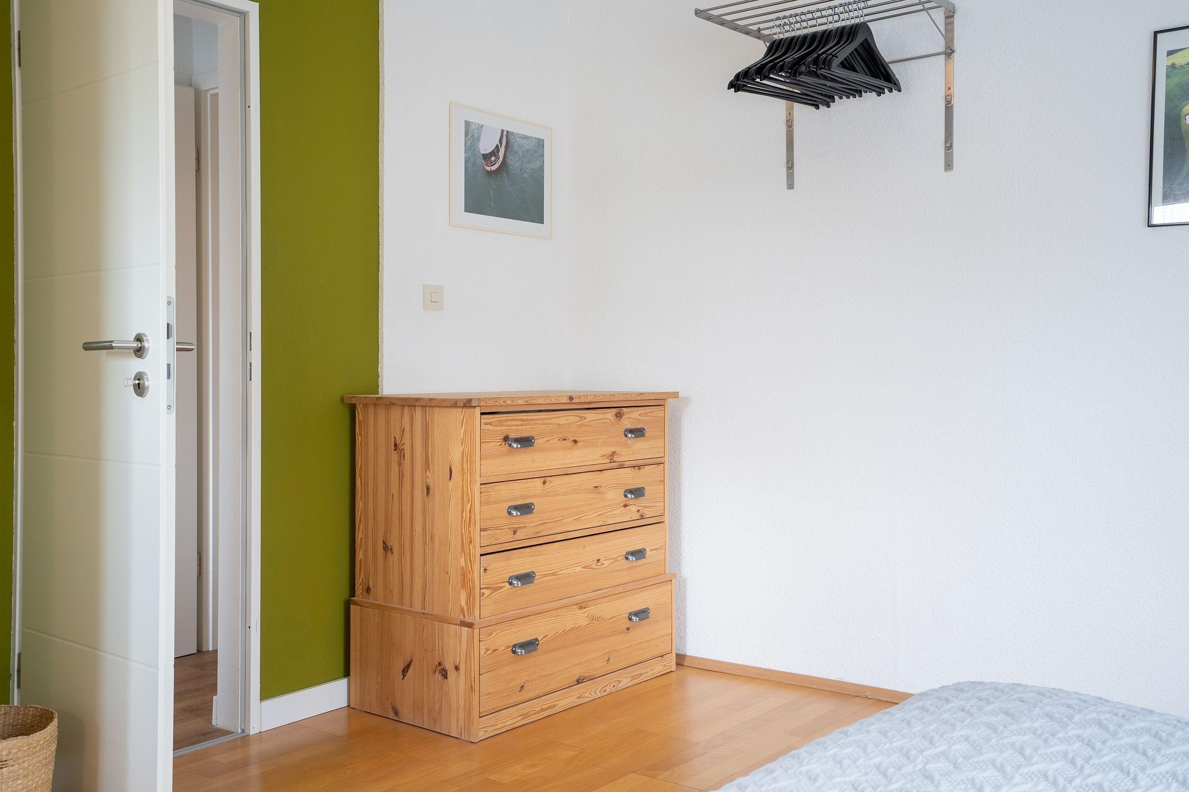 Schlafzimmer (2. OG): 1 Doppelbett (2x 90x200 cm), Verdunkelungsmöglichkeit (Rollos), Kommode, Platz für Babybett