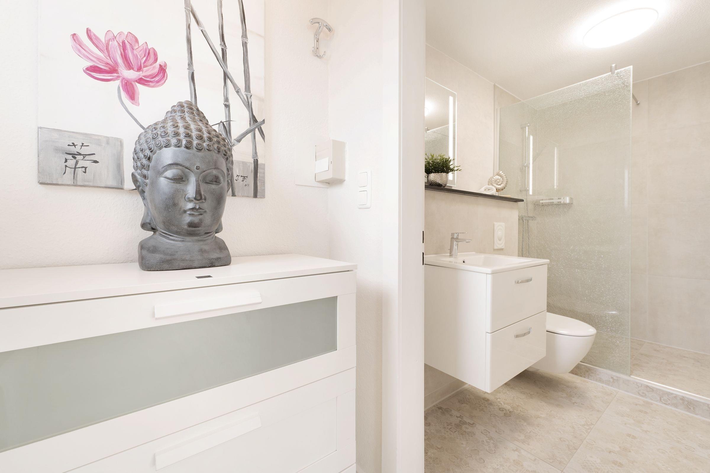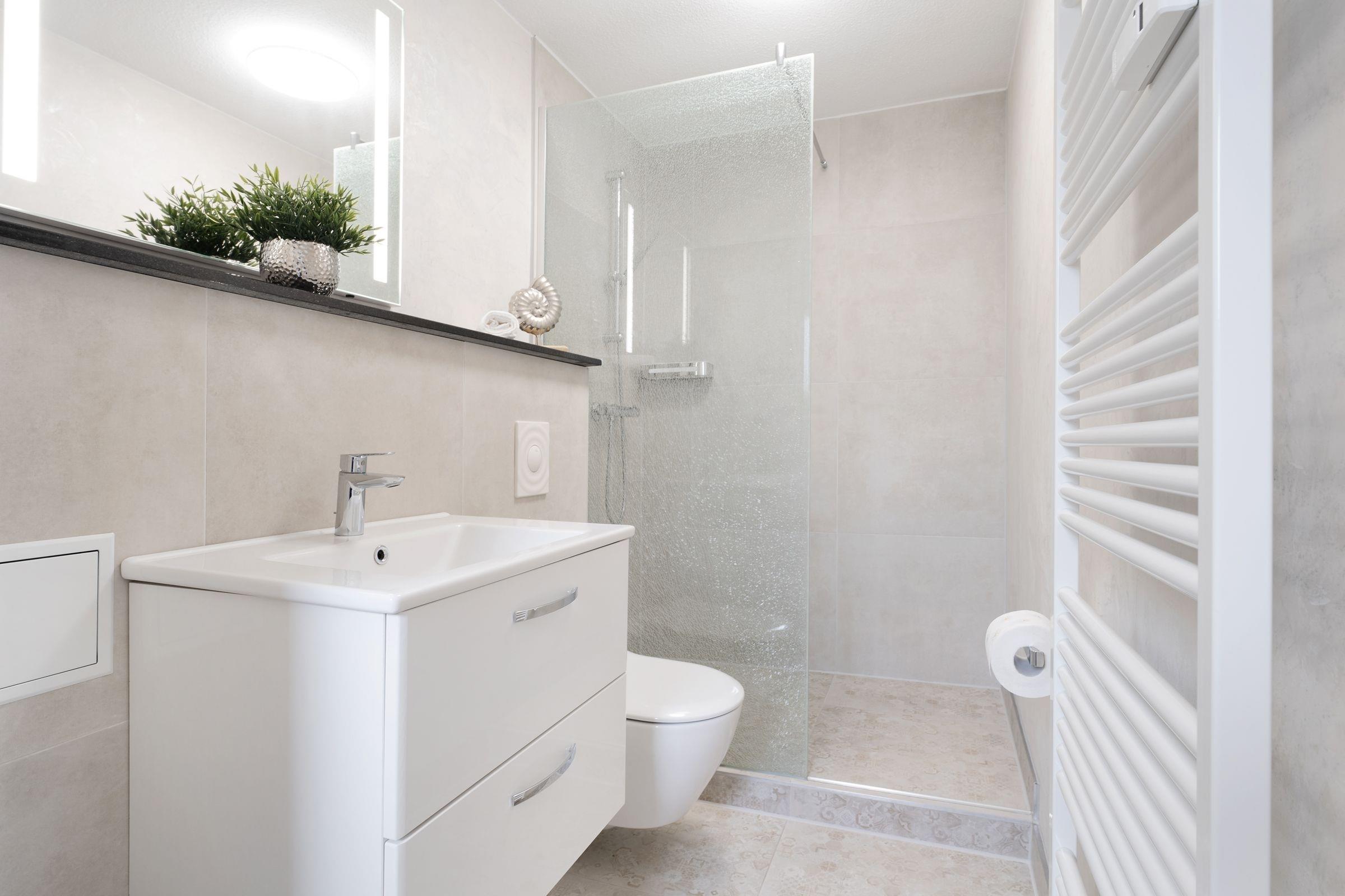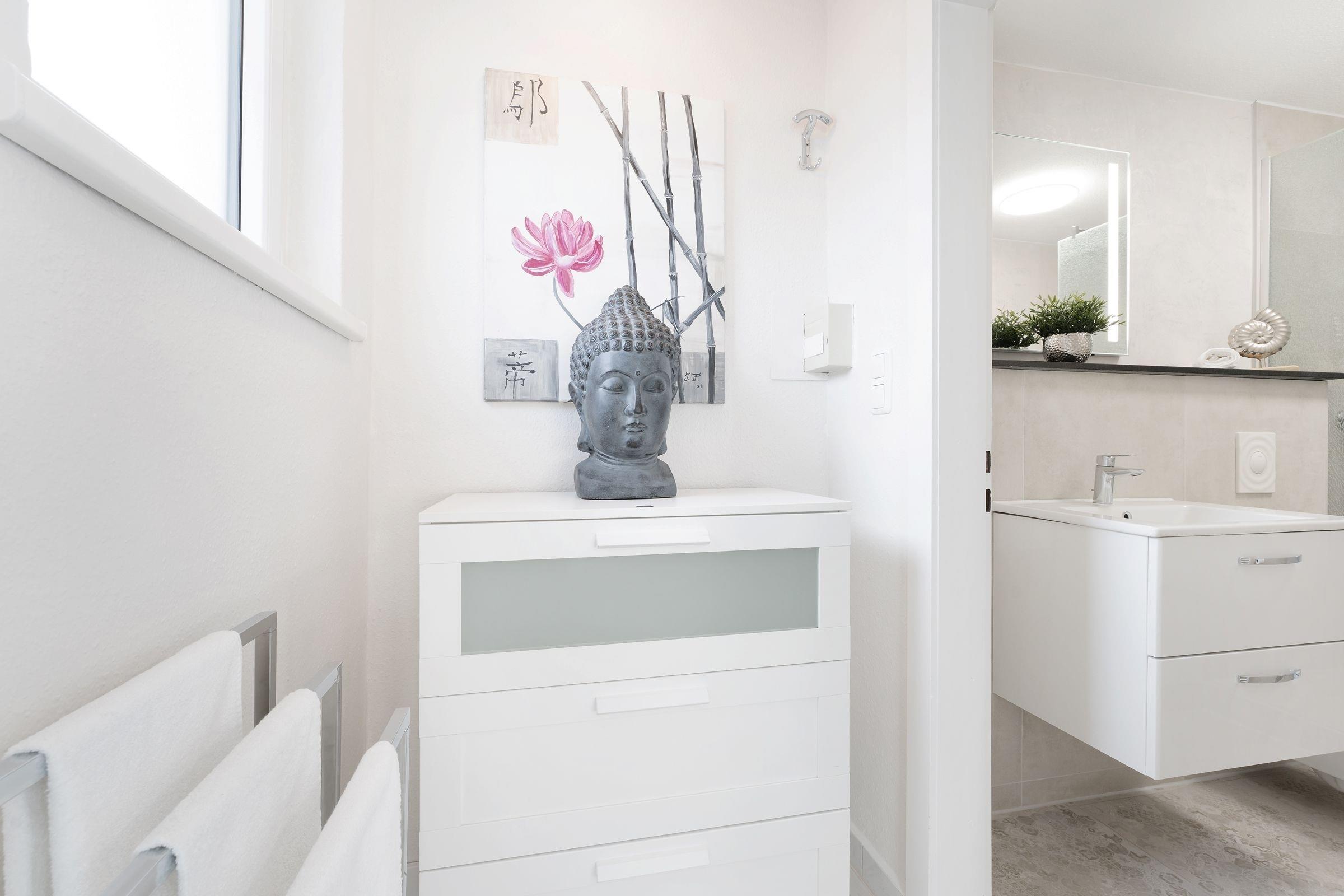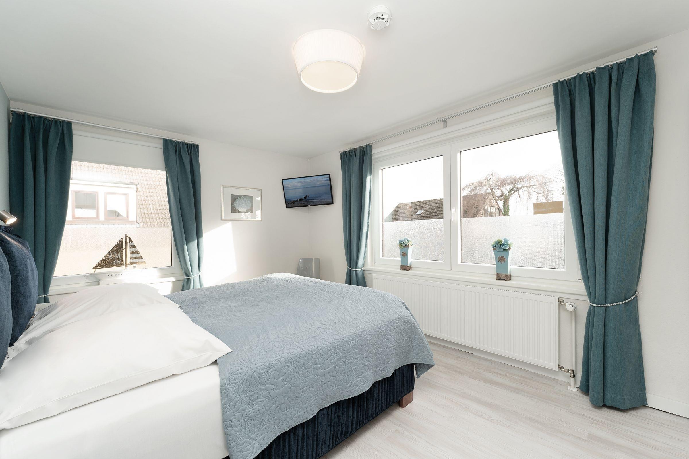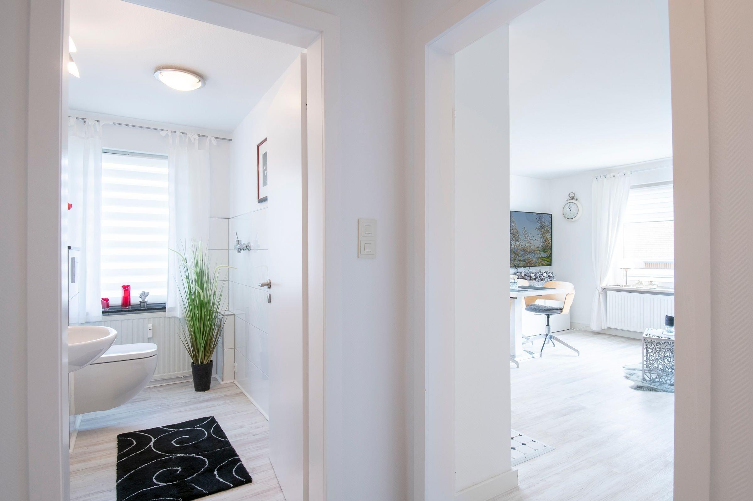 Herzlich willkommen! Treten Sie ein in den stilvoll eingerichteten, offenen Wohn- und Essbereich mit Küche, Esstisch, Ecksofa und großem Flachbildfernseher. Von hier aus haben Sie Zugang zum möblierten Balkon mit Markise, auf dem Sie Ihre Auszeit genießen können. In einer Nische hinter dem Wohnbereich befindet sich ein Boxspring-Doppelbett (140x200 cm). Dieser offene Schlafbereich lässt sich durch einen transparenten Raumteiler vom Wohnbereich abtrennen. An der Schlafnische vorbei erreichen Sie das separate Schlafzimmer mit Doppelbett (180x200 cm), Kleiderschrank und einem weiteren Fernseher. Die Wohnung verfügt über ein komfortables Badezimmer sowie ein tageslichthelles Gäste-WC.