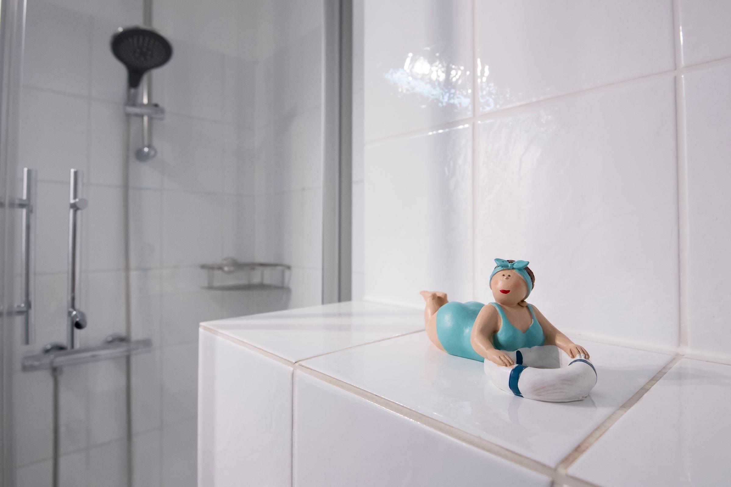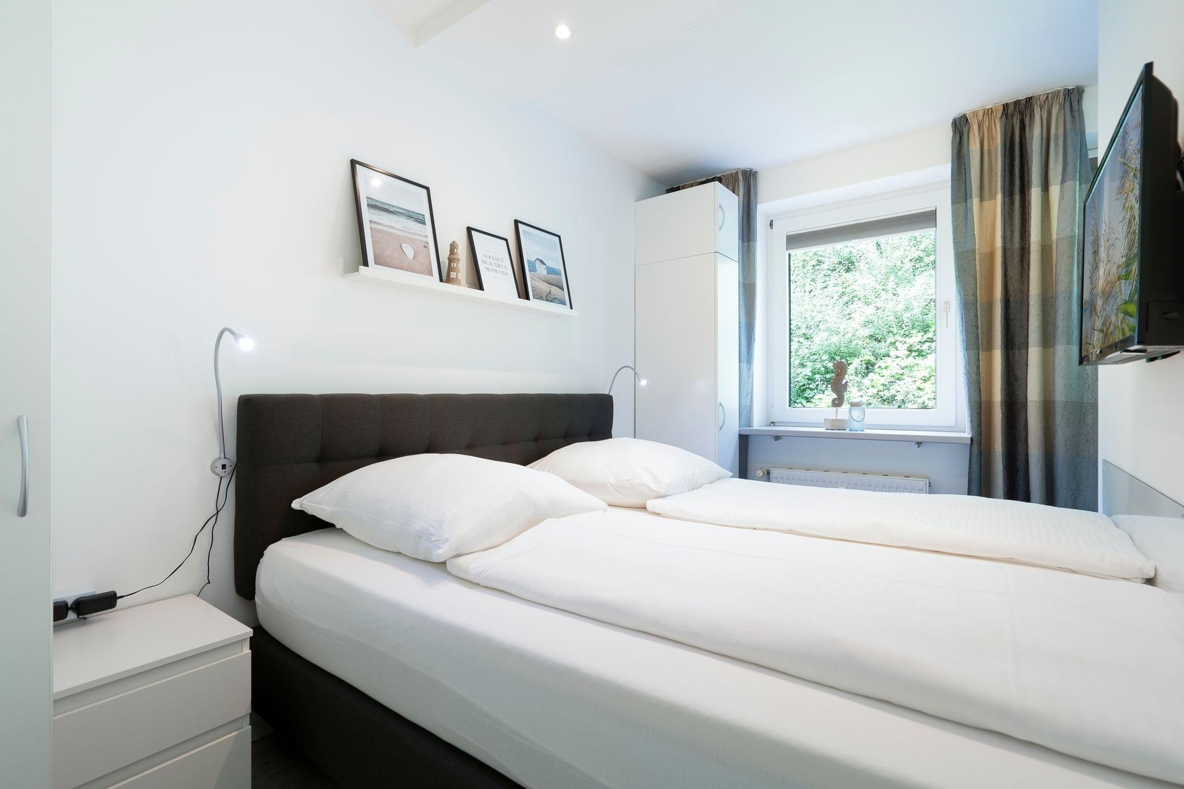 Durch den Flur geradeaus gelangen Sie in den Wohnbereich, der Sie mit einer stilvollen Einrichtung und liebevollen Details begeistern wird. Auf dem komfortablen Sofa können Sie gemütliche Abende vor dem großen Flachbildfernseher verbringen. Der Esstisch für 2 Personen befindet sich direkt am Fenster und lädt zu gemeinsamen Mahlzeiten ein. Vom Wohnbereich räumlich abgetrennt befindet sich der Schlafbereich mit einem Boxspring-Doppelbett (180x200 cm, durchgehende Matratze), einem weiteren Flachbildfernseher, zwei schmalen Kleiderschränken sowie zwei Nachttischen. Plissees sorgen im Wohn- und Schlafbereich für angenehme Verdunkelung in der Nacht. Die offene, gut ausgestattete Küche mit weißen Fronten grenzt an den Wohnbereich. Auf kleinem Raum sind alle notwendigen Küchengeräte wie z. B. ein Backofen, ein Kühlschrank, ein 4-Platten-Cerankochfeld und eine Kaffeemaschine vorhanden. Das innenliegende, hell geflieste Badezimmer verfügt über eine Dusche, ein WC sowie über ein Waschbecken mit Spiegel- und Unterschrank als Stauraum für Ihre Badutensilien. Vom Wohnbereich aus gelangen Sie auf den überdachten, möblierten Balkon. Ein Sicht- und Windschutz sorgt für Privatsphäre und Erholung. Erholen Sie sich dort von einem langen Tag am Strand, von einer großen Fahrradtour oder genießen Sie die Urlaubszeit bei einem guten Buch oder einem Glas Wein.