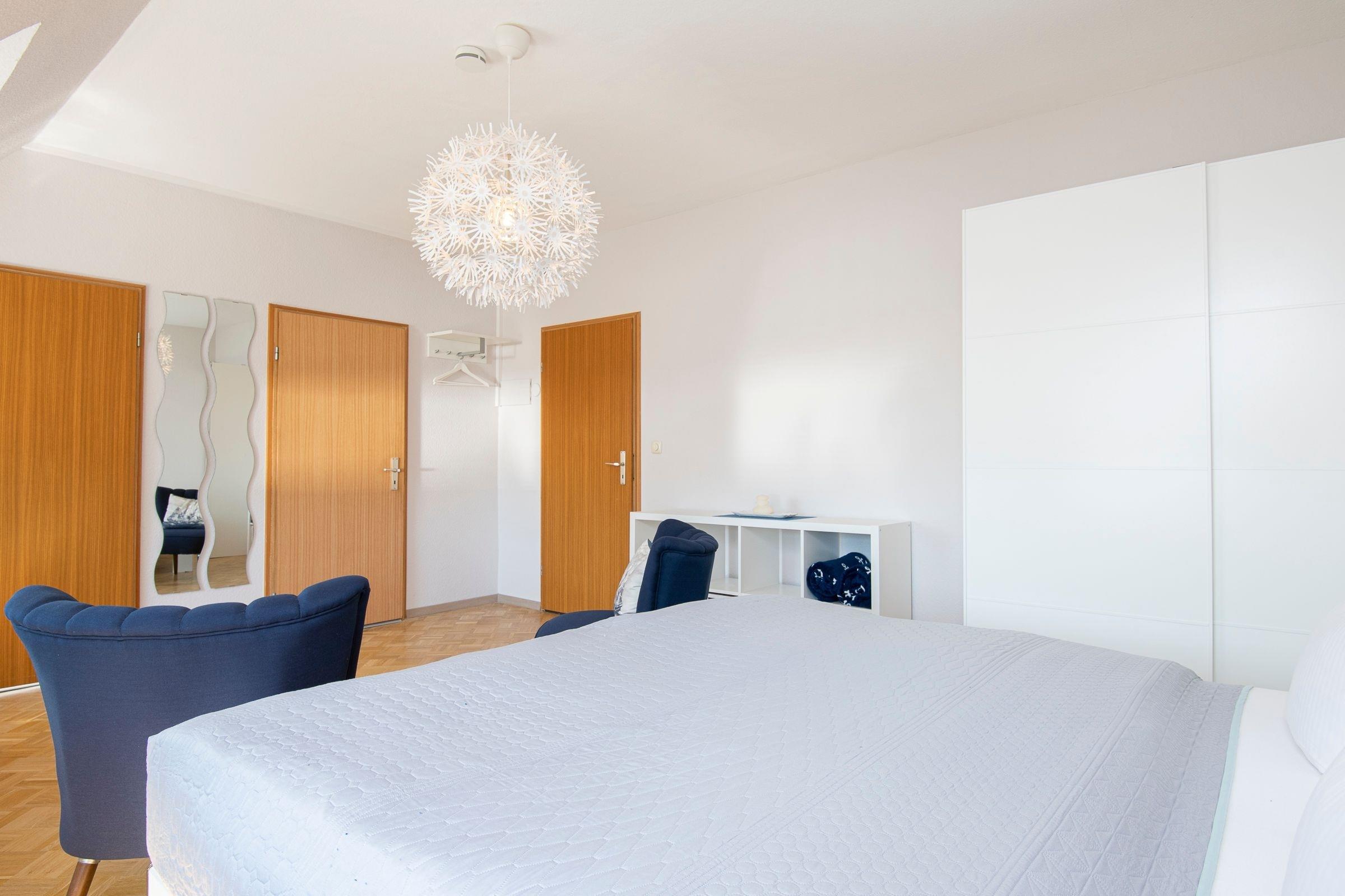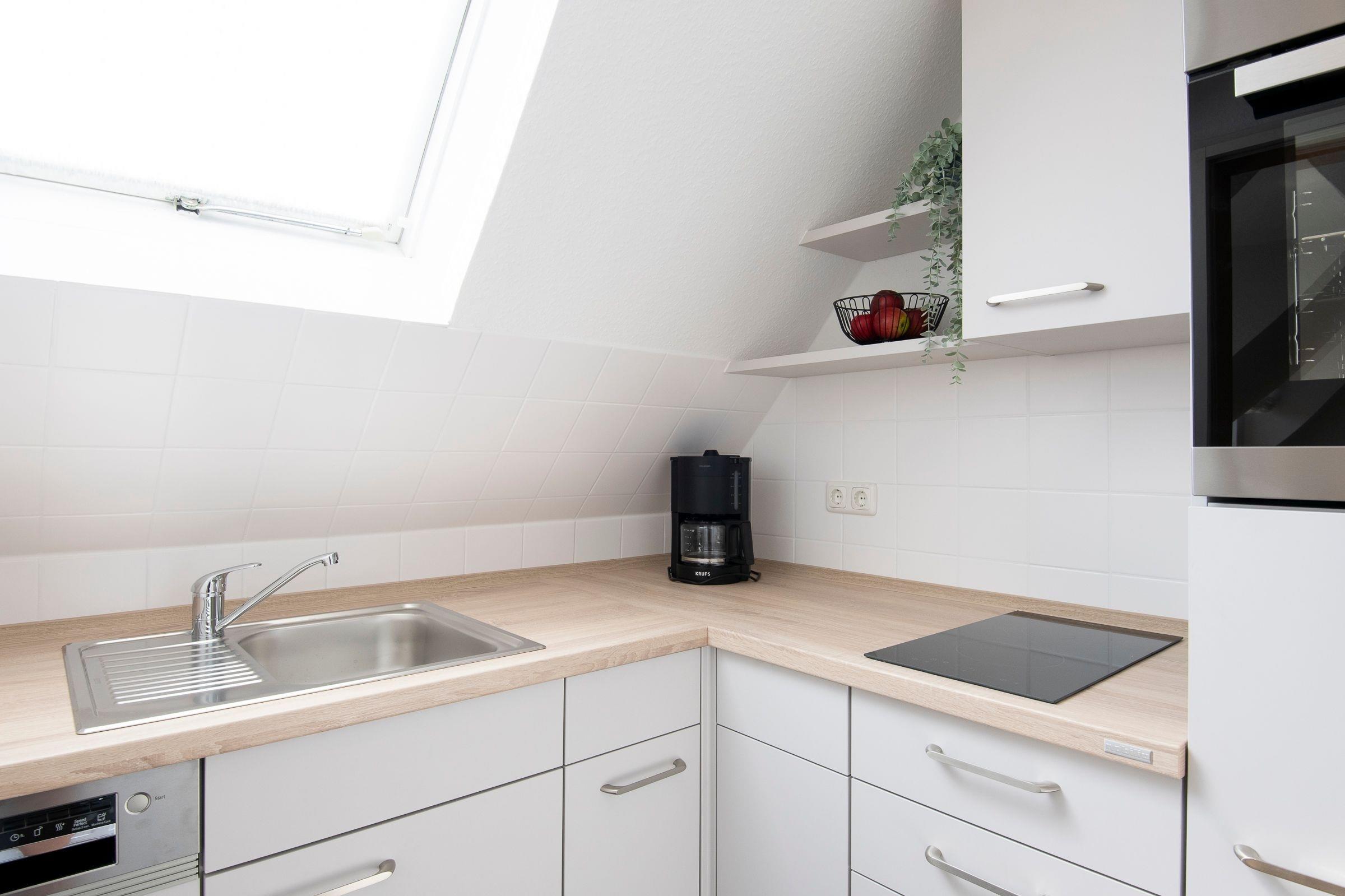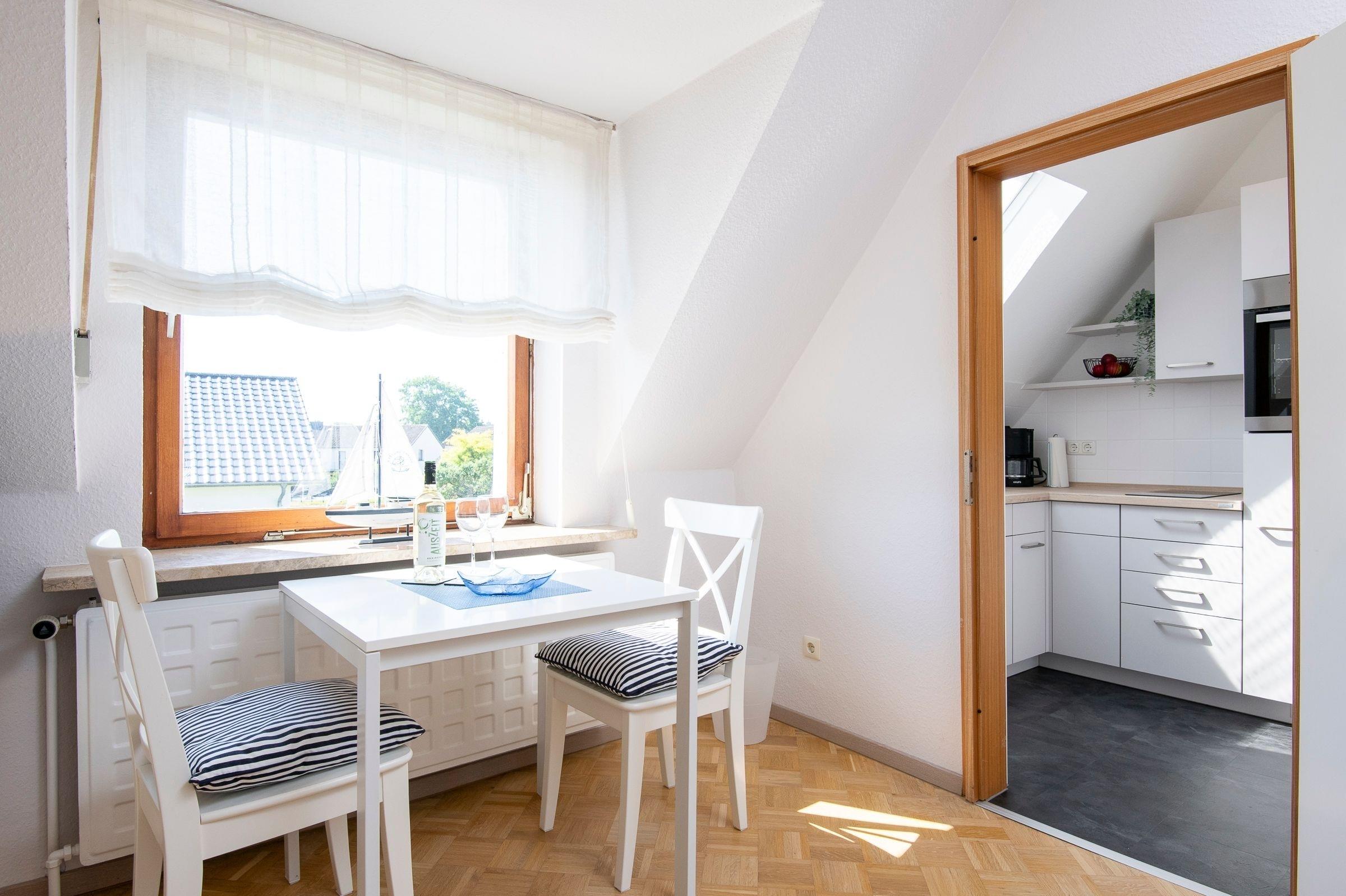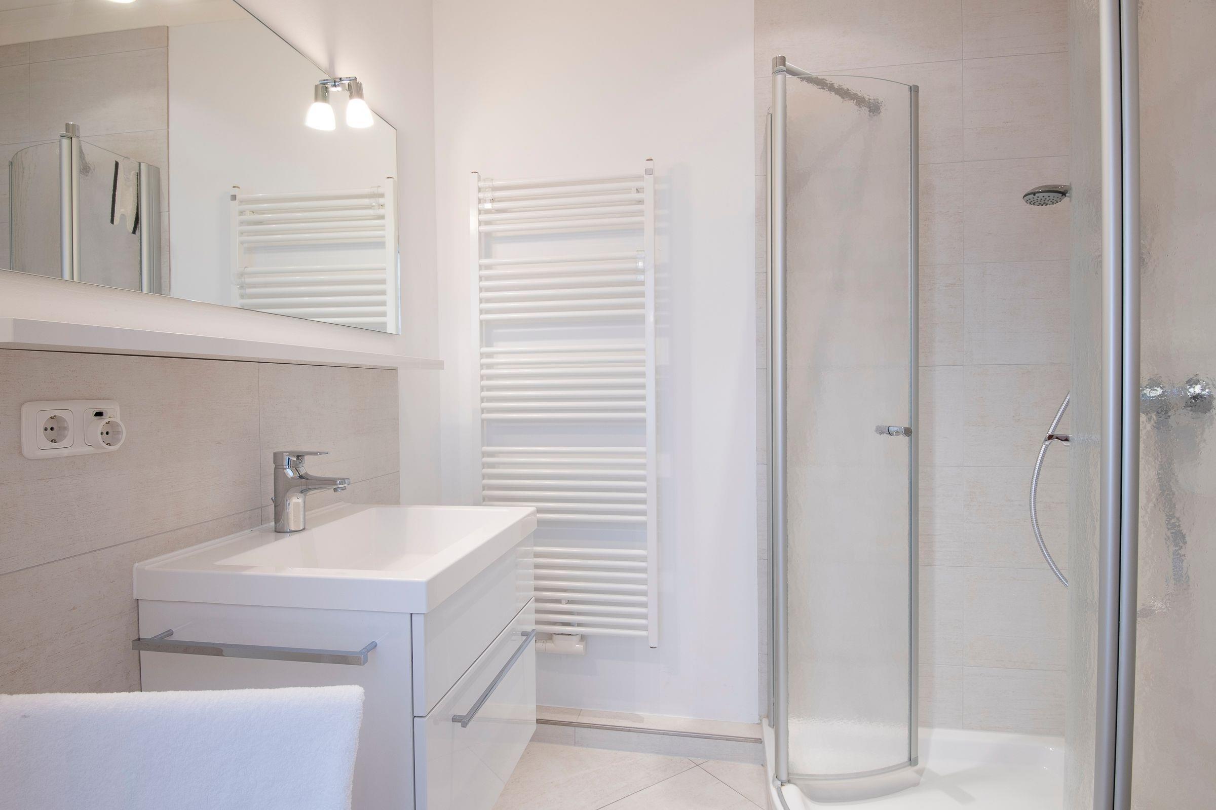 Treten Sie ein in den hellen, modern eingerichteten Wohn- und Schlafraum. Ihre Jacken können Sie direkt an der Garderobe aufhängen und für Ihr Urlaubsgepäck steht ein Kleiderschrank bereit. Den Mittelpunkt dieser Wohnung stellt der kombinierte Wohn- und Schlafbereich mit einem Doppelbett (2x 90x200 cm), zwei Sesseln, einem Flachbildfernseher sowie einem Esstisch mit Platz für 2 Personen dar. Die kleine, separate Küche mit hellen Fronten ist z. B. mit einem Backofen, einem 2-Platten-Cerankochfeld, einem Kühlschrank und einem Geschirrspüler gut ausgestattet. Im hell gefliesten Badezimmer erwartet Sie neben dem WC und der Dusche ein großer Wandspiegel, ein beheizbarer Handtuchhalter sowie Stauraum für Ihre Badutensilien. Der Wohn- und Schlafraum lässt sich zur Nacht mit Außenrollläden angenehm verdunkeln. Der WLAN-Anschluss ist für Sie selbstverständlich inklusive.