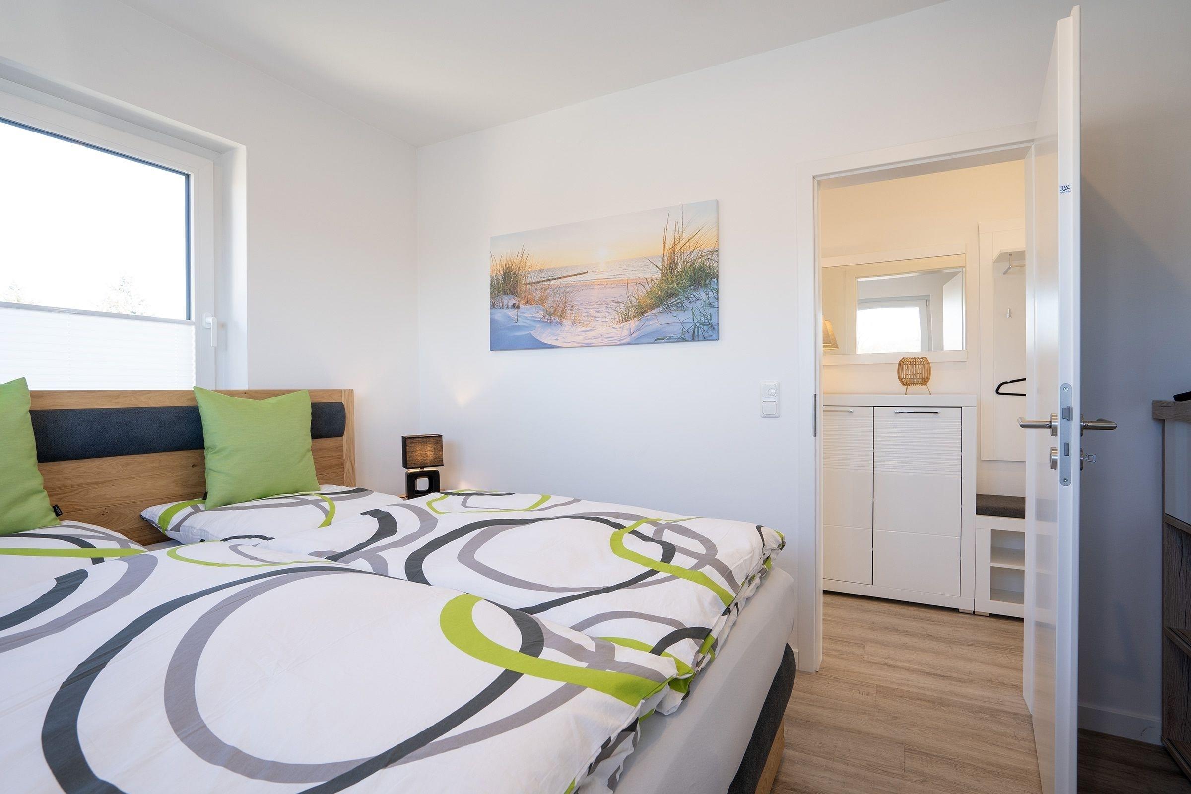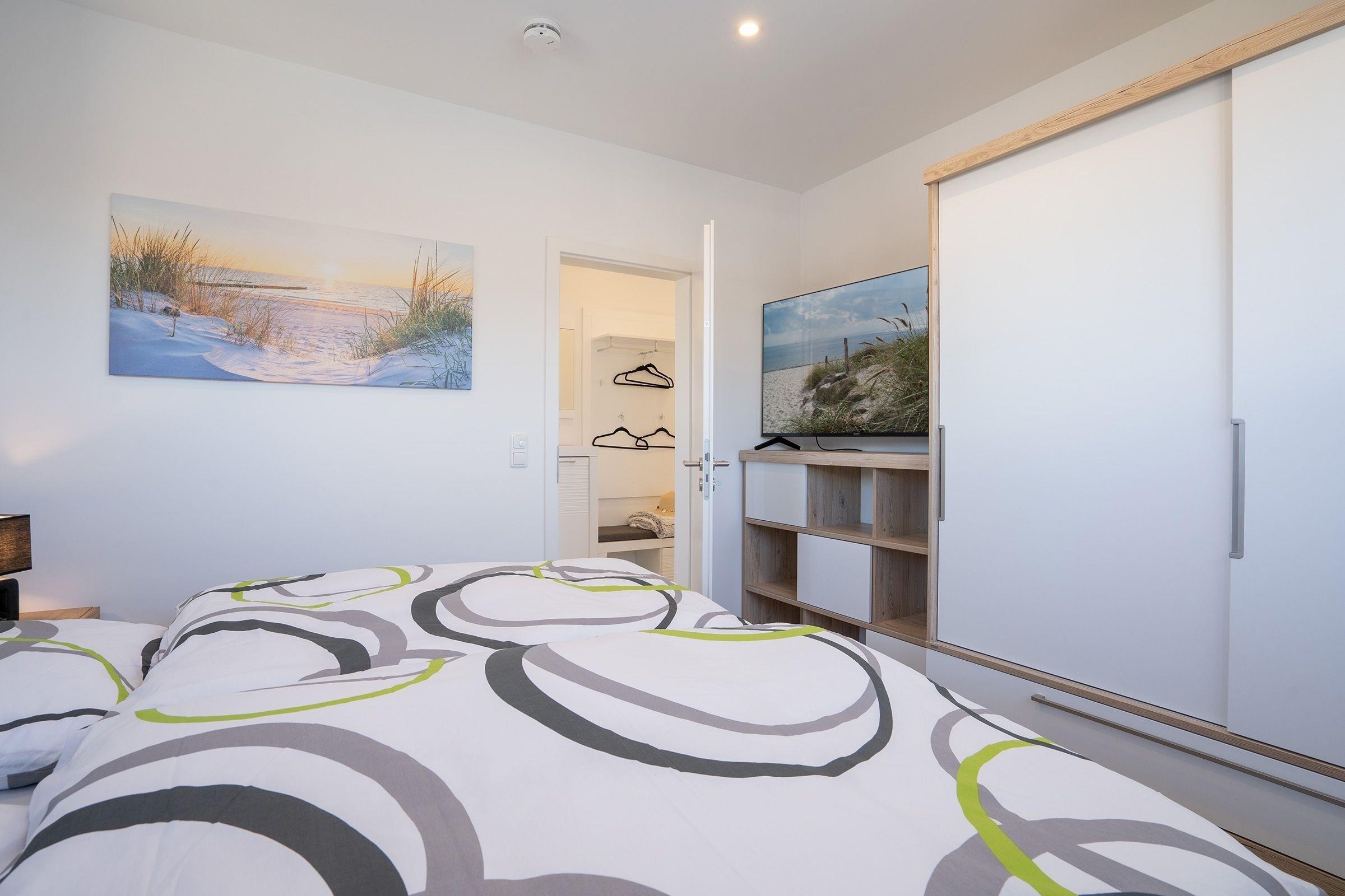 Durch den Flur gelangen Sie in den hellen Wohnbereich. Hier können Sie vor dem Flachbild-TV auf den gemütlichen Sofas entspannen. In der offenen, integrierten Küche, die nahezu alle Annehmlichkeiten bietet, bereiten Sie Ihre Mahlzeiten zu und können diese am angrenzenden Essplatz gemeinsam einnehmen. Als echtes Highlight lädt die schöne Rundum-Dachterrasse mit gleich zwei Sitzbereichen Sie dazu ein, herrliche Sonnenstunden zu verbringen. Im Schlafzimmer befindet sich ein komfortables Boxspringbett (180x200 cm) sowie ein geräumiger Kleiderschrank und ein weiterer TV. Gleich nebenan liegt eines der beiden Badezimmer mit Dusche, Waschtisch und WC. Das Kinderzimmer ist mit 2 Etagenbetten sowie einem Ankleidezimmer ausgestattet und hat einen direkten Zugang in das zweite Duschbad. Alle Zimmer lassen sich zur Nacht angenehm abdunkeln.