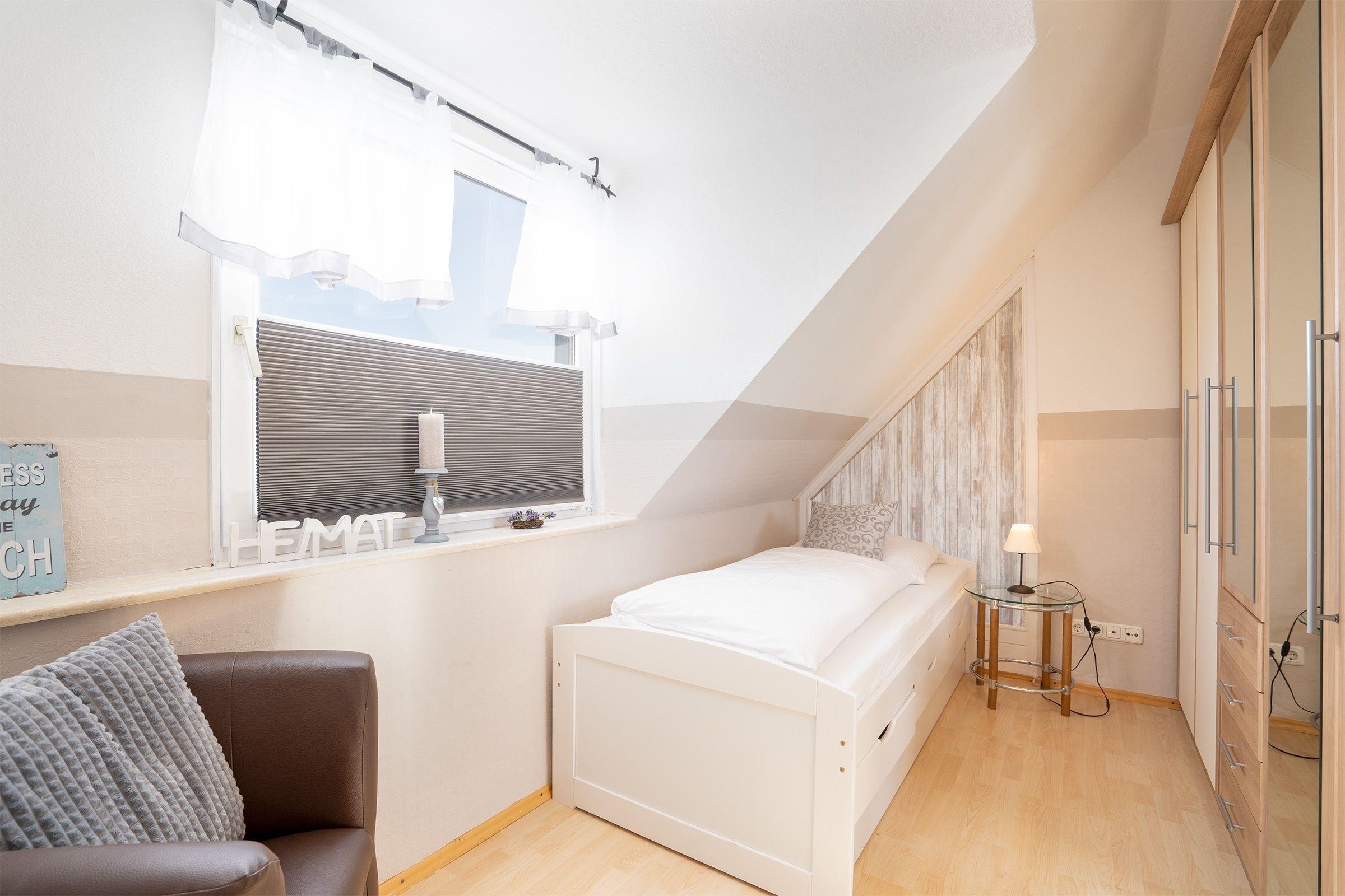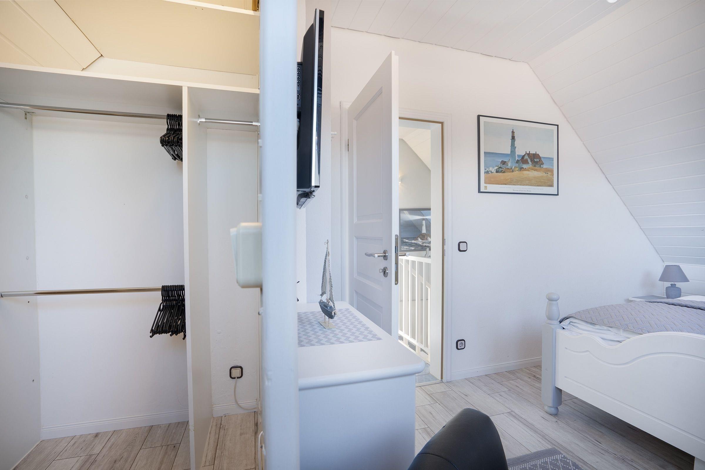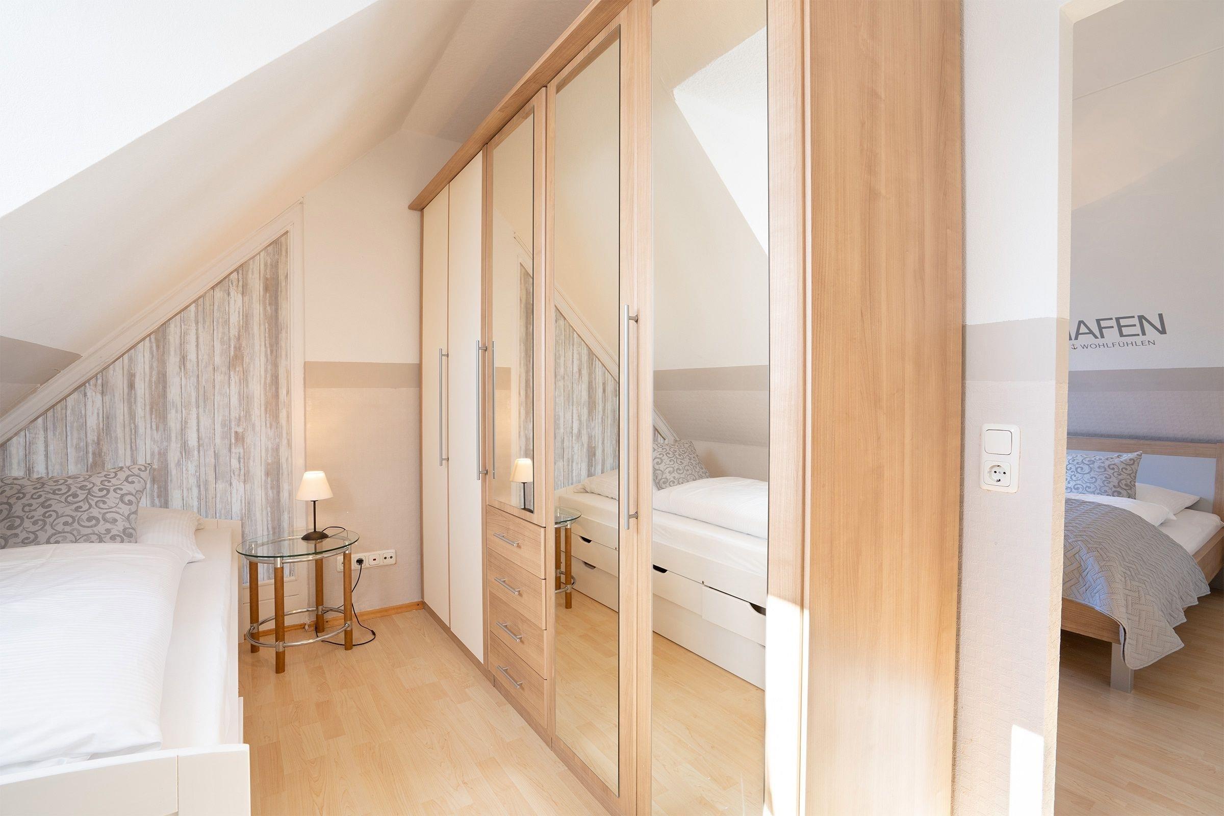 Schlafzimmer 1 im OG: 1 Doppelbett (2x 90x200cm), 1 Einzelbett (90x200cm), Kleiderschrank, TV, Verdunkelung: Plissee, Platz für Babybett vorhanden
