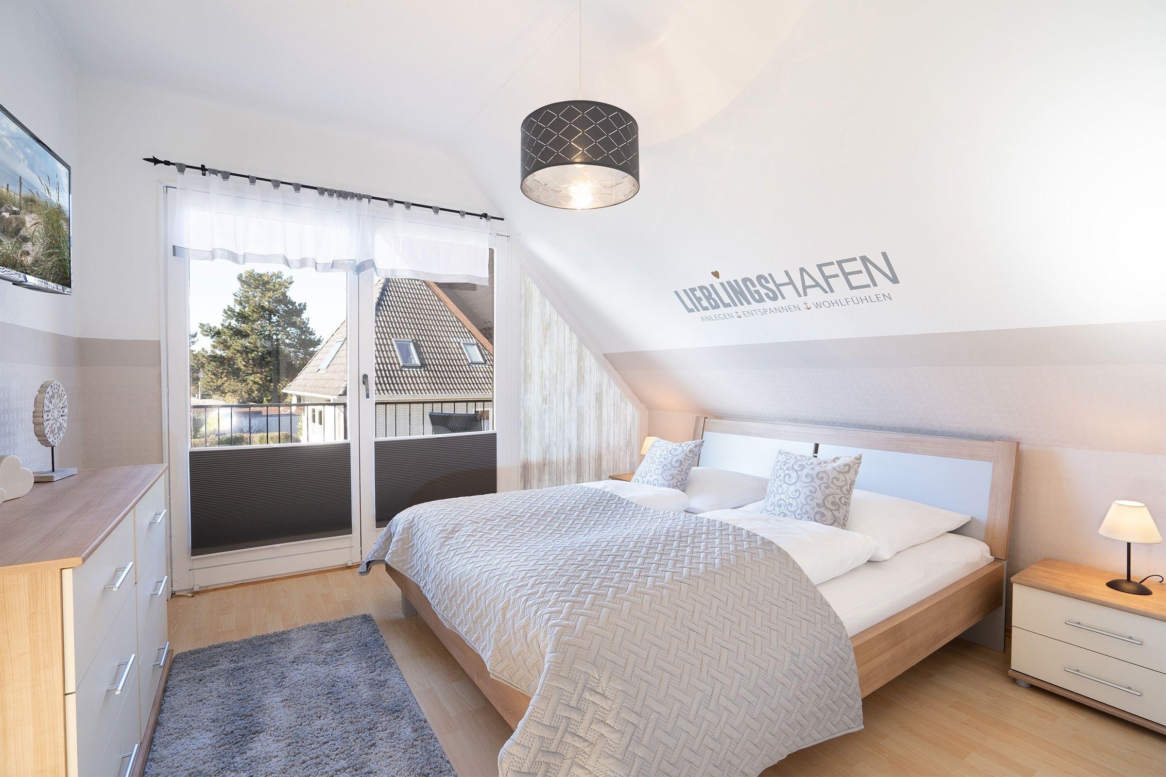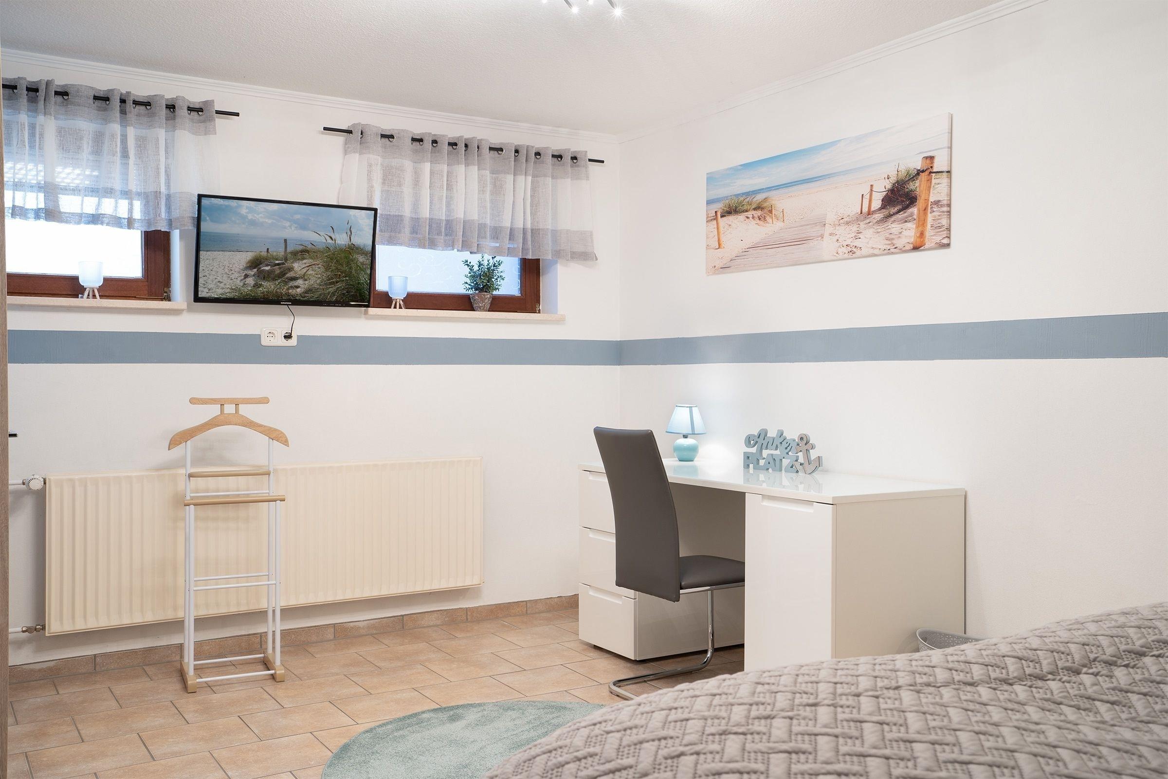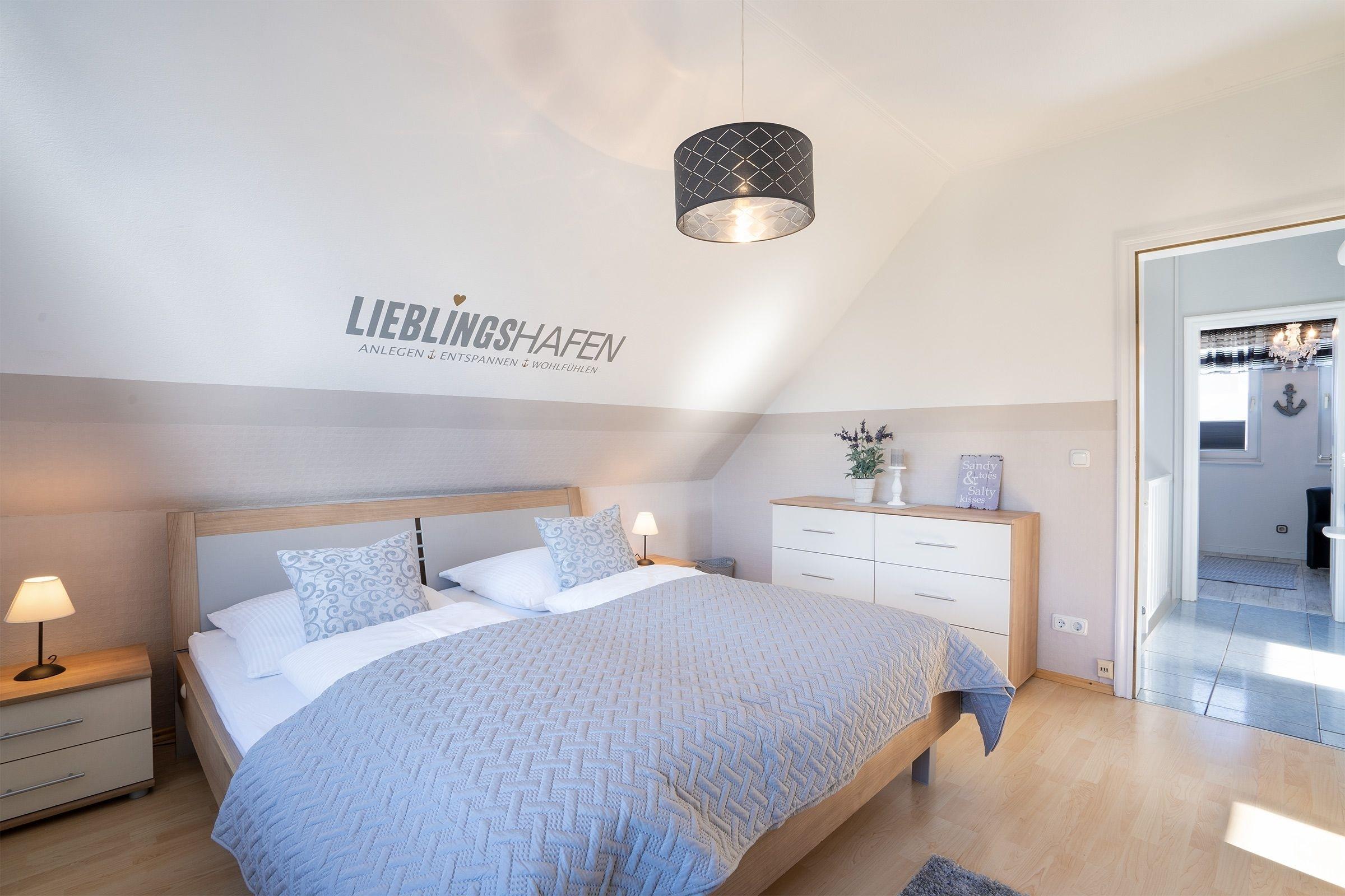 Schlafzimmer 1 im OG: 1 Doppelbett (2x 90x200cm), 1 Einzelbett (90x200cm), Kleiderschrank, TV, Verdunkelung: Plissee, Platz für Babybett vorhanden