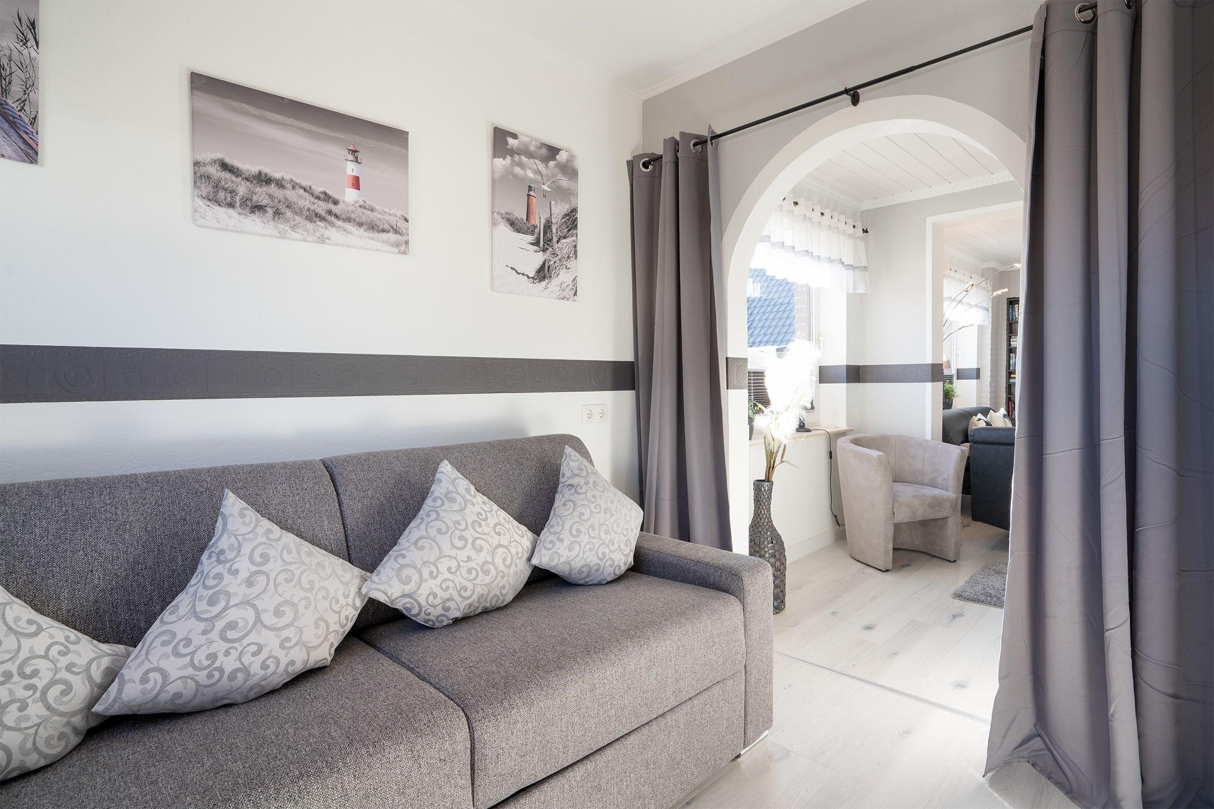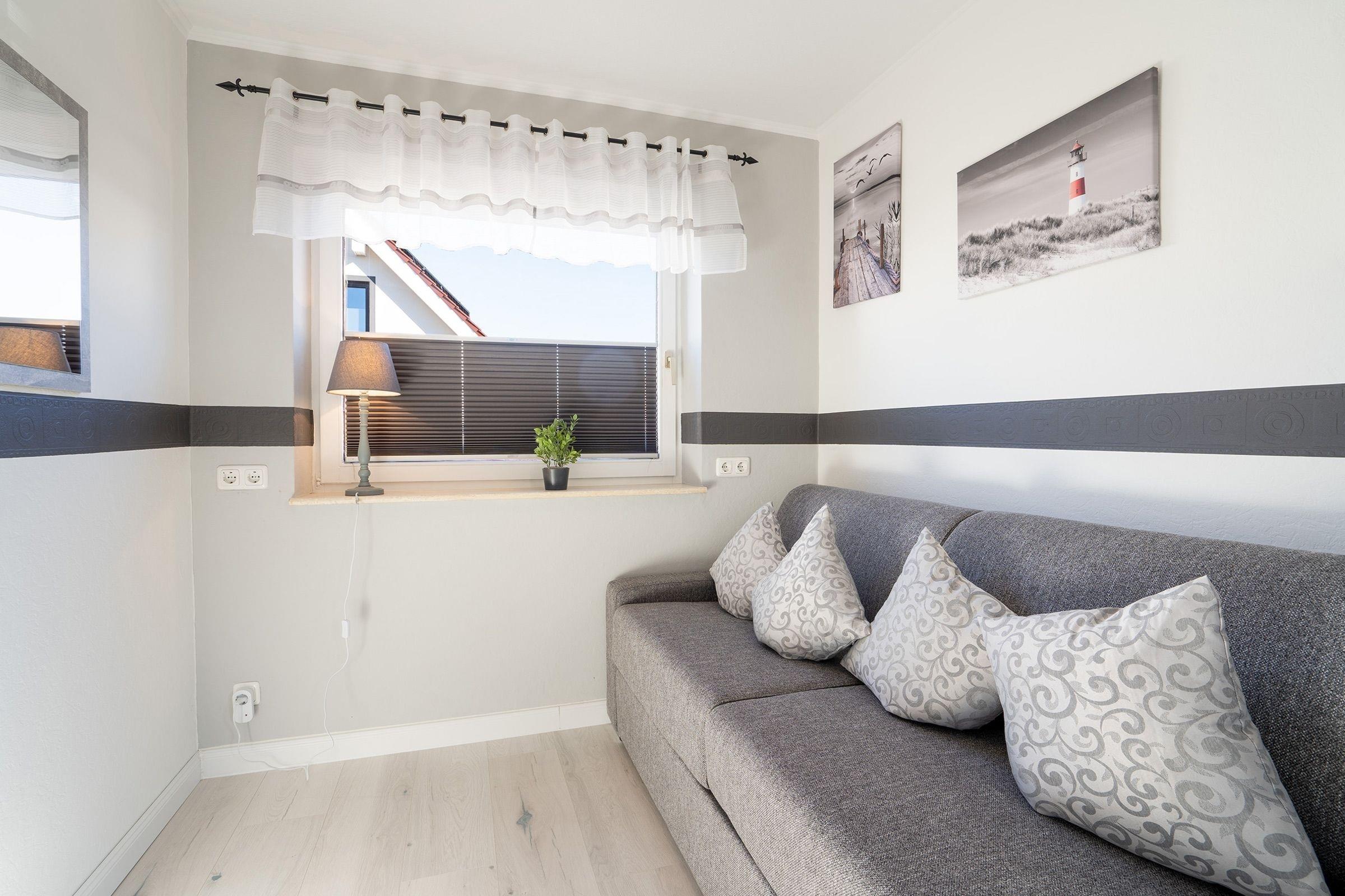 Wohn/Schlafraum im EG: 1 Schlafsofa (160x200 cm), durch einen Vorhang optisch vom Wohnbereich trennbar