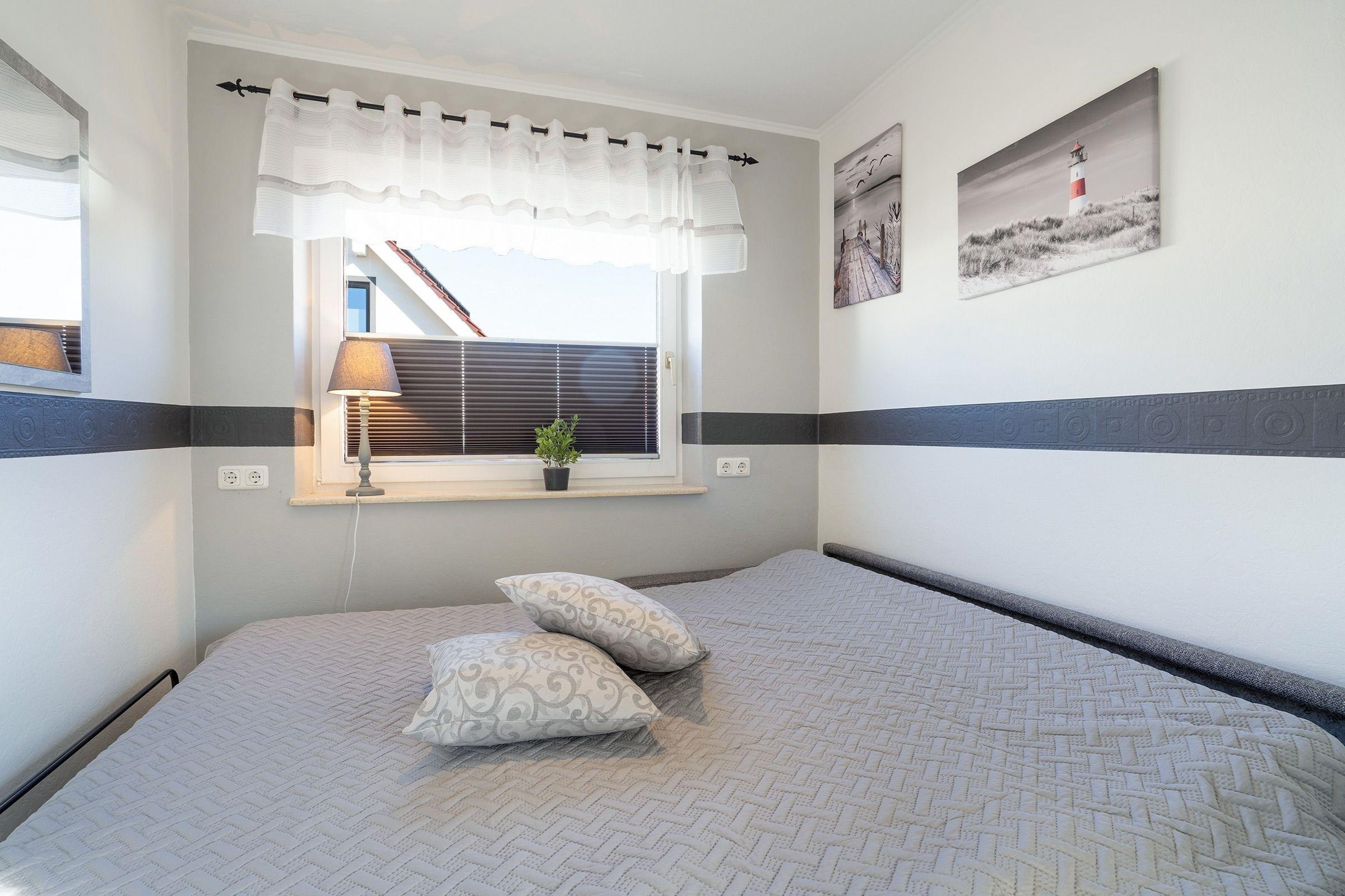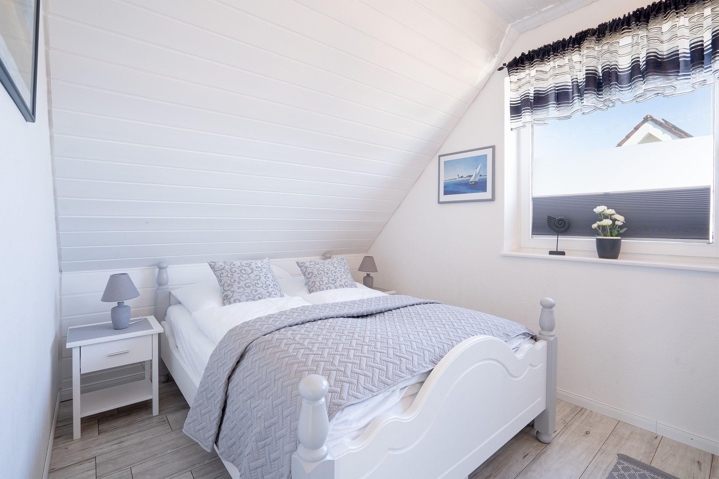Schlafzimmer 2 im OG: 1 Doppelbett (140x200cm), Kleiderschrank, TV, Verdunkelung: Plissee, Platz für Babybett vorhanden