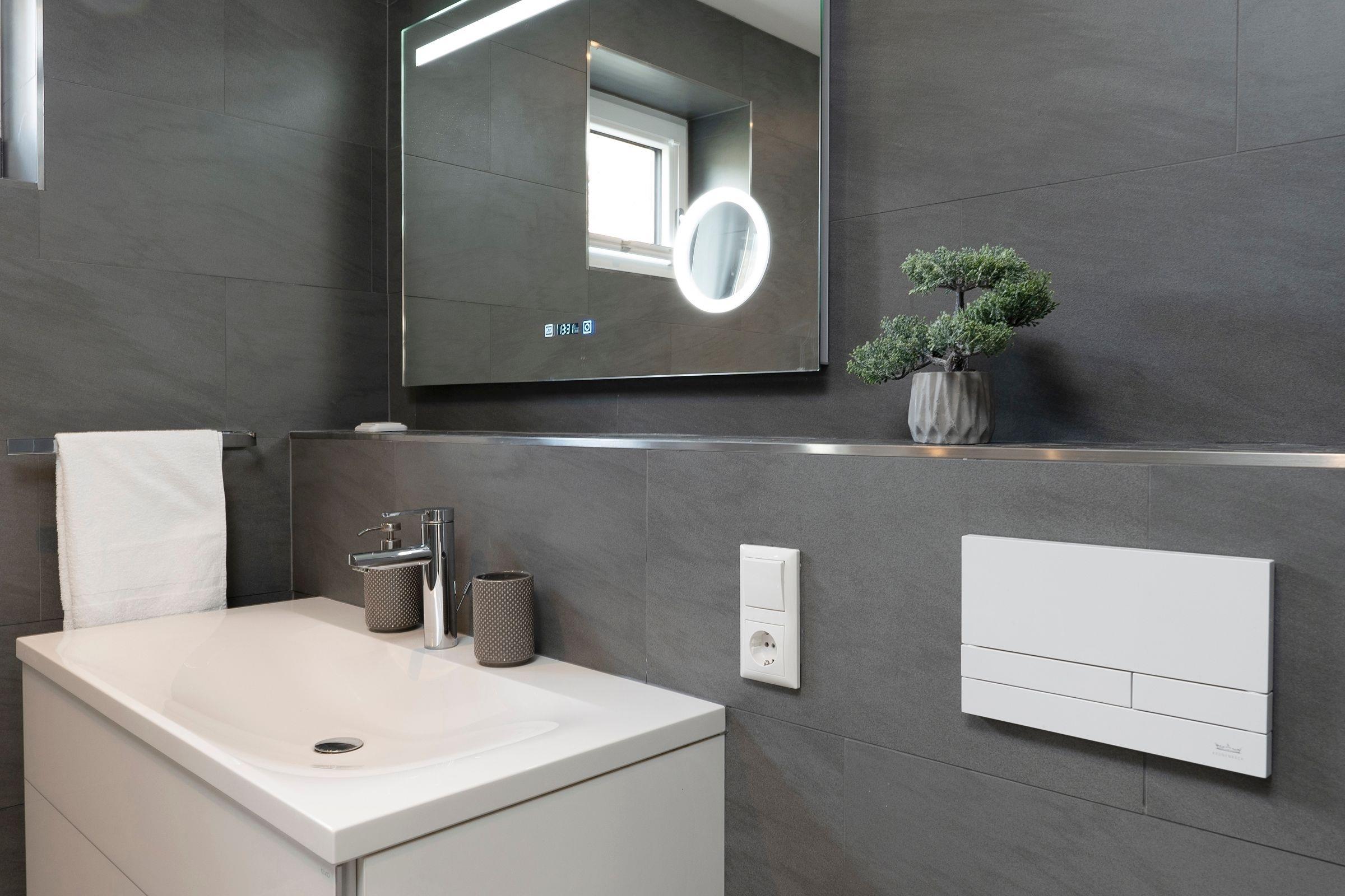Für erholsame Nächte ziehen Sie sich in die separaten Schlafzimmer zurück. Schlafzimmer 1 punktet mit luxuriösem Boxspringbett (180x200cm), TV und Kleiderschrank. In Schlafzimmer 2 können Sie sich in 2 kuschelige Einzelbetten (je 90x200cm) fallen lassen, auch hier verstauen Sie Ihre Urlaubsgarderobe in einem geräumigen Kleiderschrank. Das moderne Badezimmer unterstreicht die geschmackvolle Ausstattung dieser tollen Ferienwohnung.