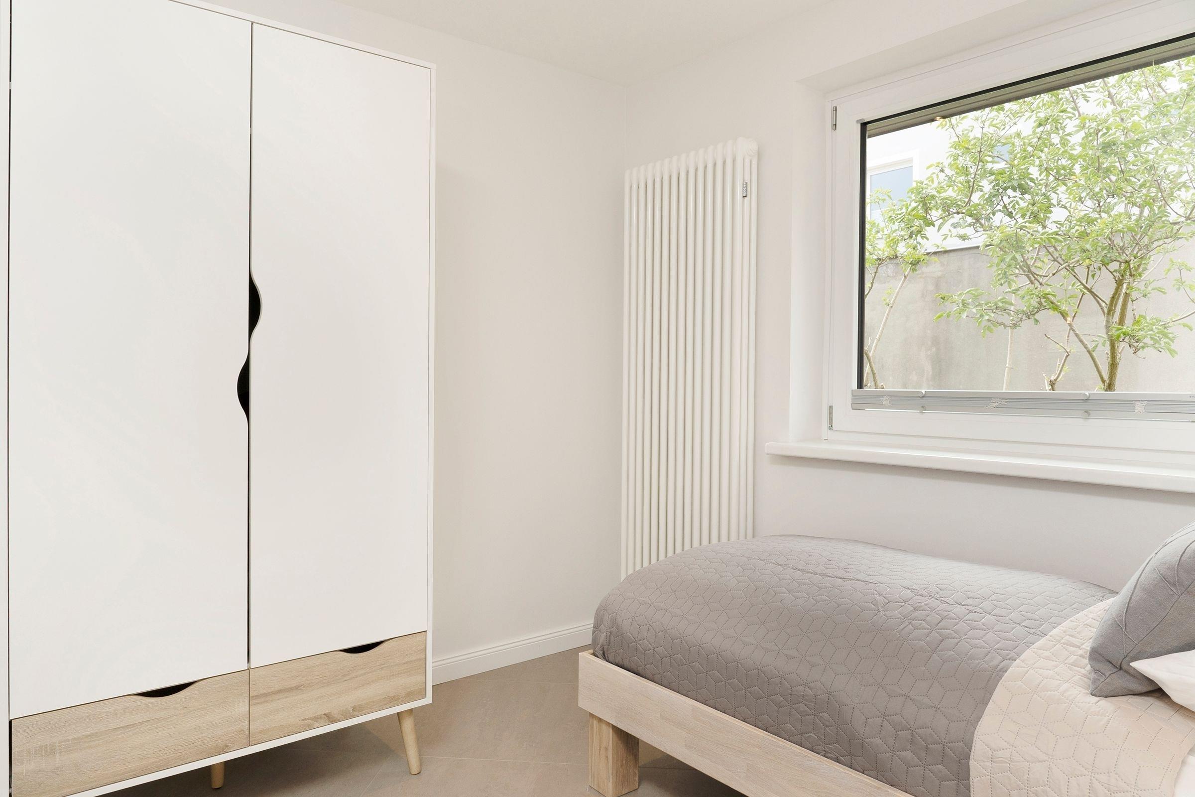 Schlafzimmer 2: 2 Einzelbetten (je 90x200 cm), Kleiderschrank, Verdunkelung (Twin-Line Jalousie), kein Platz für Babybett