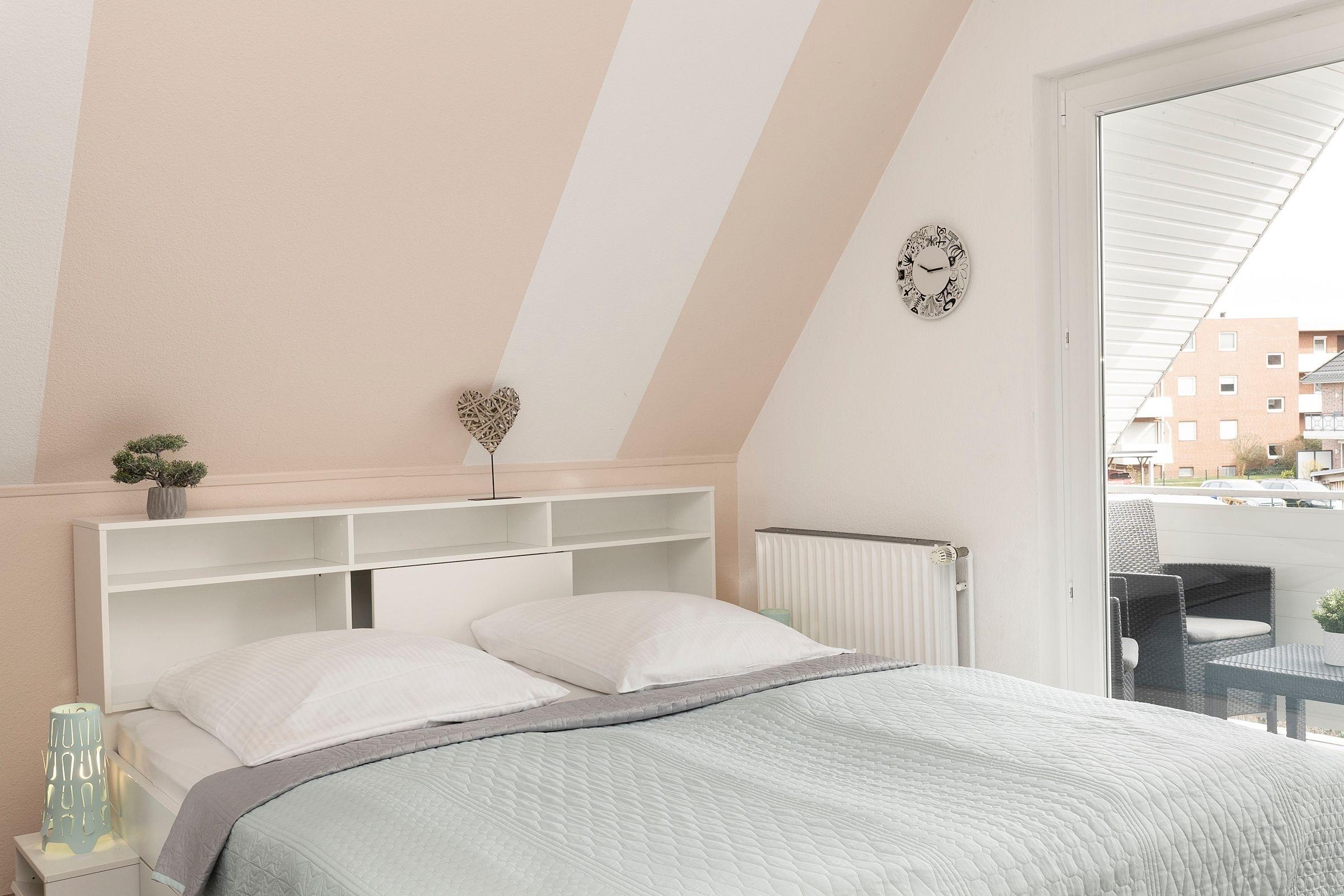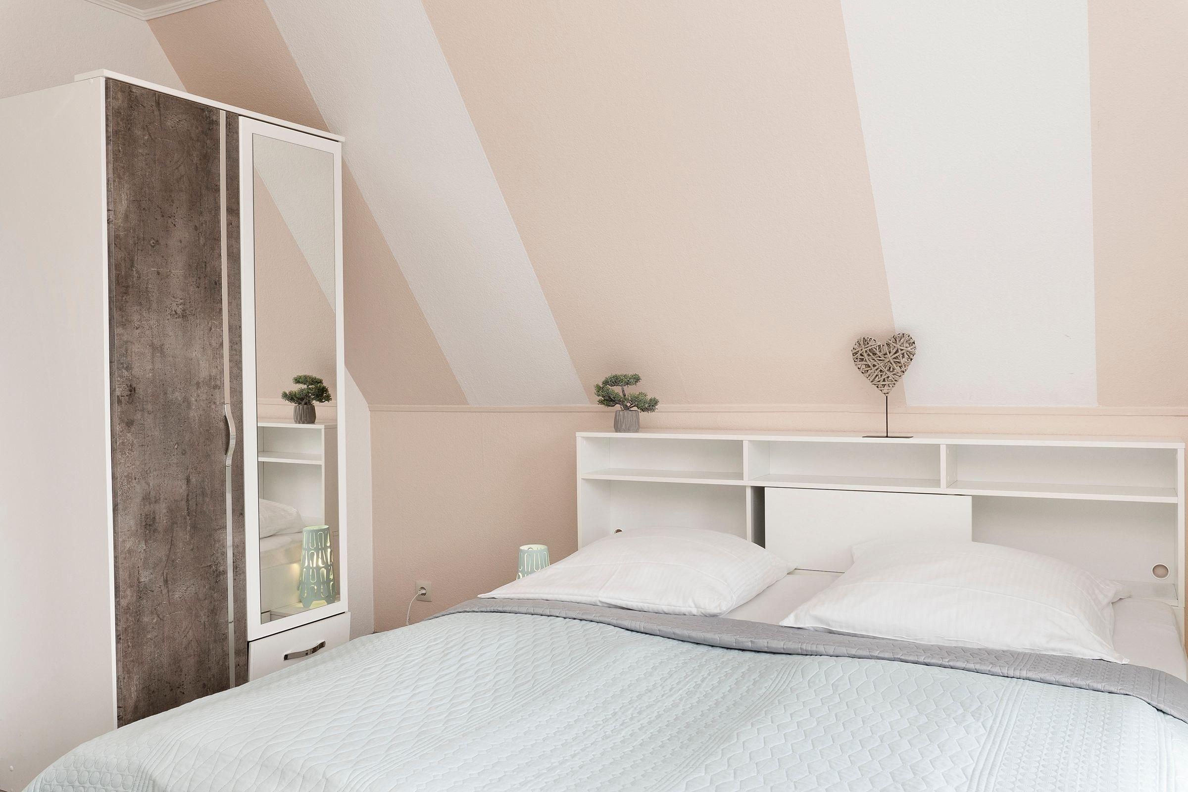 Schlafzimmer 1 im OG: 1 Doppelbett (2 x90x200cm), Kleiderschrank, Verdunkelung: Plissee, Platz für Babybett vorhanden