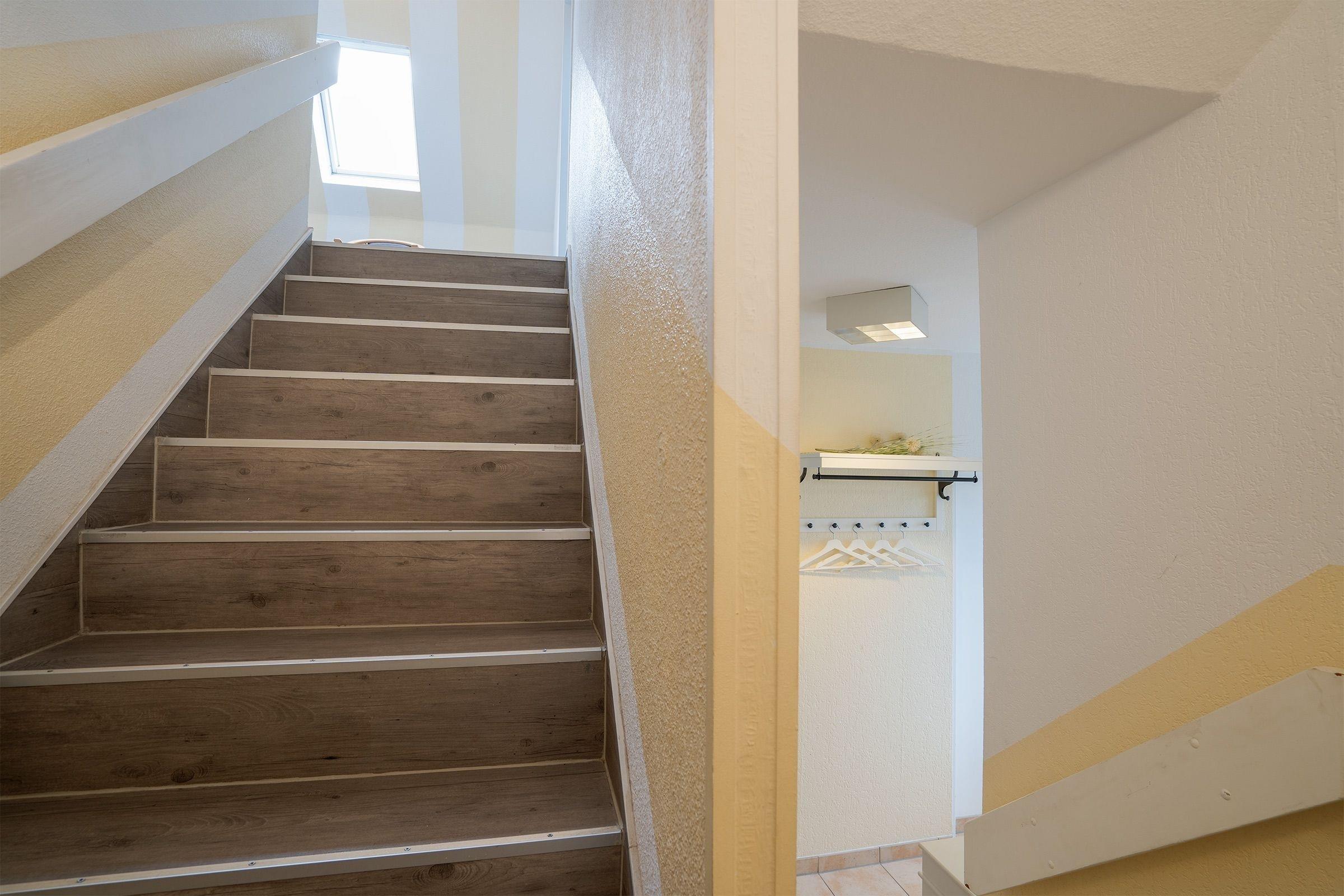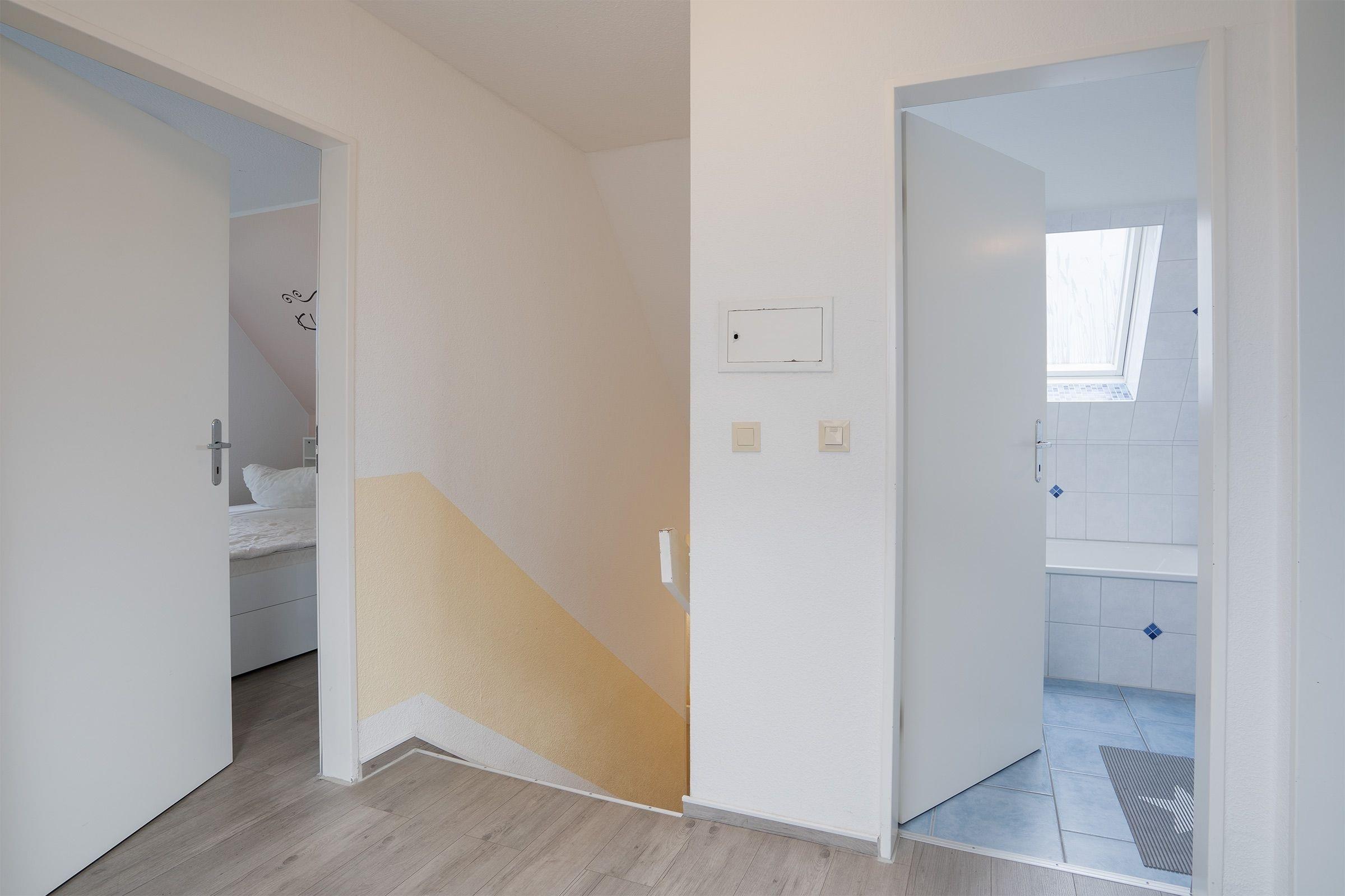 Der geräumige Wohnbereich mit offener Küche bietet genügend Platz für alle Mitreisenden und lädt zu gemeinsamen Spiele- oder TV-Abenden ein. Drei Schlafzimmer und zwei moderne Bäder, eins mit Dusche und das andere mit Badewanne, sorgen für ein Rundumwohlgefühl. Die beiden Schlafzimmer im Obergeschoss verfügen über je ein Doppelbett (2x 90x200cm). Weitere Schlafplätze bietet das Schlafzimmer im Erdgeschoss mit zwei Einzelbetten (je 100x200cm). Vom Schlafzimmer in der 1.Etage gelangen Sie auf den überdachten Balkon. Außerdem verfügt dieses Ferienhaus über eine großzügige Südost-Terrasse mit Gartenmöbeln und Lounge-Bereich, der perfekte Ort, um einen ereignisreichen Urlaubstag bei einem Glas Wein ausklingen zu lassen.