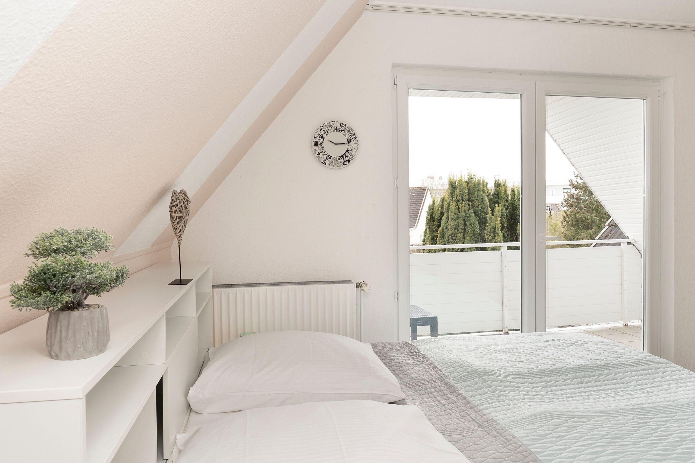 Schlafzimmer 3 im EG: 2 Einzelbetten (je 100x200cm), Kleiderschrank, Verdunkelung: Plissee & Verdunkelung
